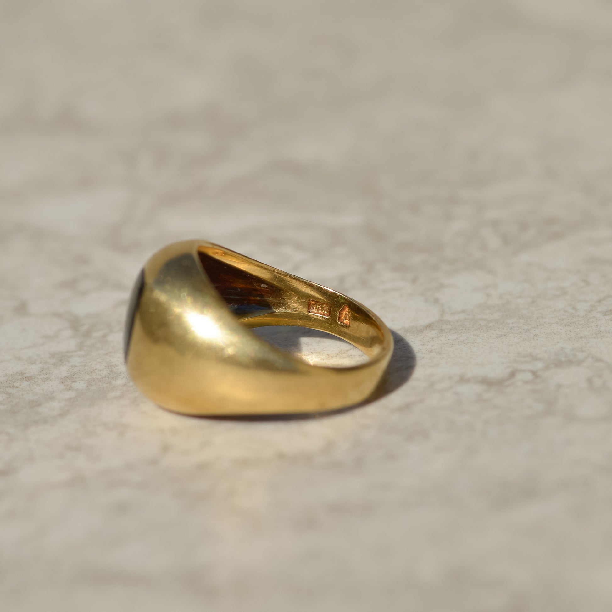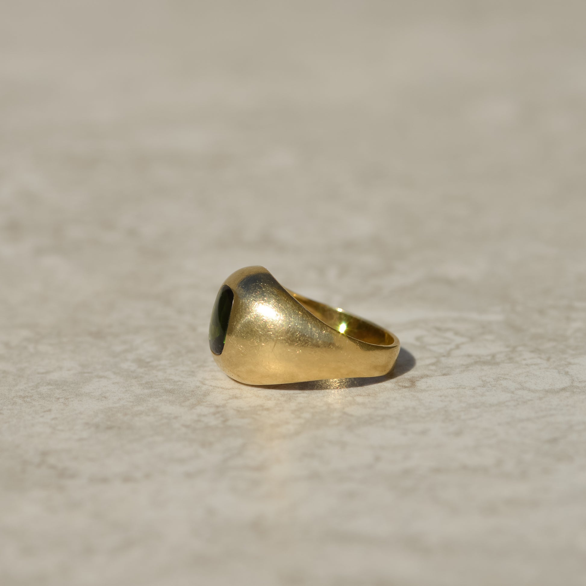 A bold, buttery dome ring set with a buff-top cut dark green tourmaline. We love the use of this stone cut in this ring: with the flush setting, the cabochon cut top fits seamlessly into the dome design, while the bottom facets add interest and intrigue. 13 mm wide front, tapers to 3.5 mm in back.