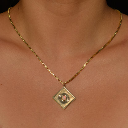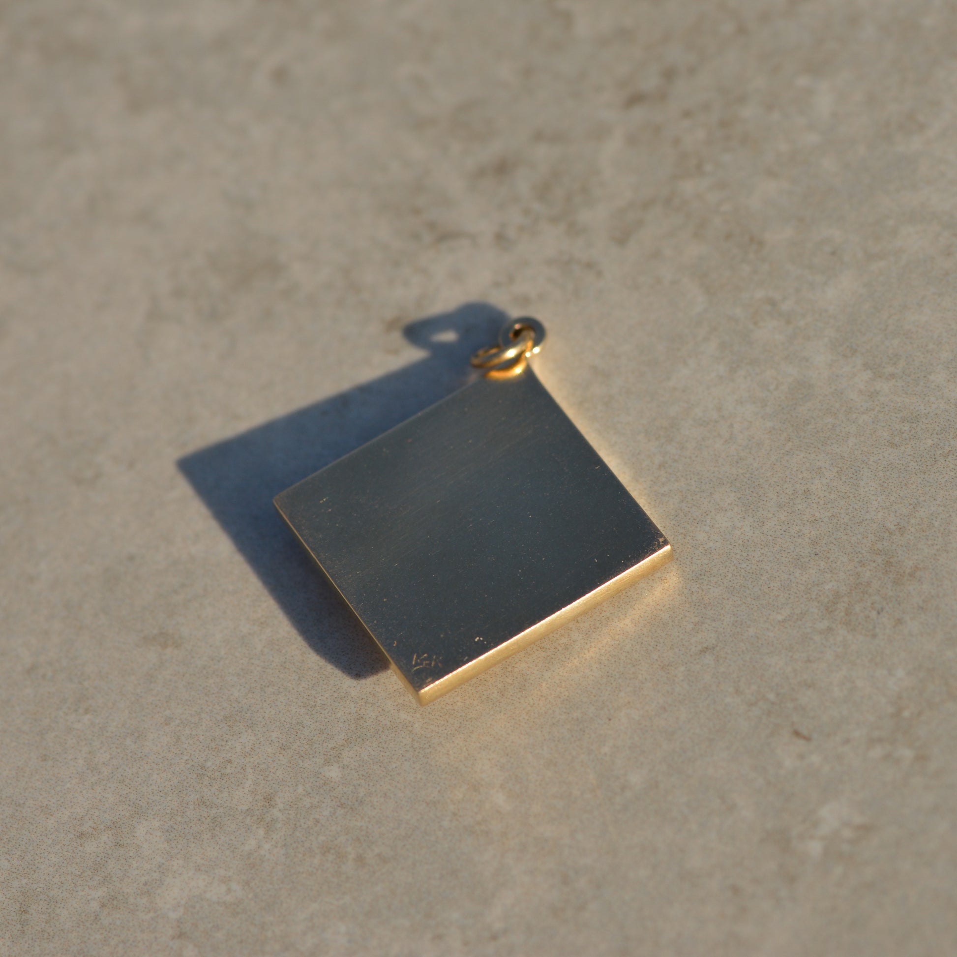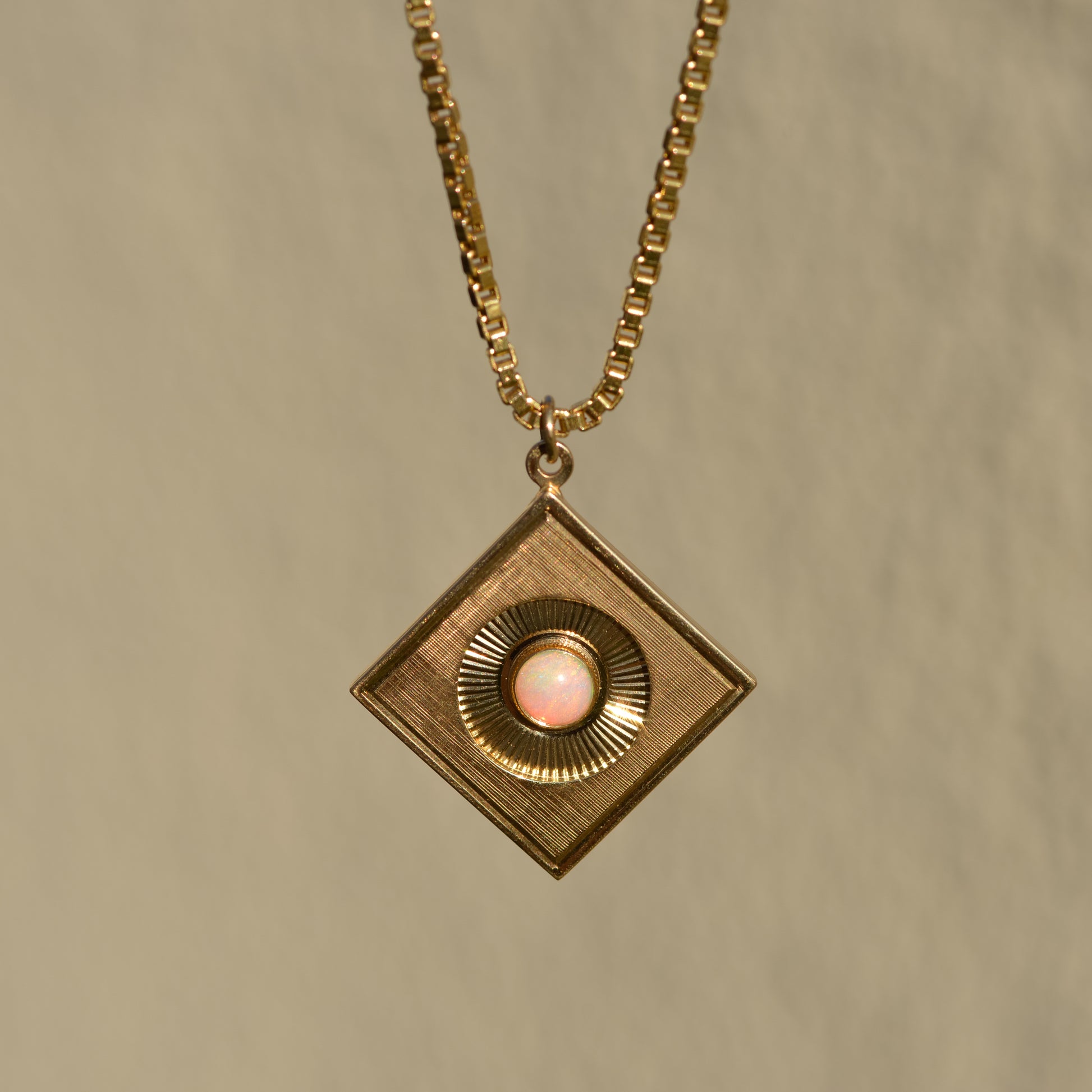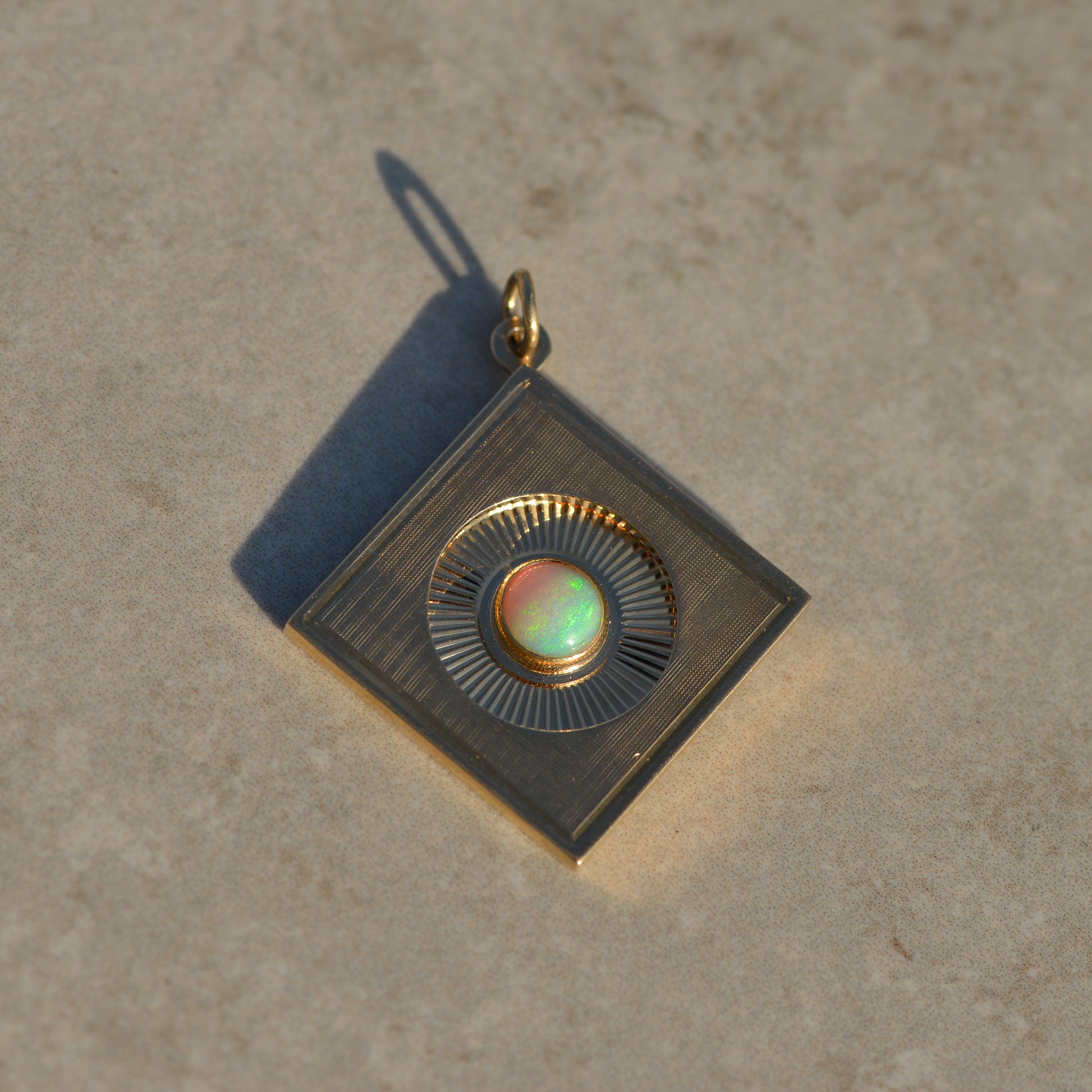 A large square pendant with a combination of textures that catch the light beautifully, with an opal cabochon in the center.