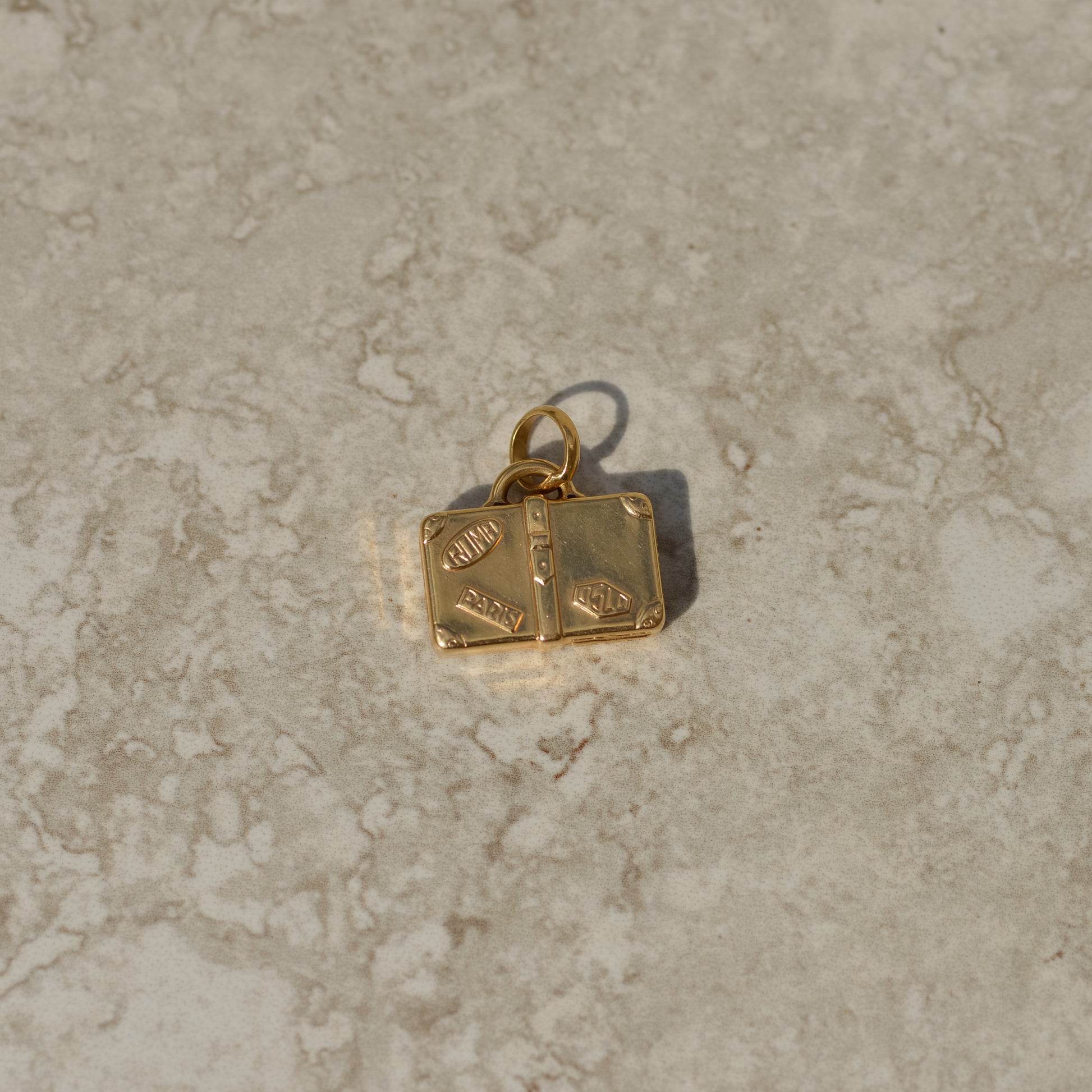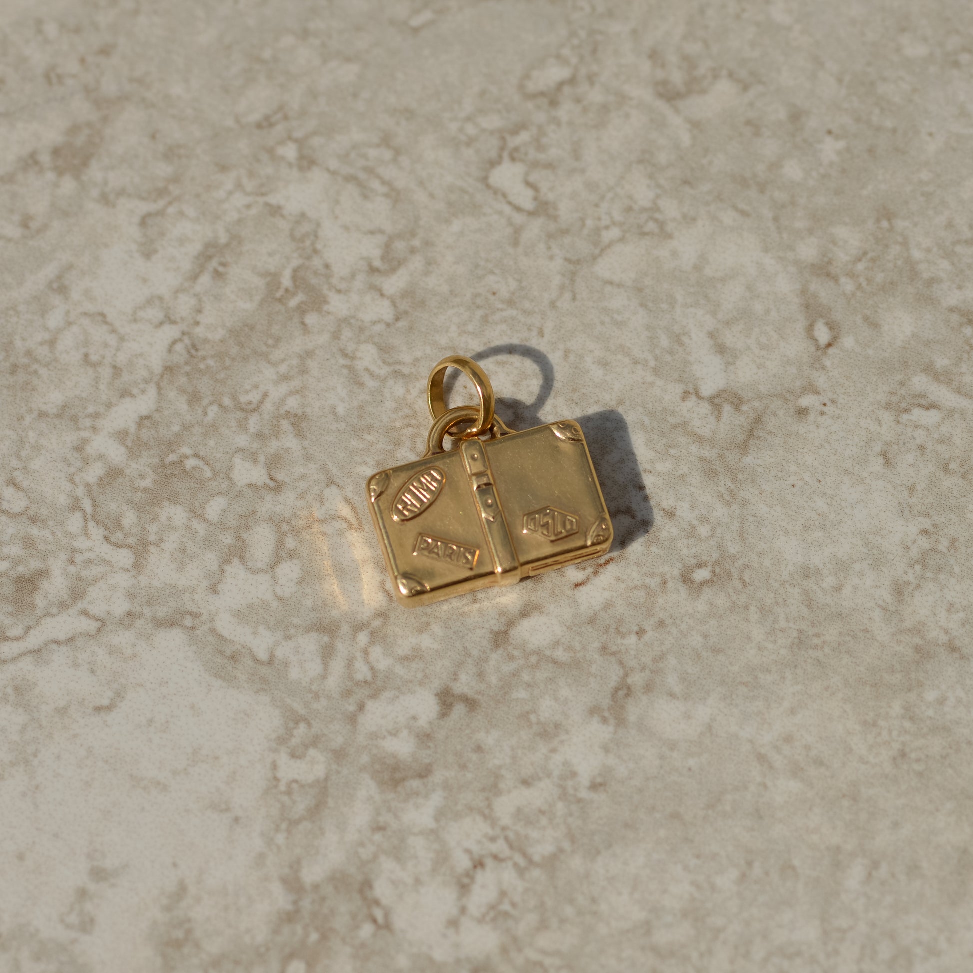 Vintage suitcase 3D charm with "stickers" for Paris, Roma, and Oslo. Design is on both sides.
