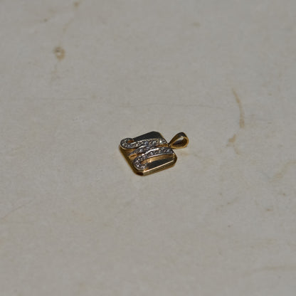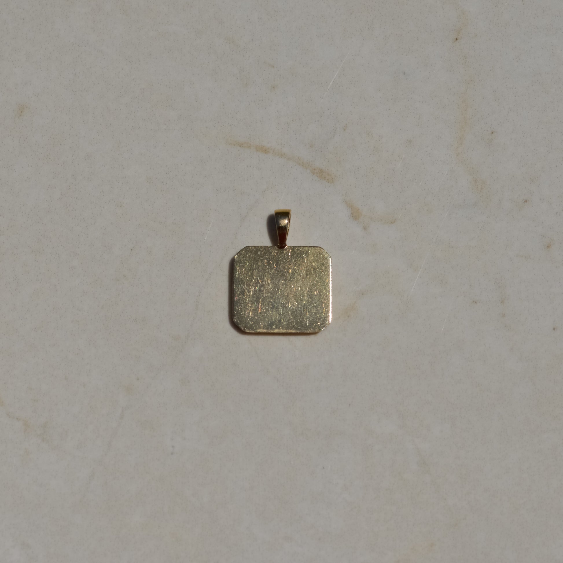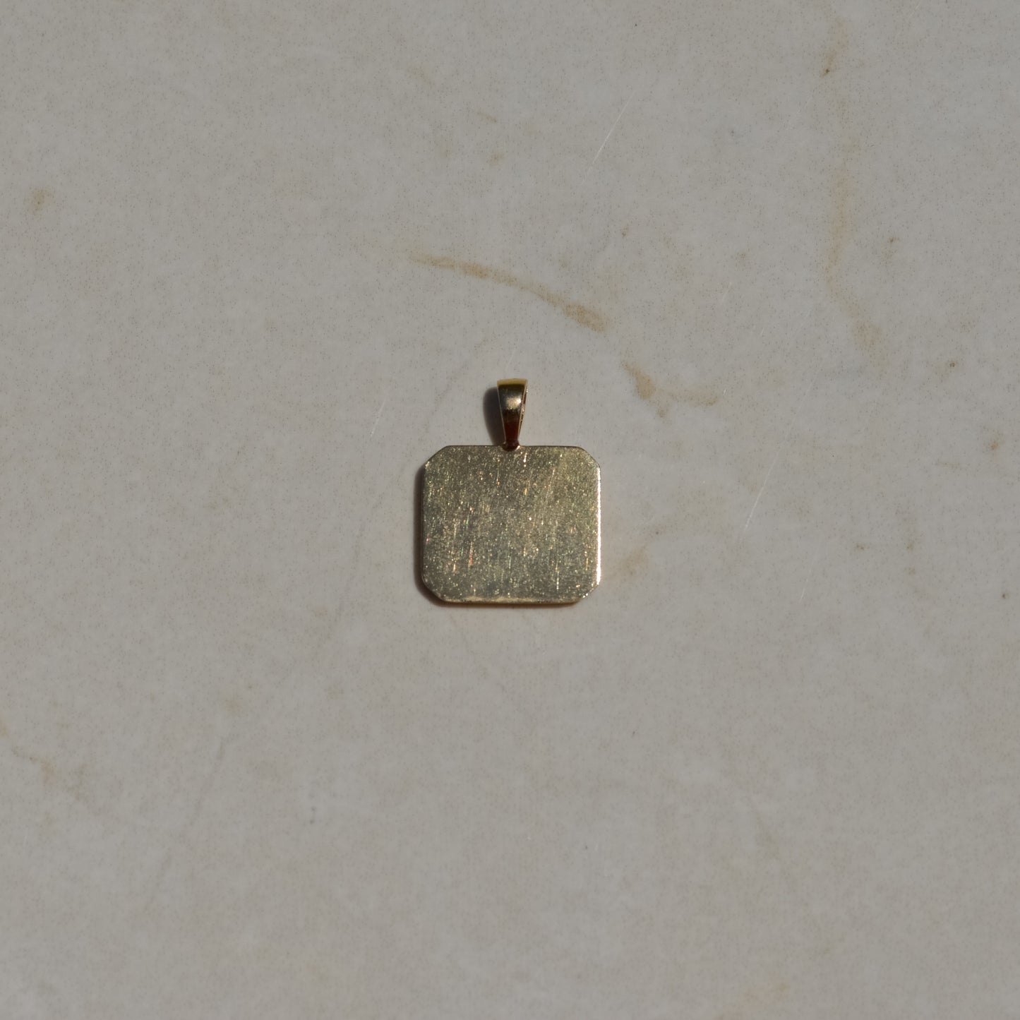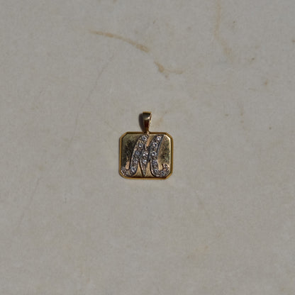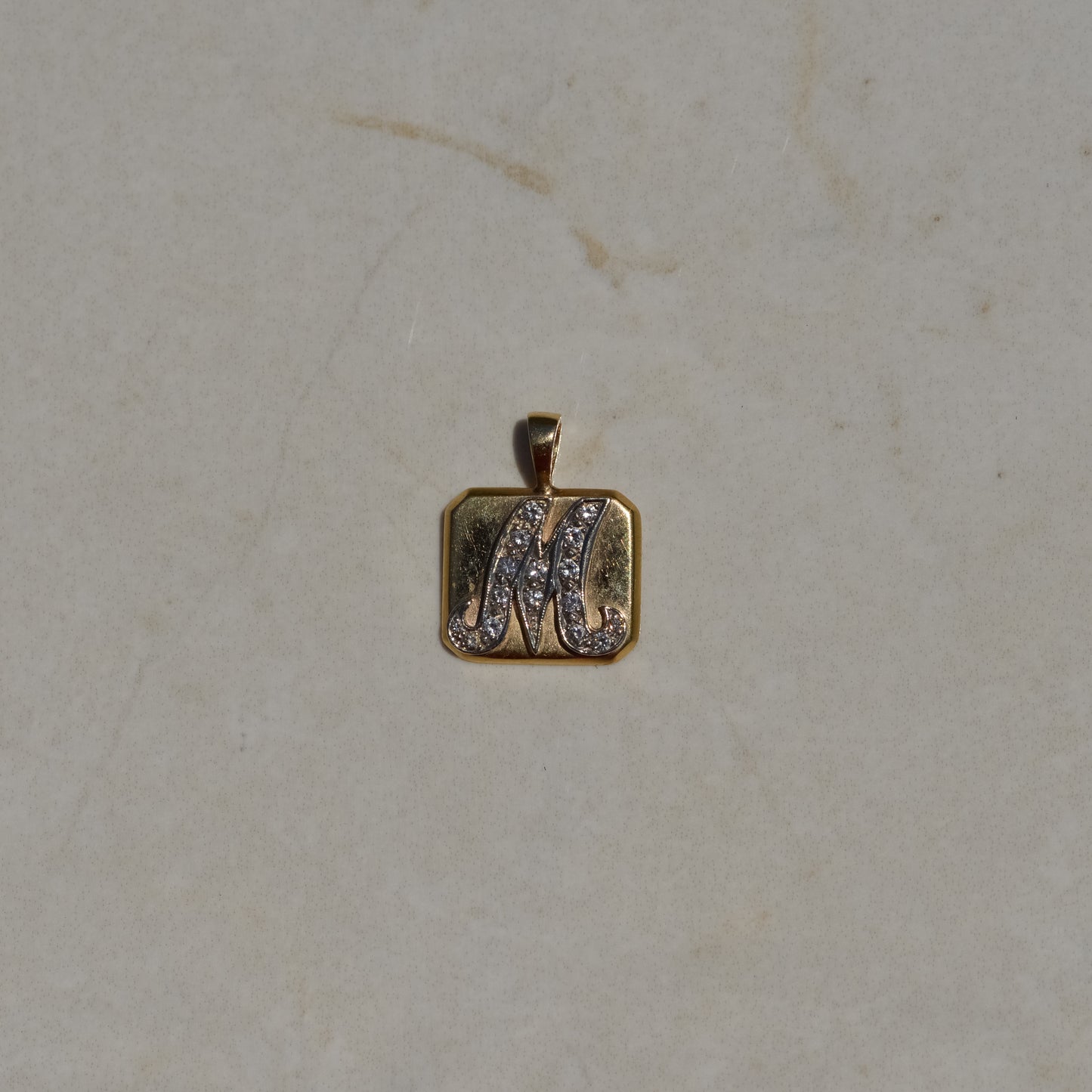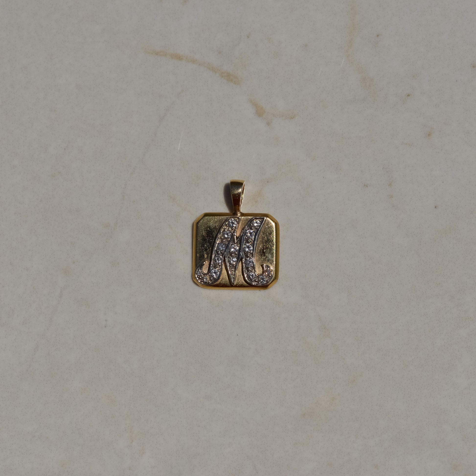 Vintage tablet-shaped charm with a cursive M in white gold, set with pavé diamonds.
