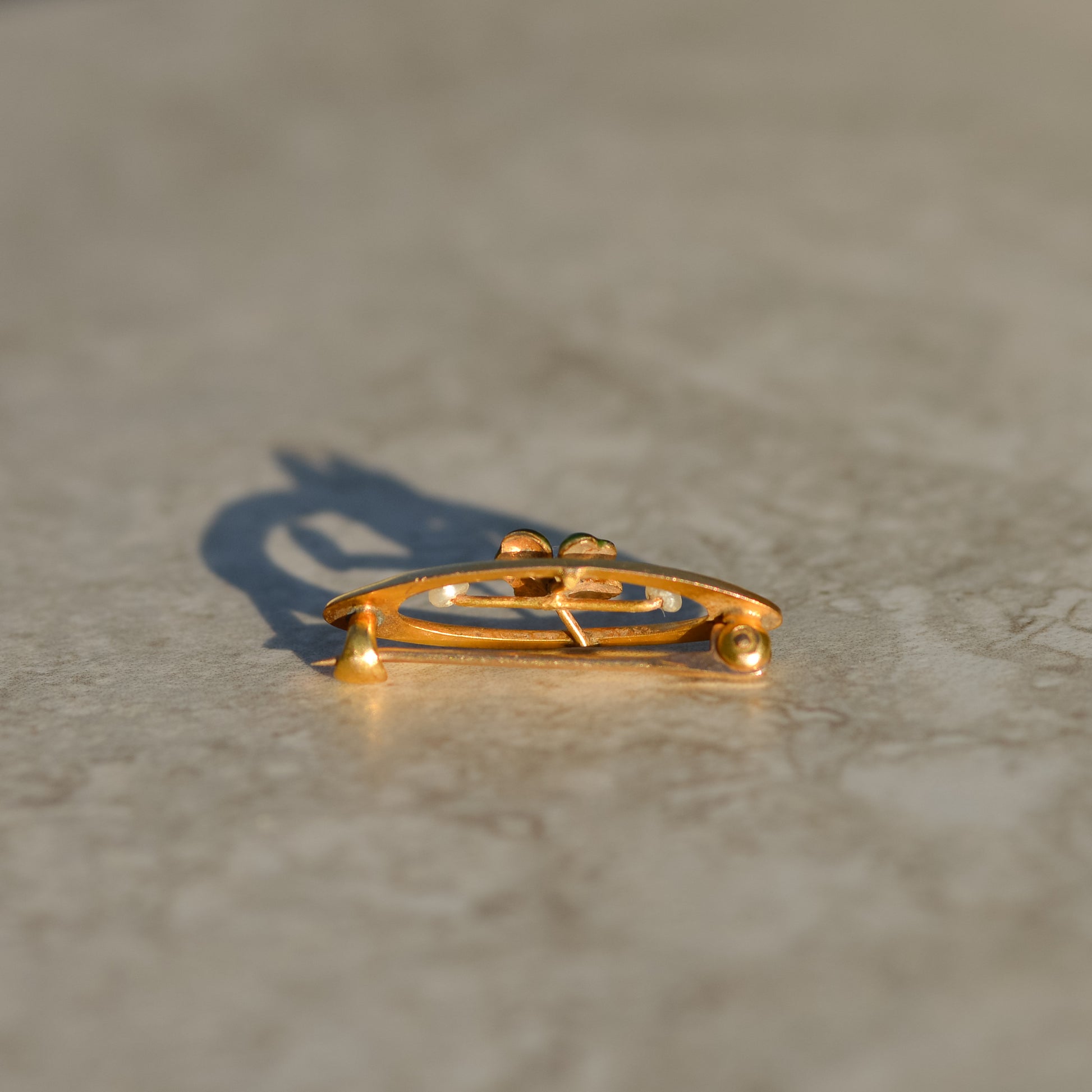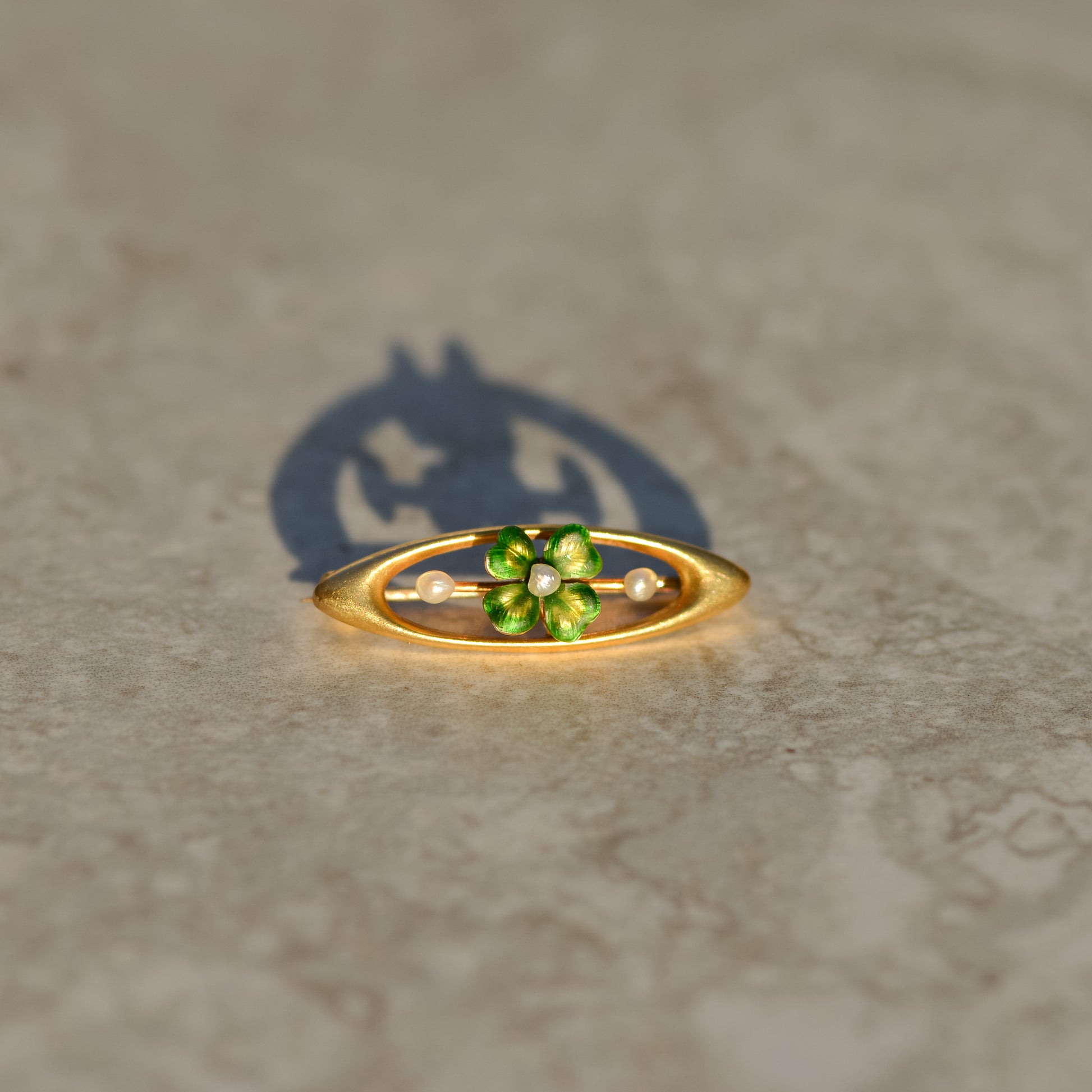 An adorable little antique pin with an enameled four-leaf clover, accented with seed pearls. Small pins such as these were used to secure lingerie straps to outer garments to prevent the scandalous exposure of a lingerie strap, used from the Victorian era to the 1920s.