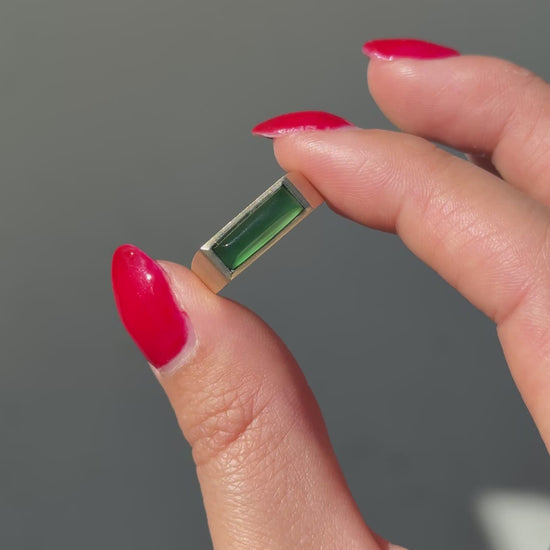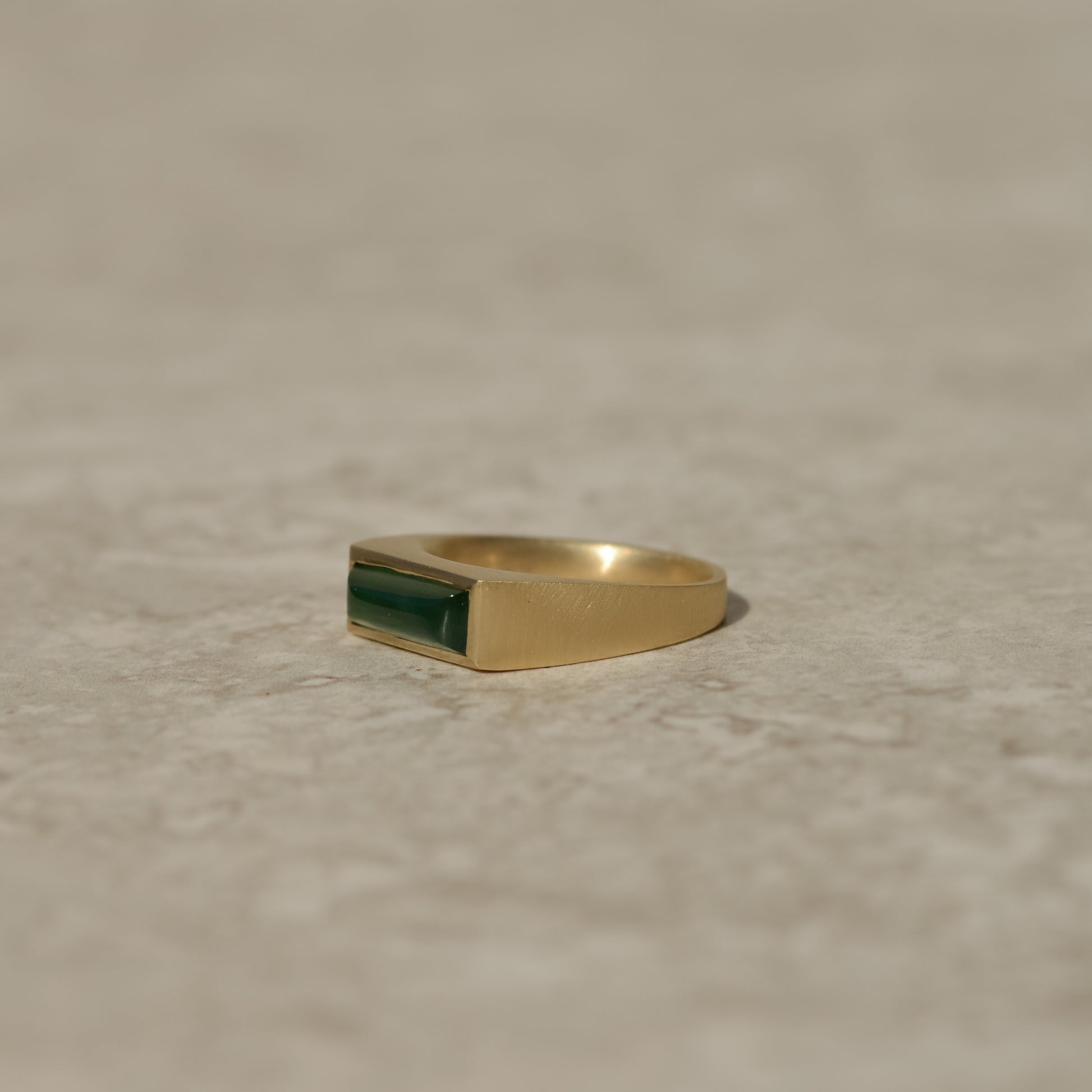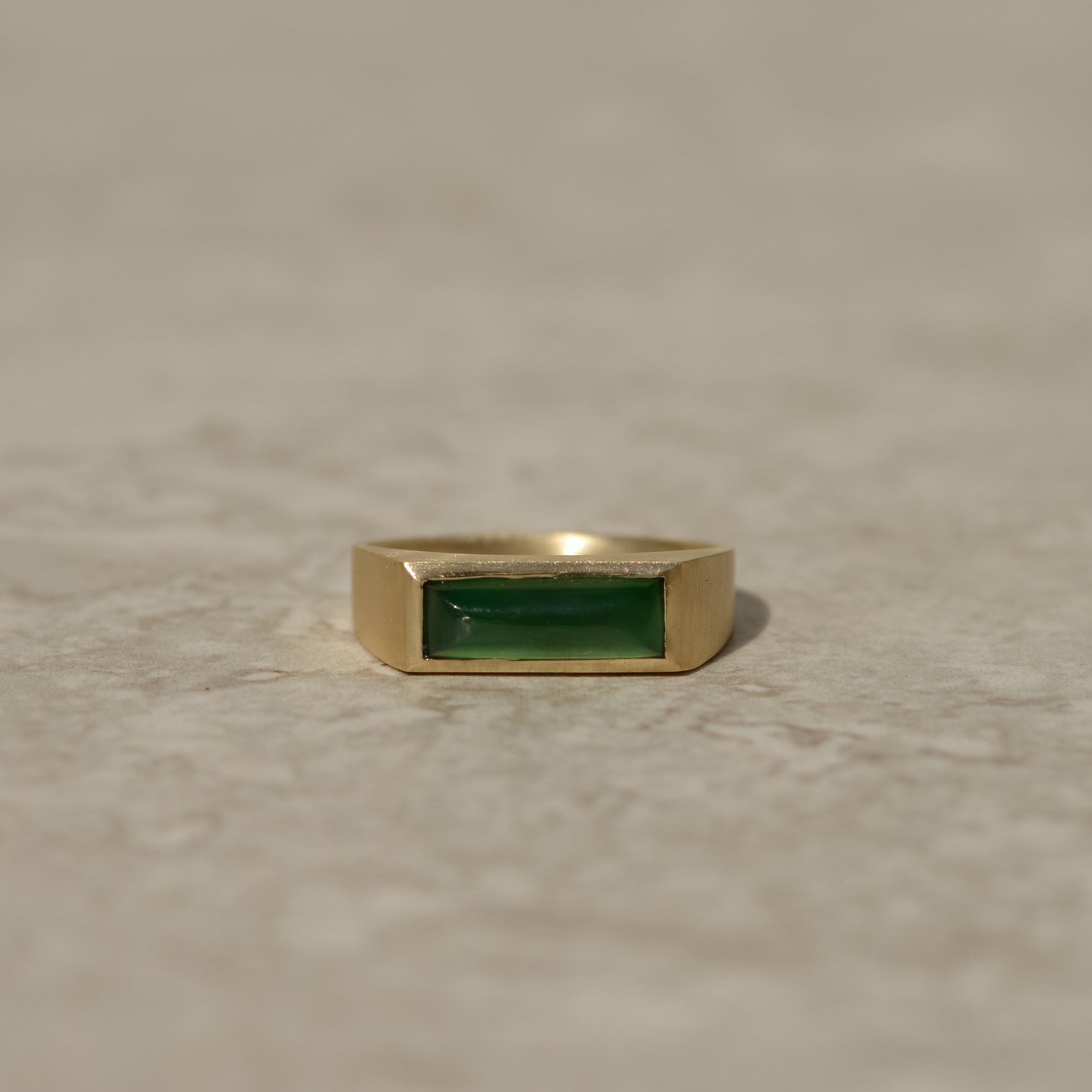 Signet rings were used as early as 3500 BCE, with symbols representing the family and the individual owner of the ring in intaglio, used for stamping important documents. This classic ring shape felt perfect to highlight the natural beauty of this Guatemalan jadeite- lush green and translucent with a beautiful glow.