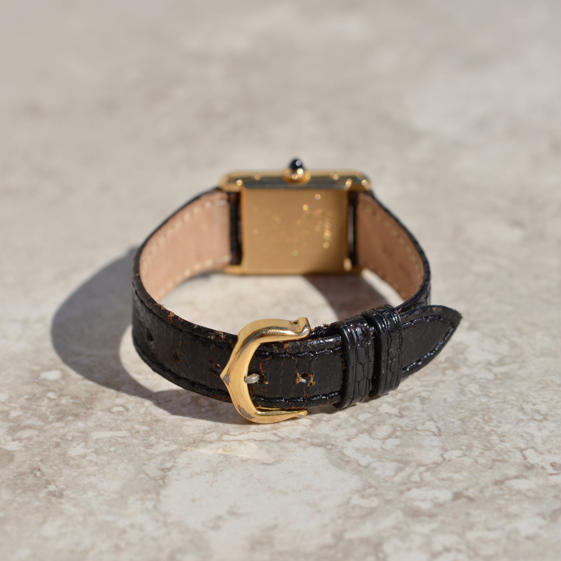 Replacement leather watch strap, Cartier vermeil buckle. Engraved on the back- engraving can be removed.