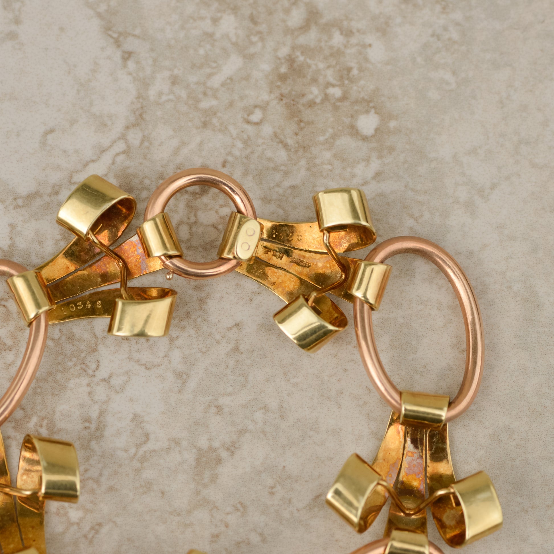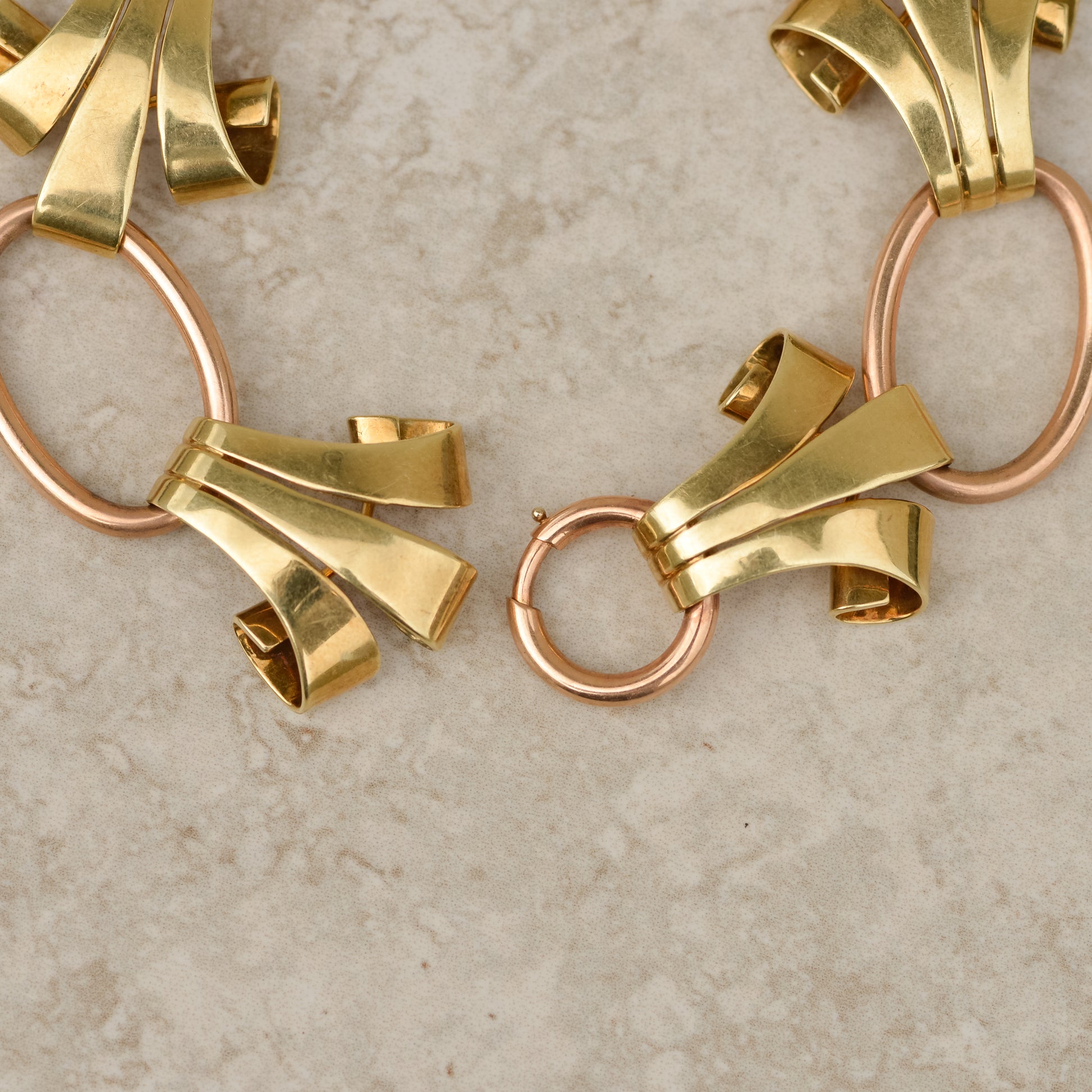 Bold and glamorous statement bracelet with the classic Retro era combination of rose and green gold. Scroll motifs are connected by large oval links, with a large spring ring to fasten the bracelet that blends in beautifully. Scroll links are 23.3 mm wide.