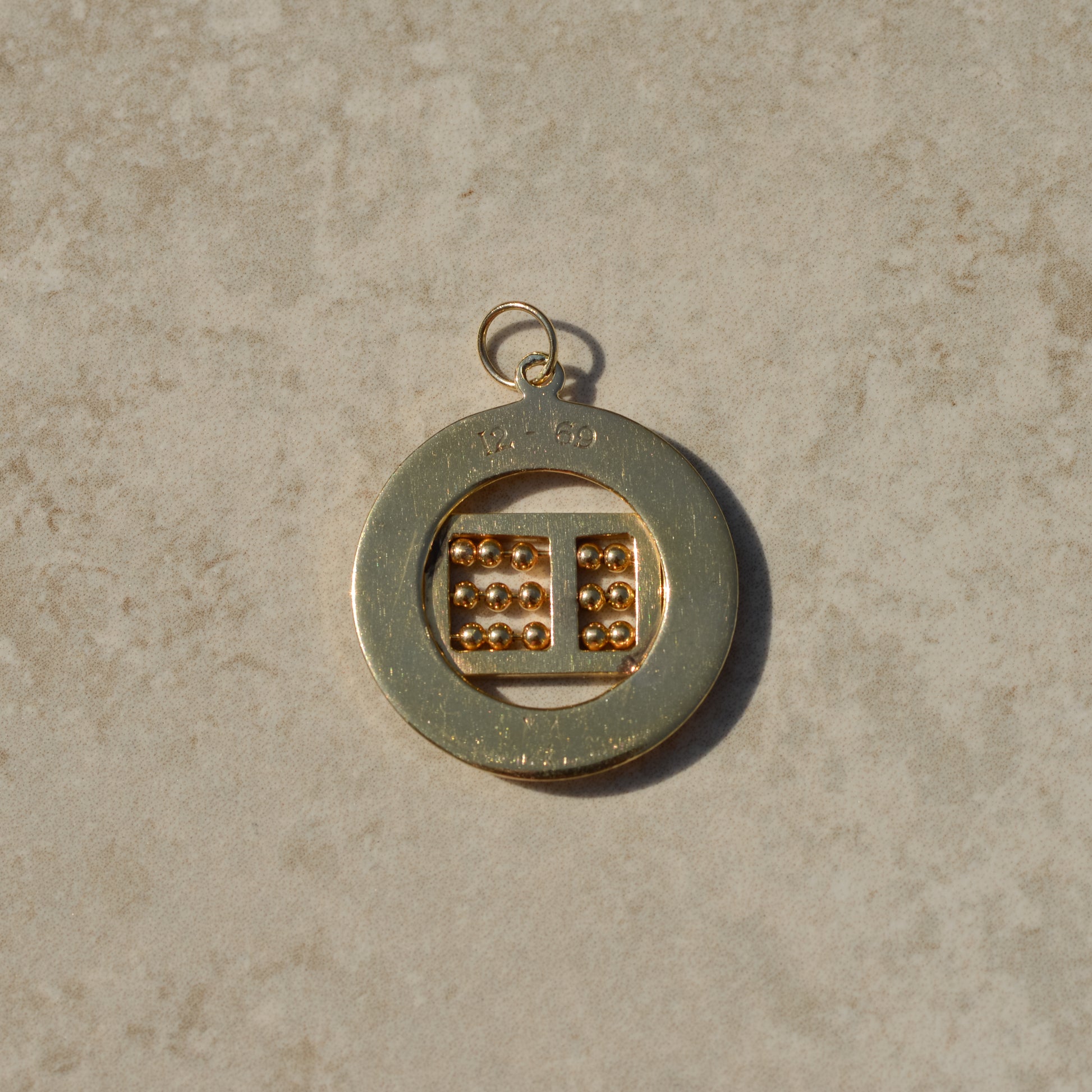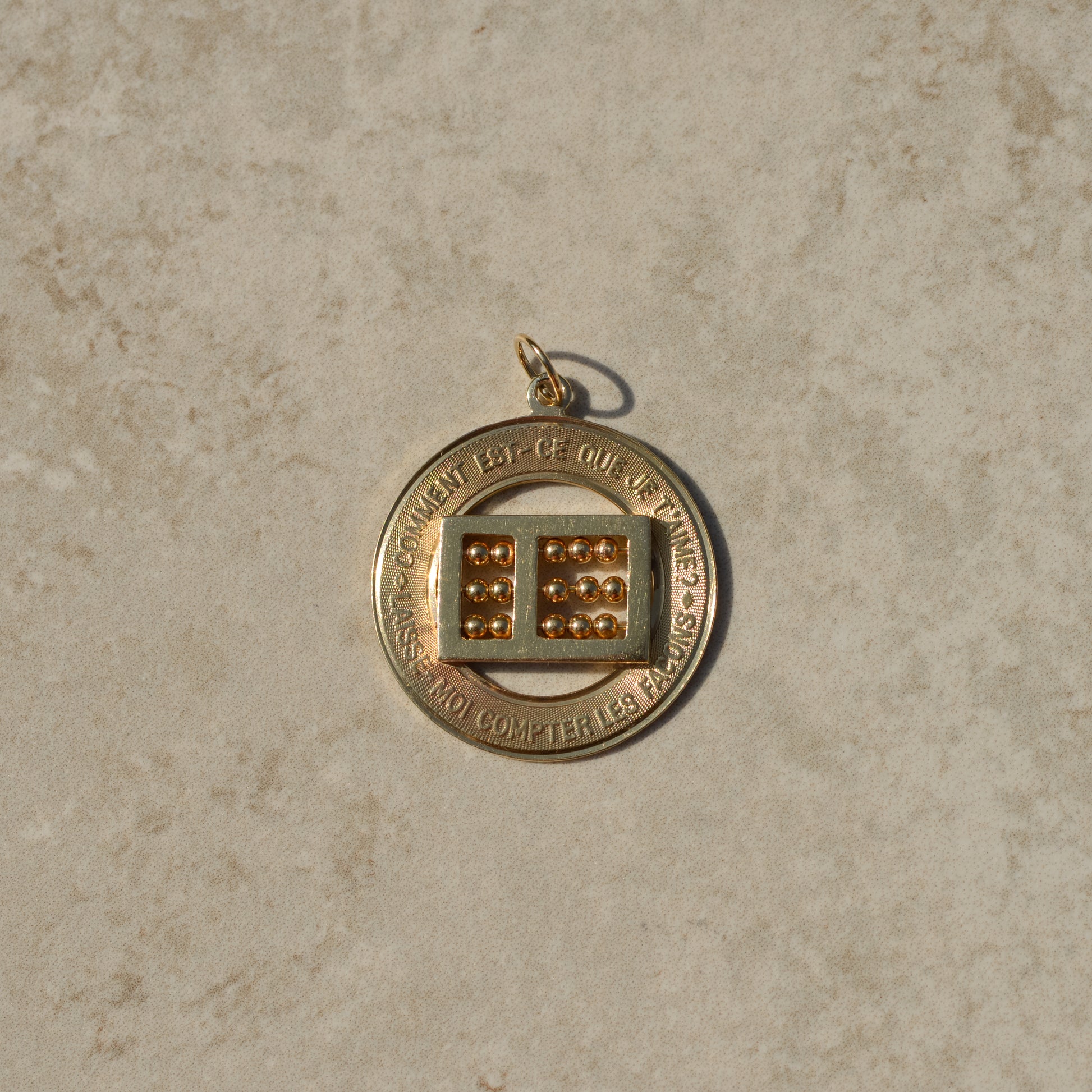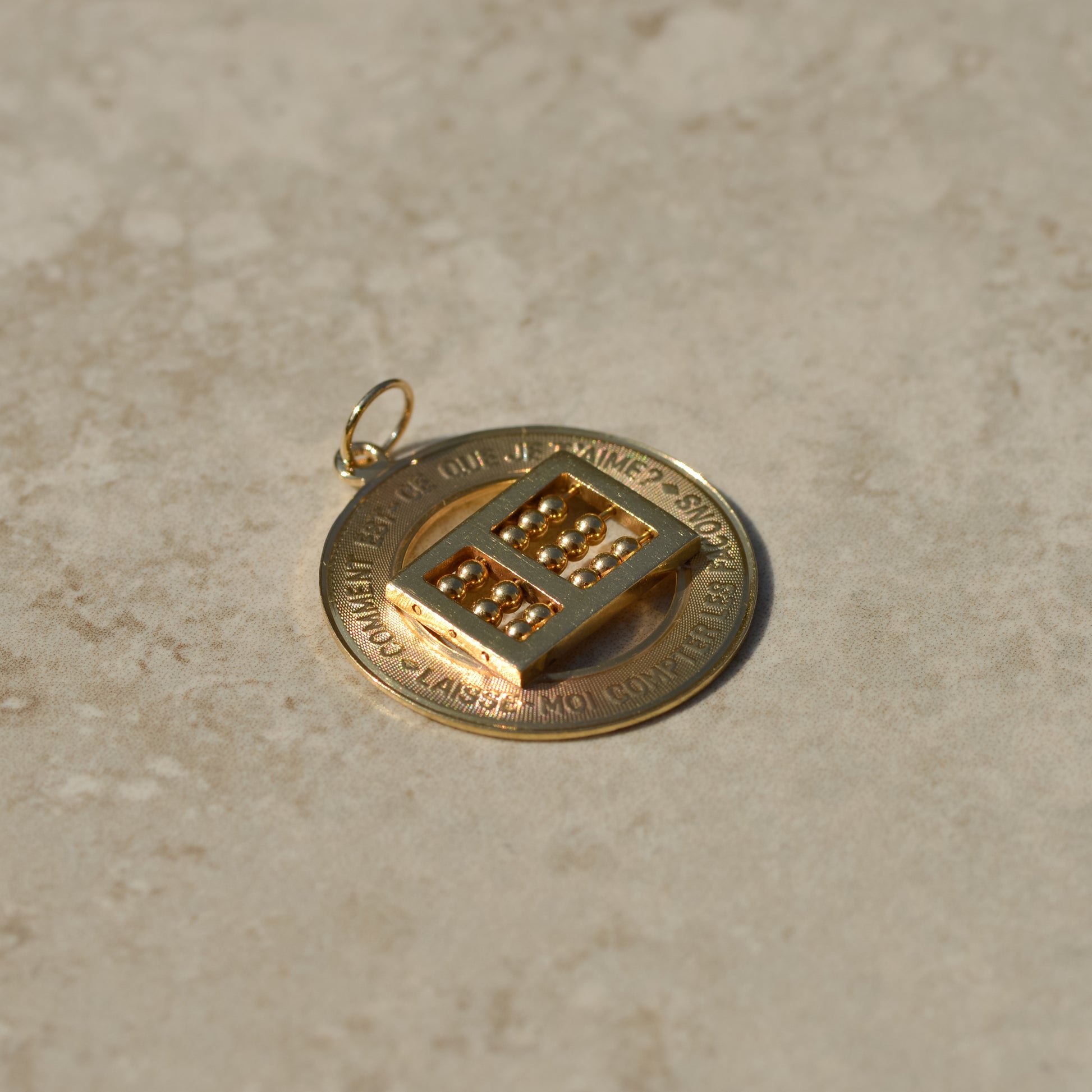 The sweetest vintage love charm, with an abacus with moving beads in the center. Text around the outer portion of the medallion says "Comment est-ce que je t'aime? Lasse-moi compter les facons" in French, translating to "How do I love you? Let me count the ways". The back has an engraving, "12-69".