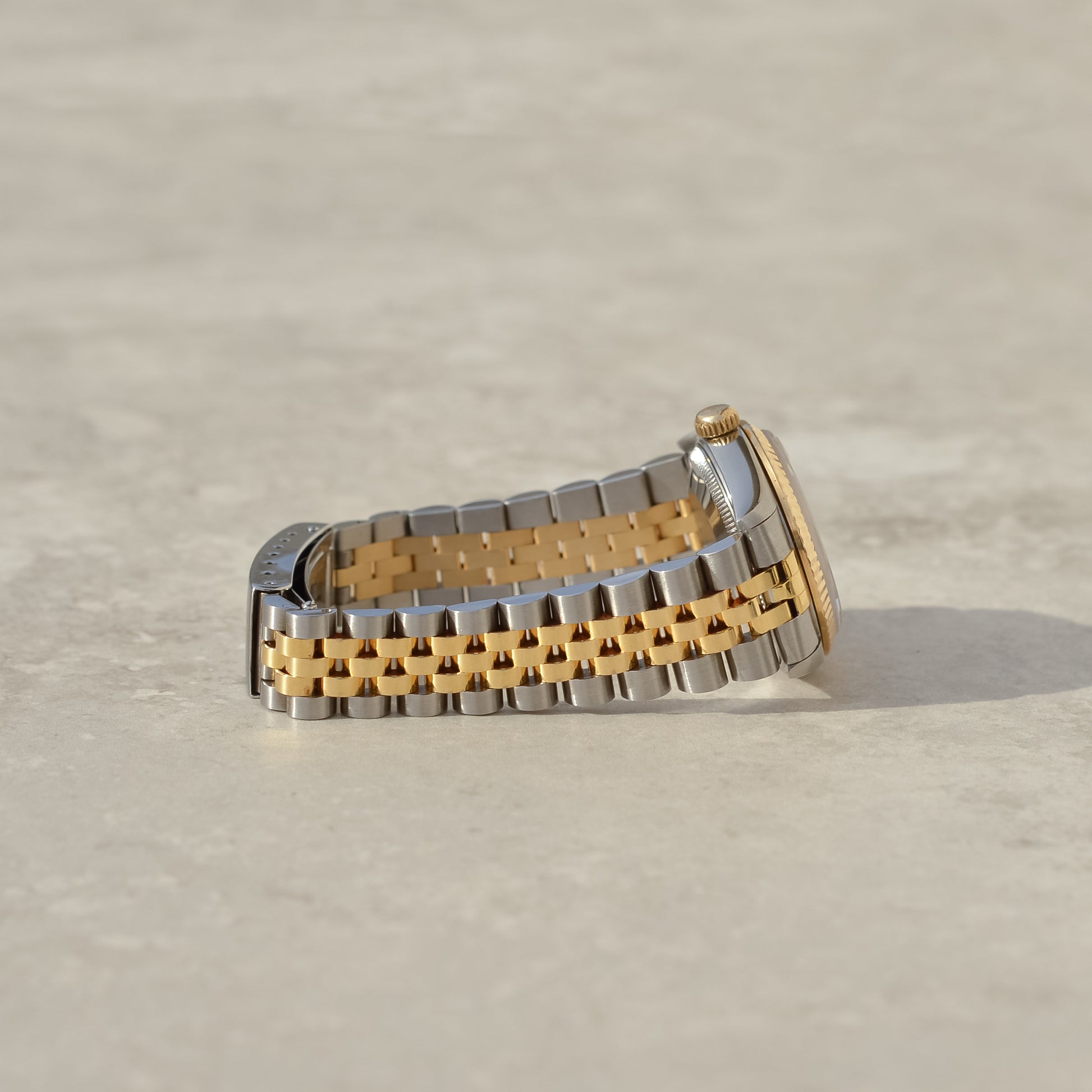 Featuring the emblematic fluted bezel in yellow gold, and a champagne dial beautifully set with diamonds by the factory. At the versatile 31 mm case size, this watch is a great entry point to the mid-range sizes. Perfect for larger wrists that feel like full sizes are too overpowering, or want to stack with bracelets; or for smaller wrists looking for more wrist coverage than the small sizes offer.