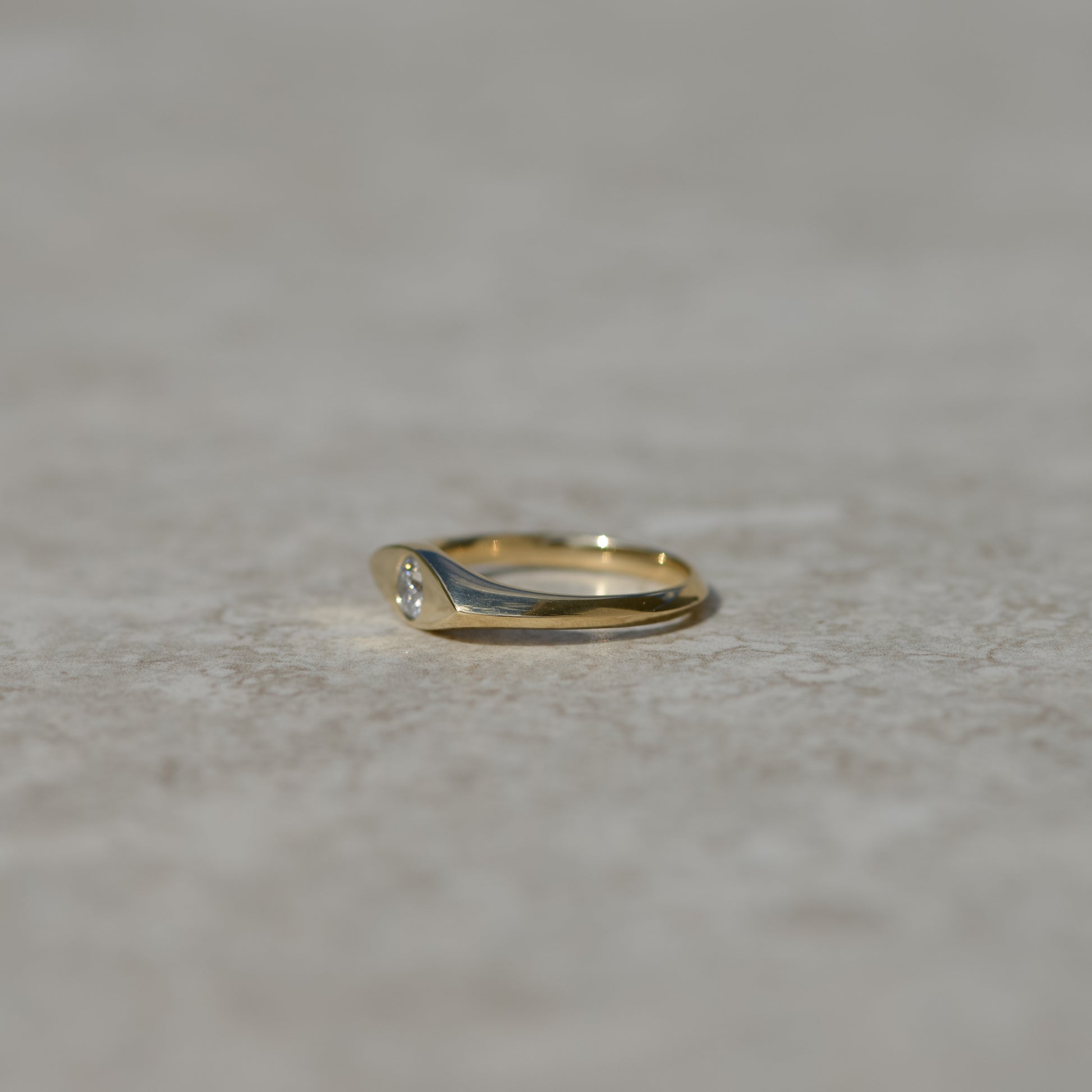 The feeling of the piece was an important consideration for us, so we juxtaposed a knife edge detail extending from the edges of the eye with a curved, comfort fit interior and closed back setting, smooth and comfortable on your finger.