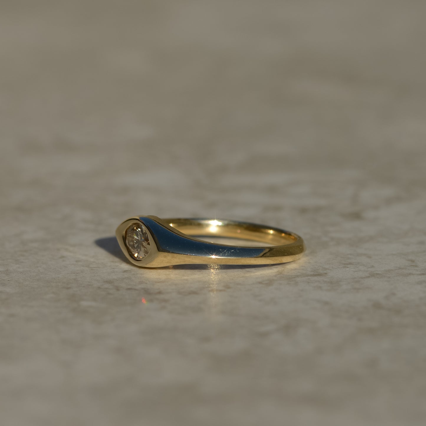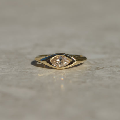 The feeling of the piece was an important consideration for us, so we juxtaposed a knife edge detail extending from the edges of the eye with a curved, comfort fit interior and closed back setting, smooth and comfortable on your finger.