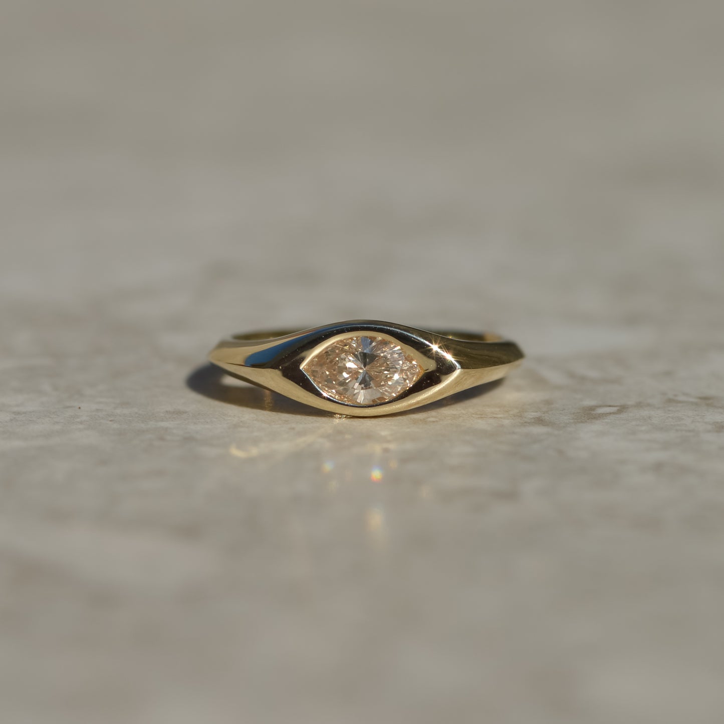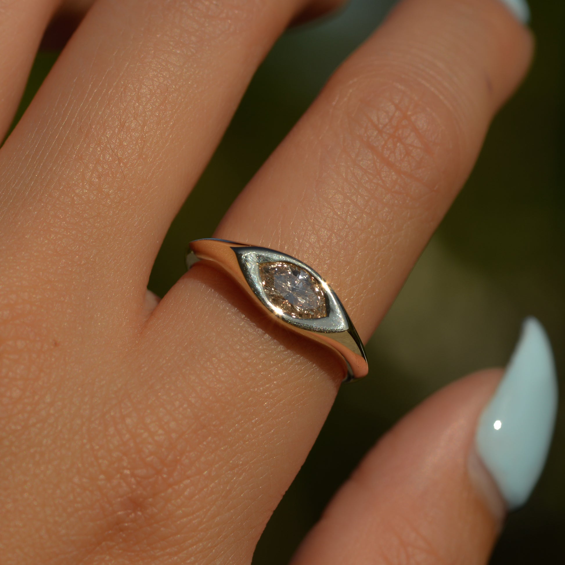 14k gold, set with a one-of-a-kind 0.56 carat marquise cut reclaimed natural diamond, SI2 clarity, with a light brownish orangish champagne color. Top of ring measures 13 mm x 6 mm.