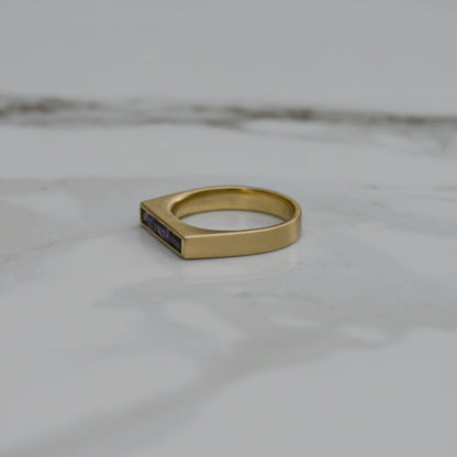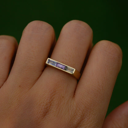Signet rings were used as early as 3500 BCE, with symbols representing a family and the individual owner of the ring, for stamping important documents. This classic ring shape felt perfect to showcase these beautiful baguette cut natural sapphires, each with multiple colors within the same stone.