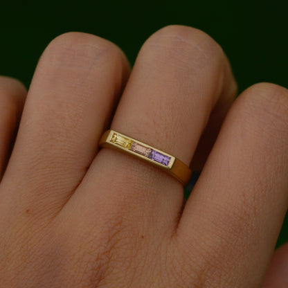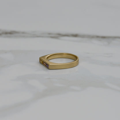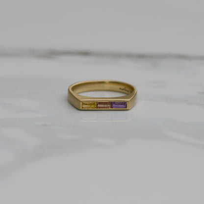 Signet rings were used as early as 3500 BCE, with symbols representing the family and the individual owner of the ring in intaglio, used for stamping important documents. This classic ring shape felt perfect to showcase these beautiful baguette cut natural sapphires.