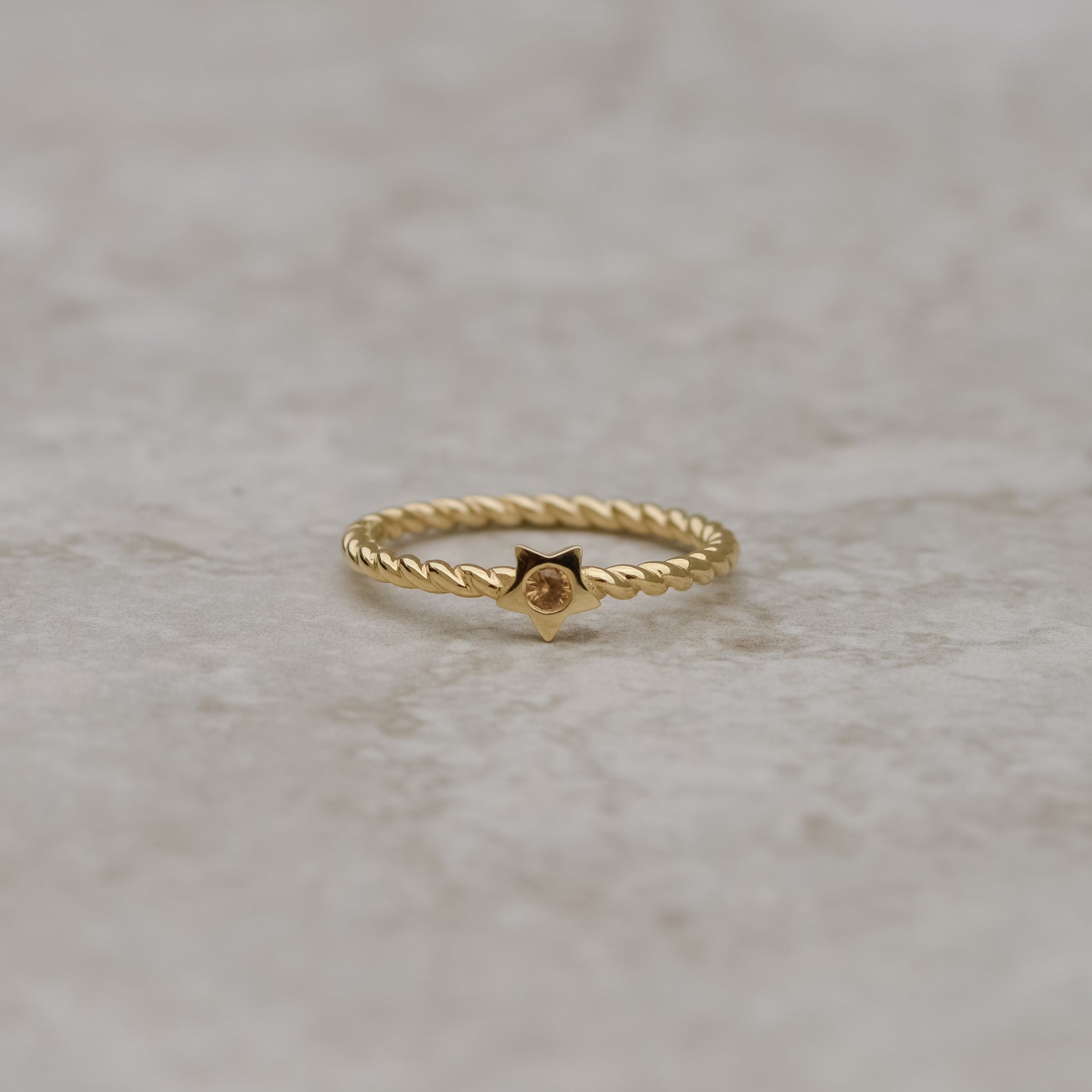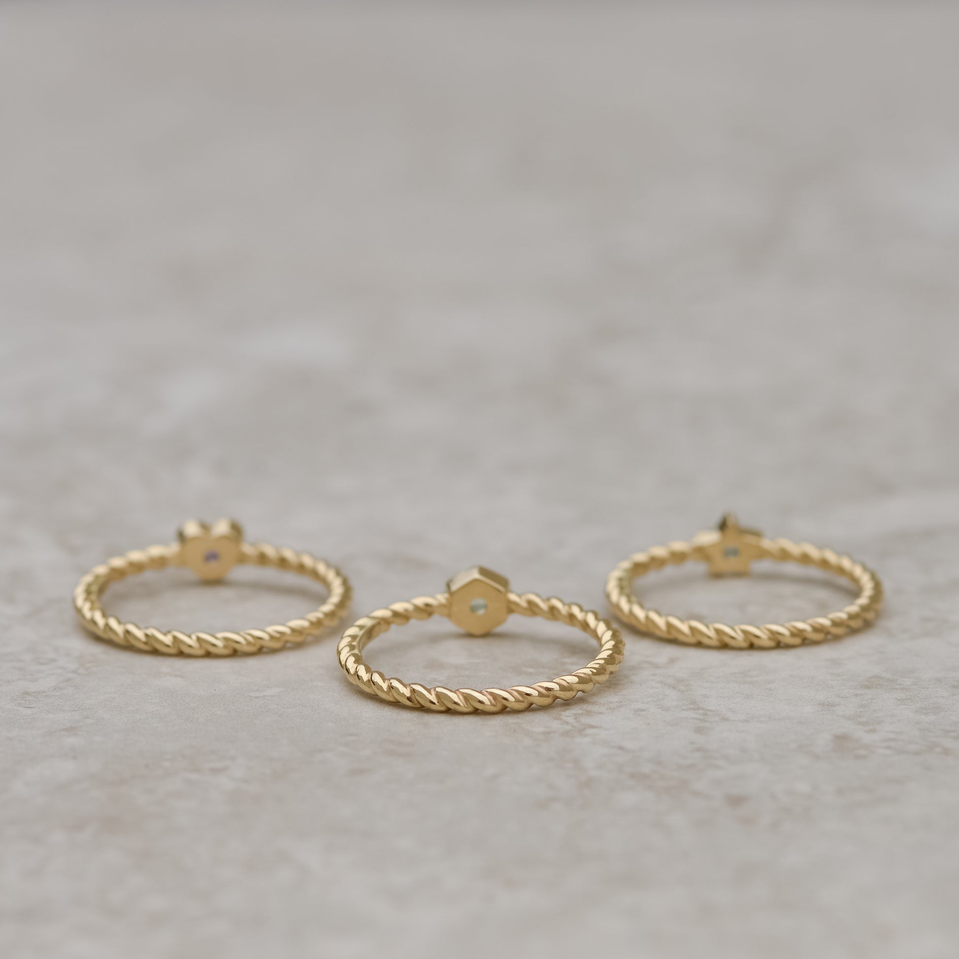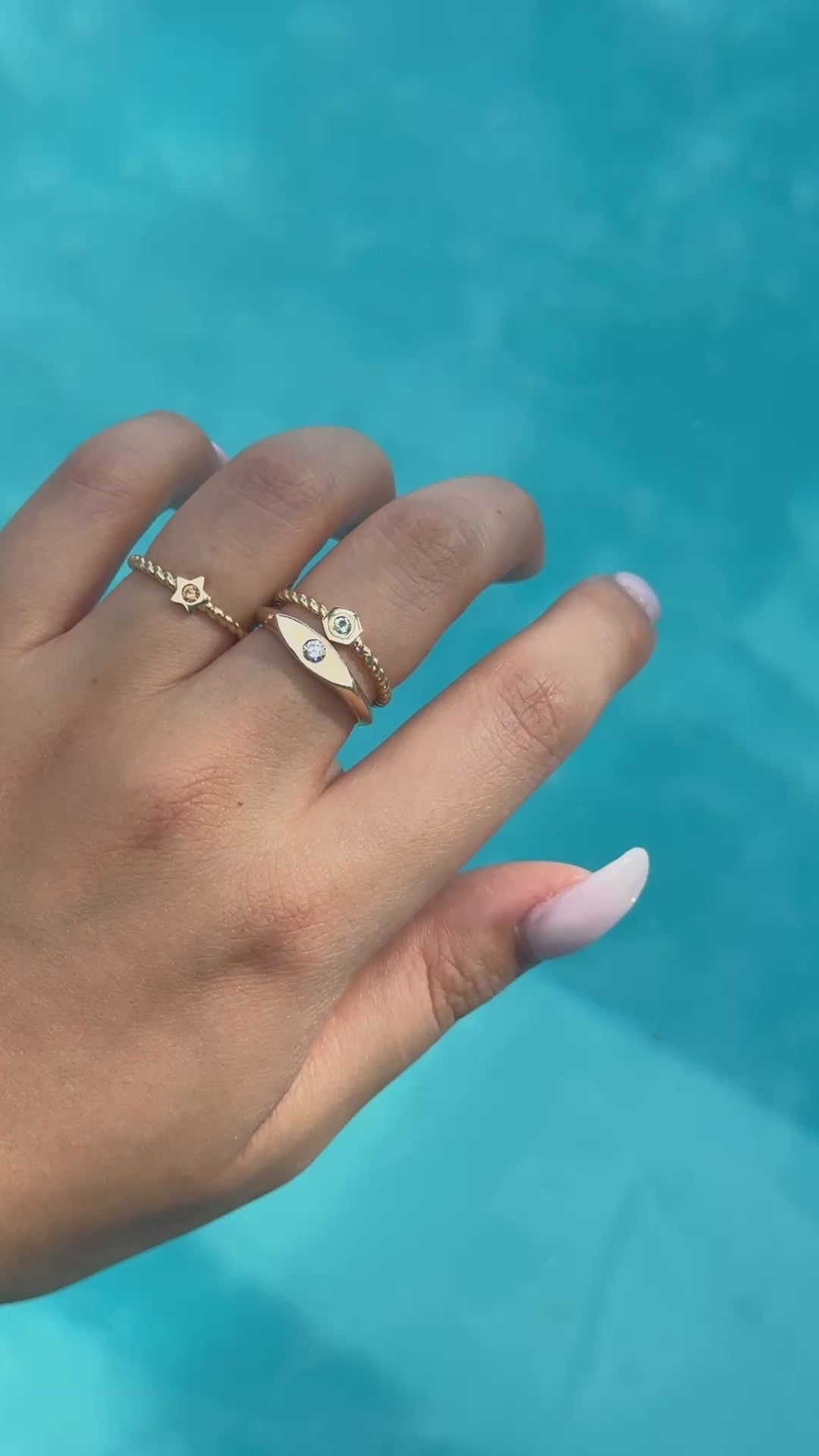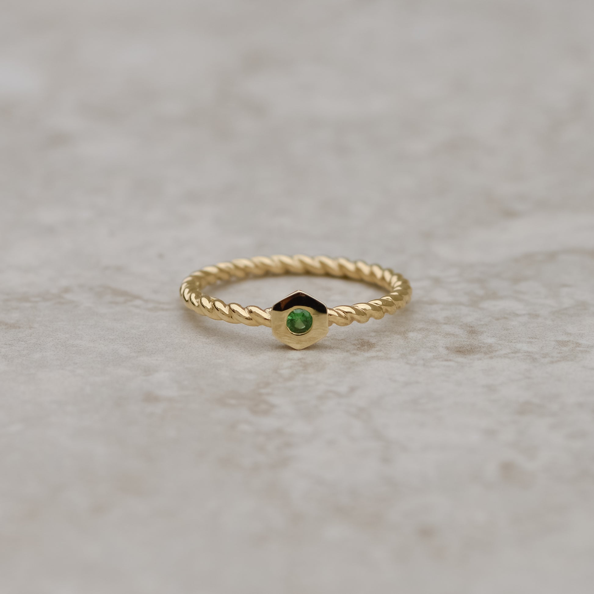 Each token is set with a 2.25 mm responsibly sourced gemstone of your choice: orange zircon, lime sapphire, tsavorite green garnet, purple spinel, mint beryl, and teal sapphire. 14k solid gold, 1.8 mm band.