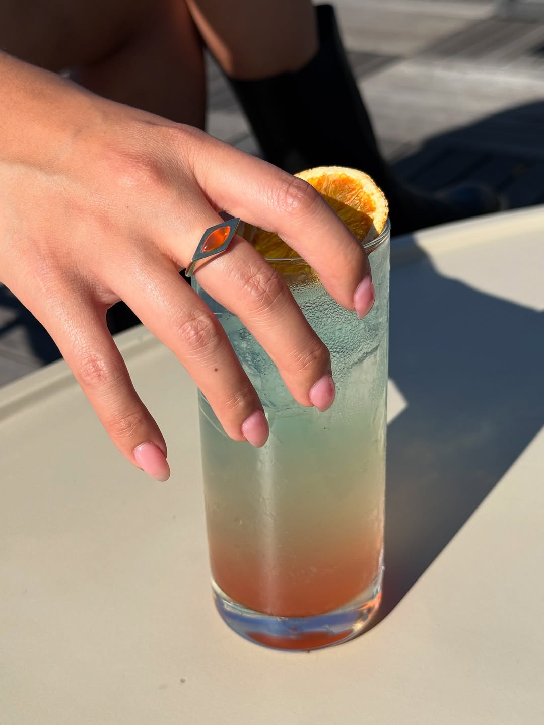 Signet rings were used as early as 3500 BCE, with symbols representing the family and the individual owner of the ring in intaglio, used for stamping important documents. We continued to play with this classic ring style, combining a lozenge shape with straight slicing edges, with a softly curving navette within. High polished gold and sharp angles, balancing a mysteriously glowing, intensely colored gemstone.