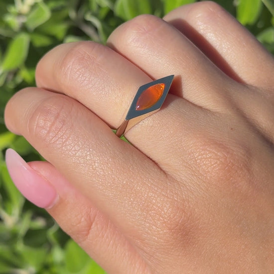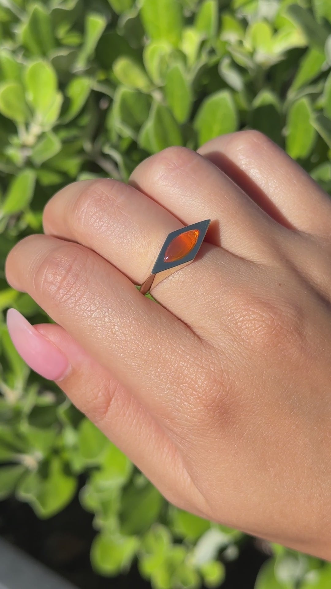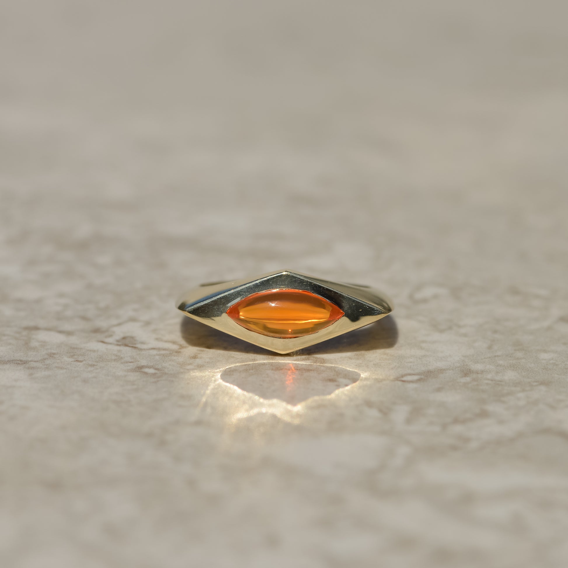 14k gold, set with a 1.3 carat navette cabochon cut Mexican fire opal, a custom cut by our lapidary in Los Angeles, with a glowing orange color. Top of ring measures 20 mm x 8 mm.