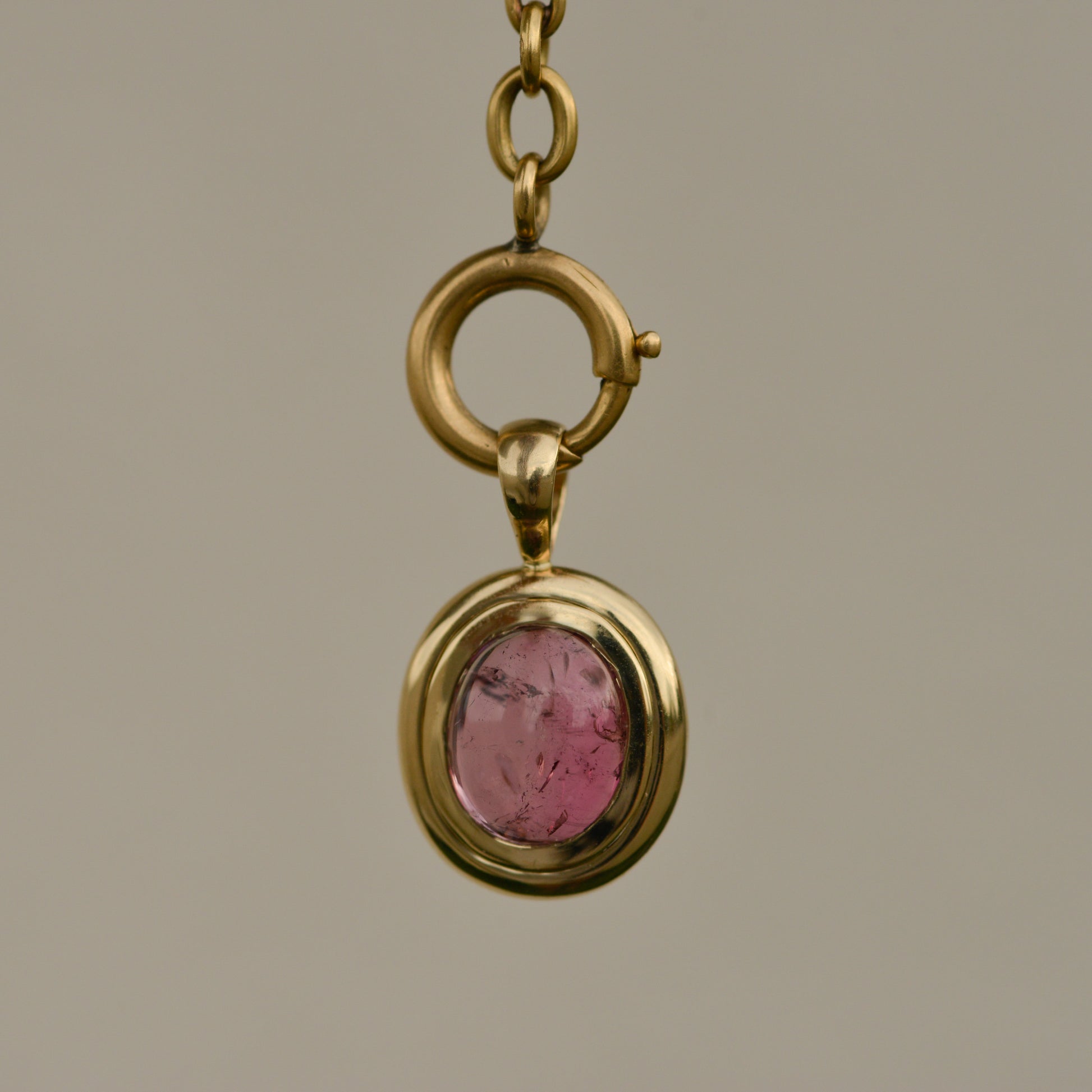 This pendant is made in 14k gold, and contains a 4.9 ct pink tourmaline cabochon.