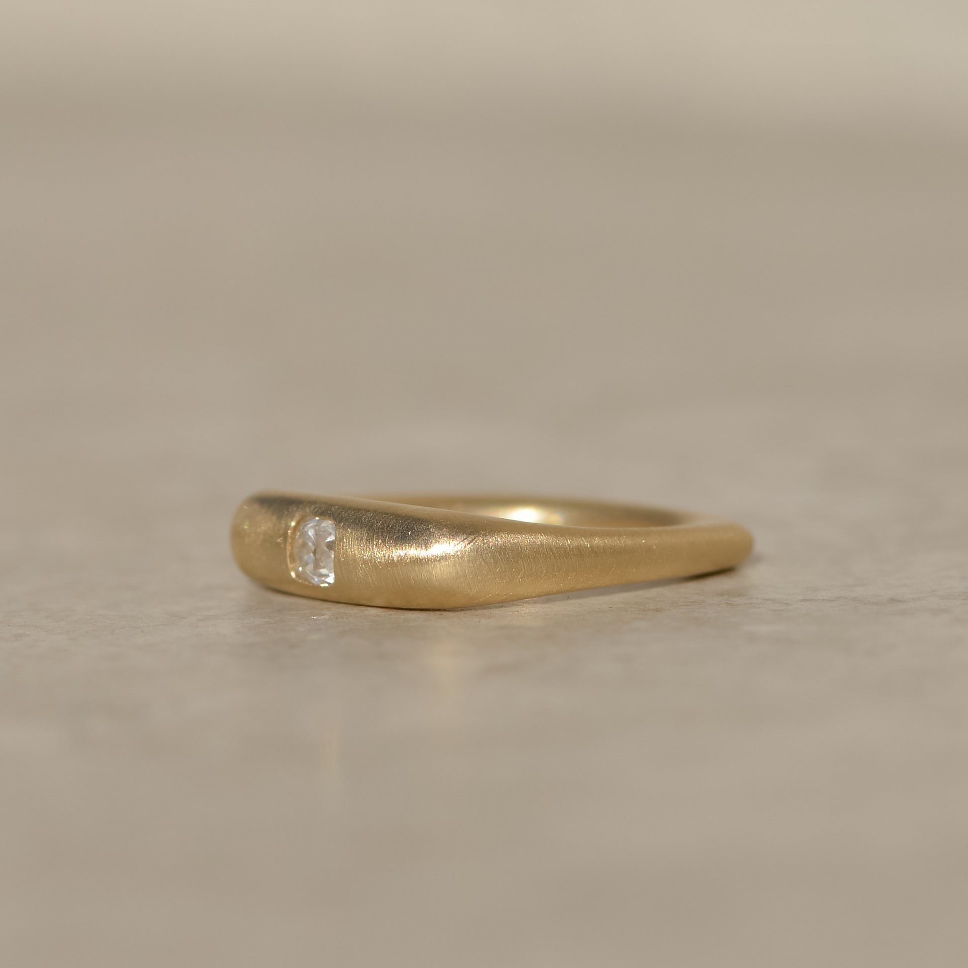A one-of-a-kind champagne old European cut diamond, in a band with softly squared corners. Brushed, glowing gold contrasts the sparkle of the antique diamond, with its chunky, asymmetric facets and a large open culet characteristic of antique cut stones.
