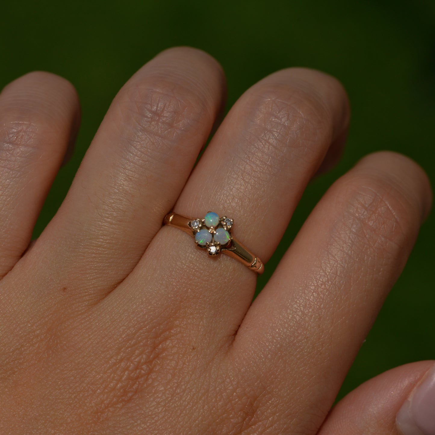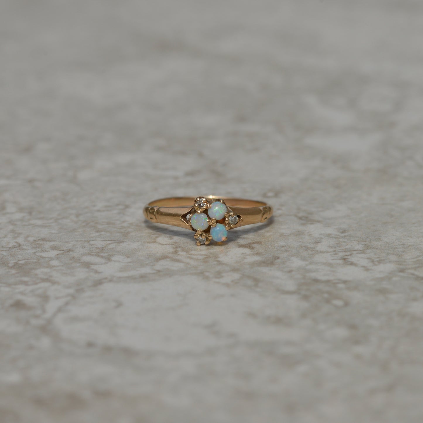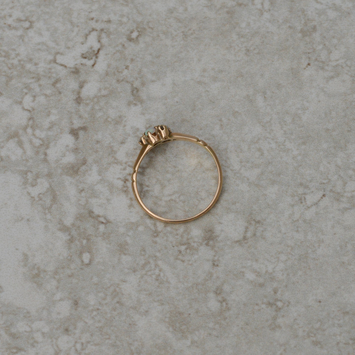 Antique Victorian ring with a sweet little cluster of three cabochon opals and three single-cut diamonds. Set in 14k rosy gold, with little details on the shoulders.