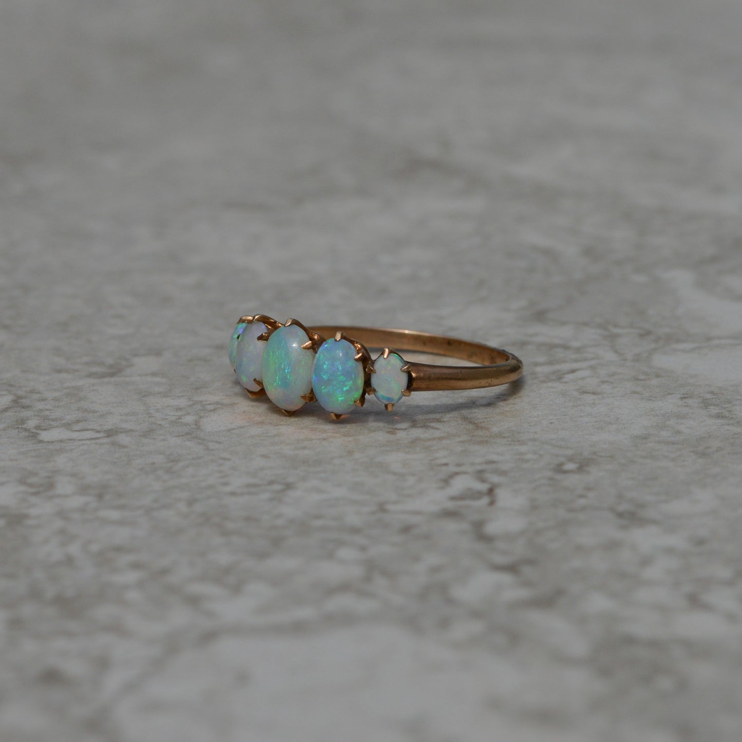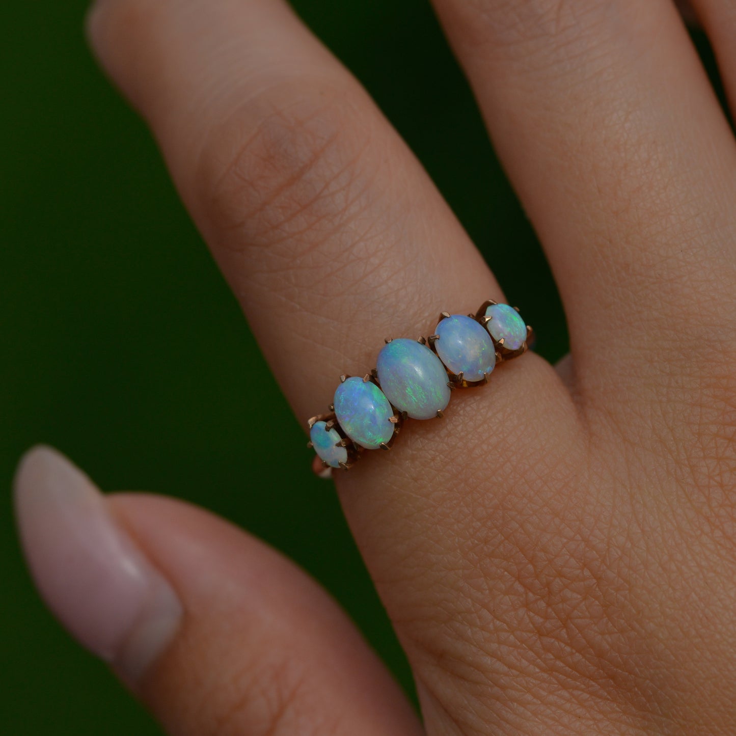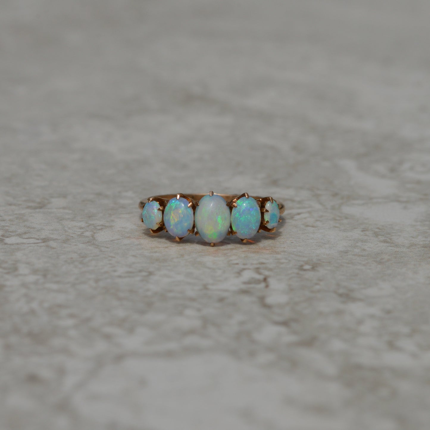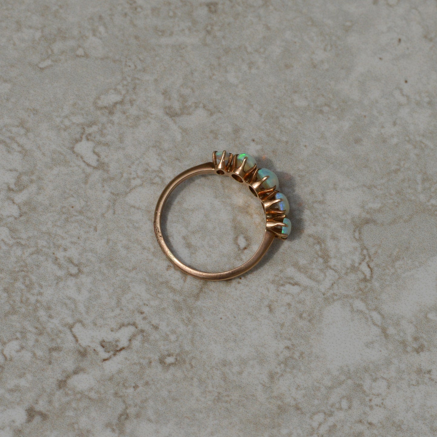 Antique classic five-stone band, with beautiful fiery opals set in claw settings.