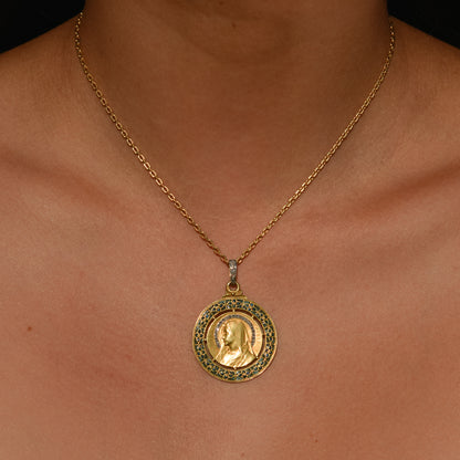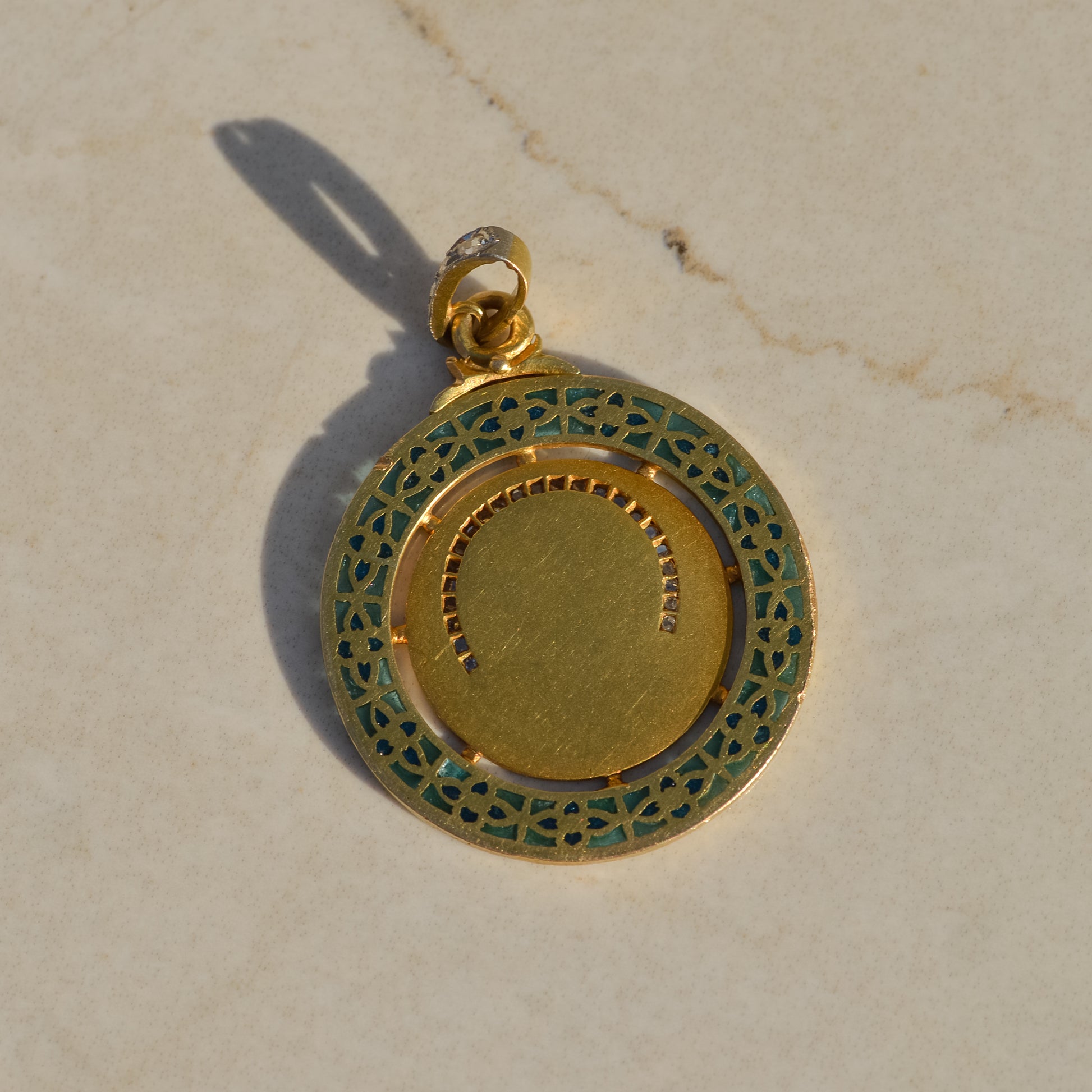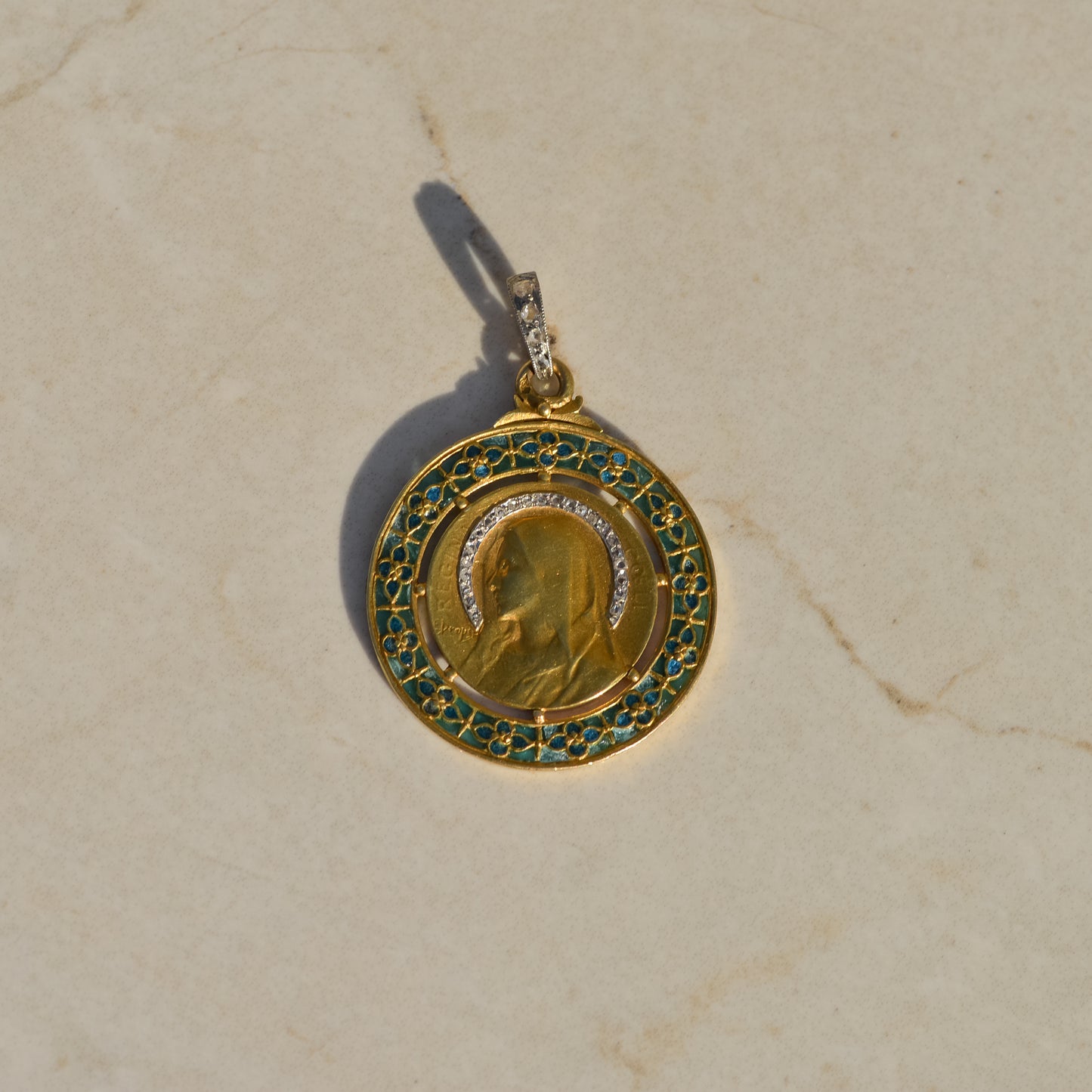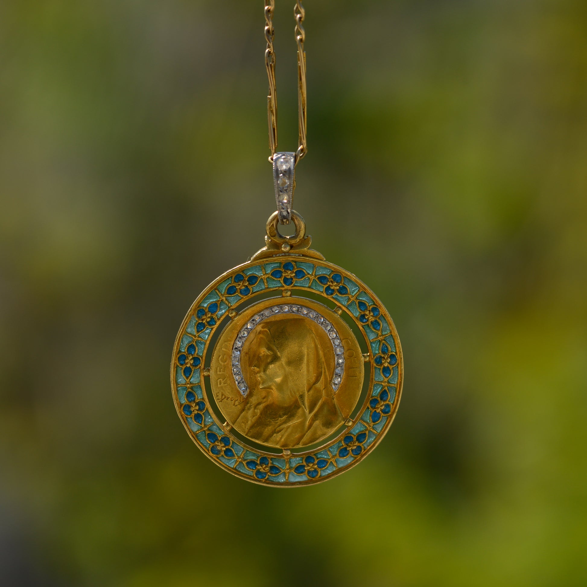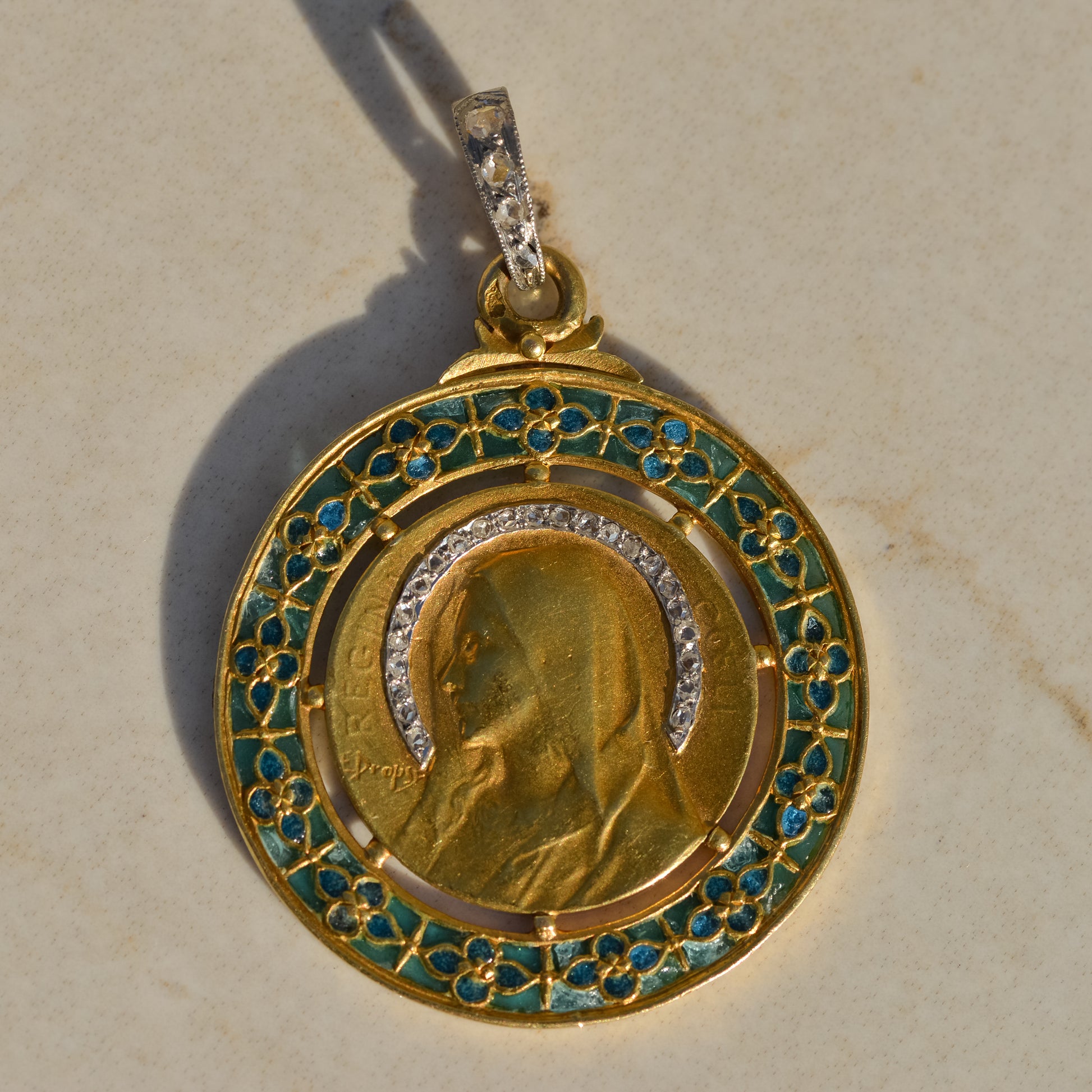 An antique Art Nouveau medallion, depicting Mother Mary, with a halo of shimmering rose cut diamonds, and original diamond bail. Framed with intricate floral plique-à-jour enamel work in shades of blue, an enamel technique with no metal backing, allowing the light to shine through like a miniature stained glass window.