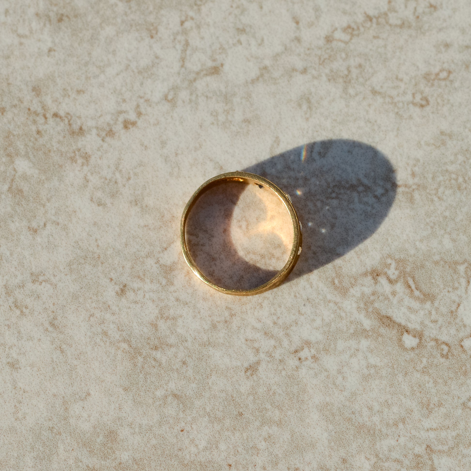 Antique five-stone band with star-set rosecut diamonds and sapphires. Finished with engraved texture for a unique look!
