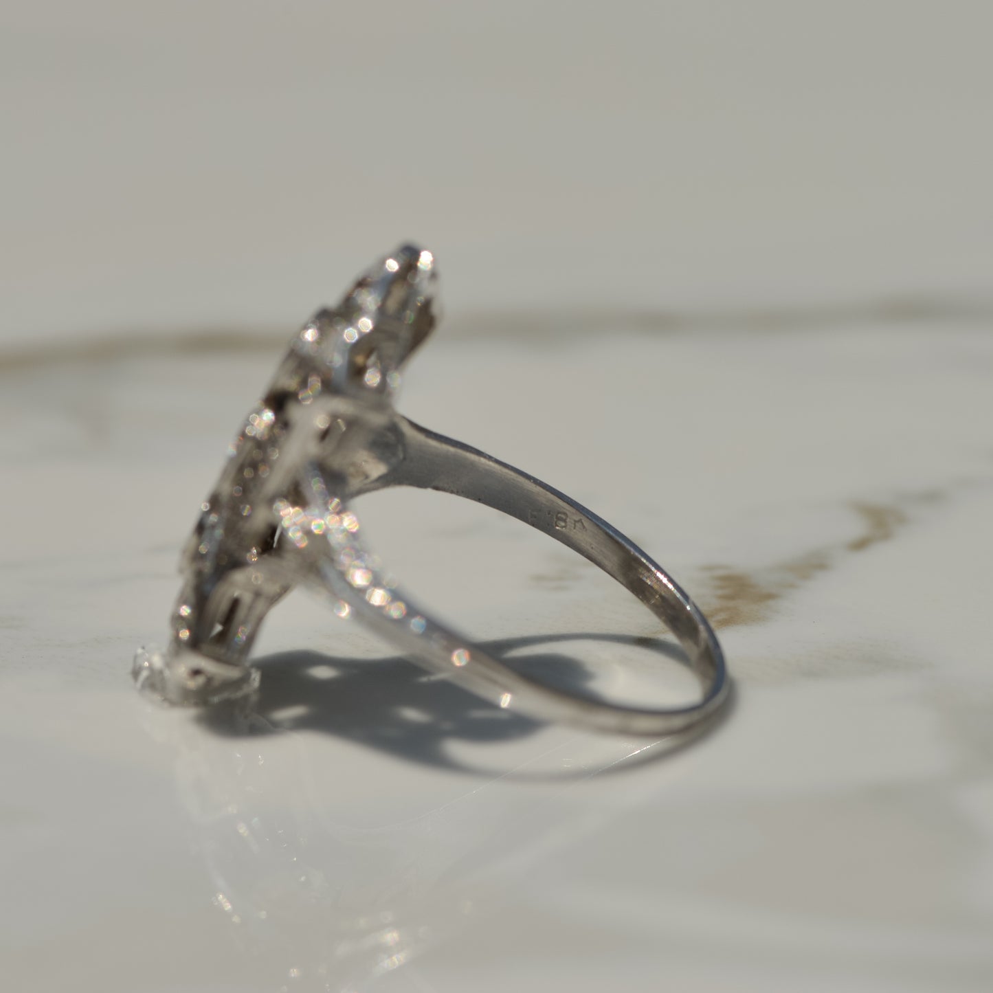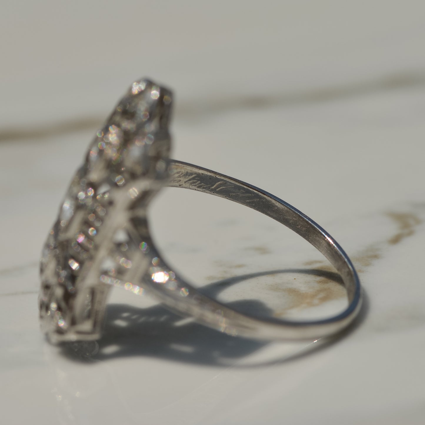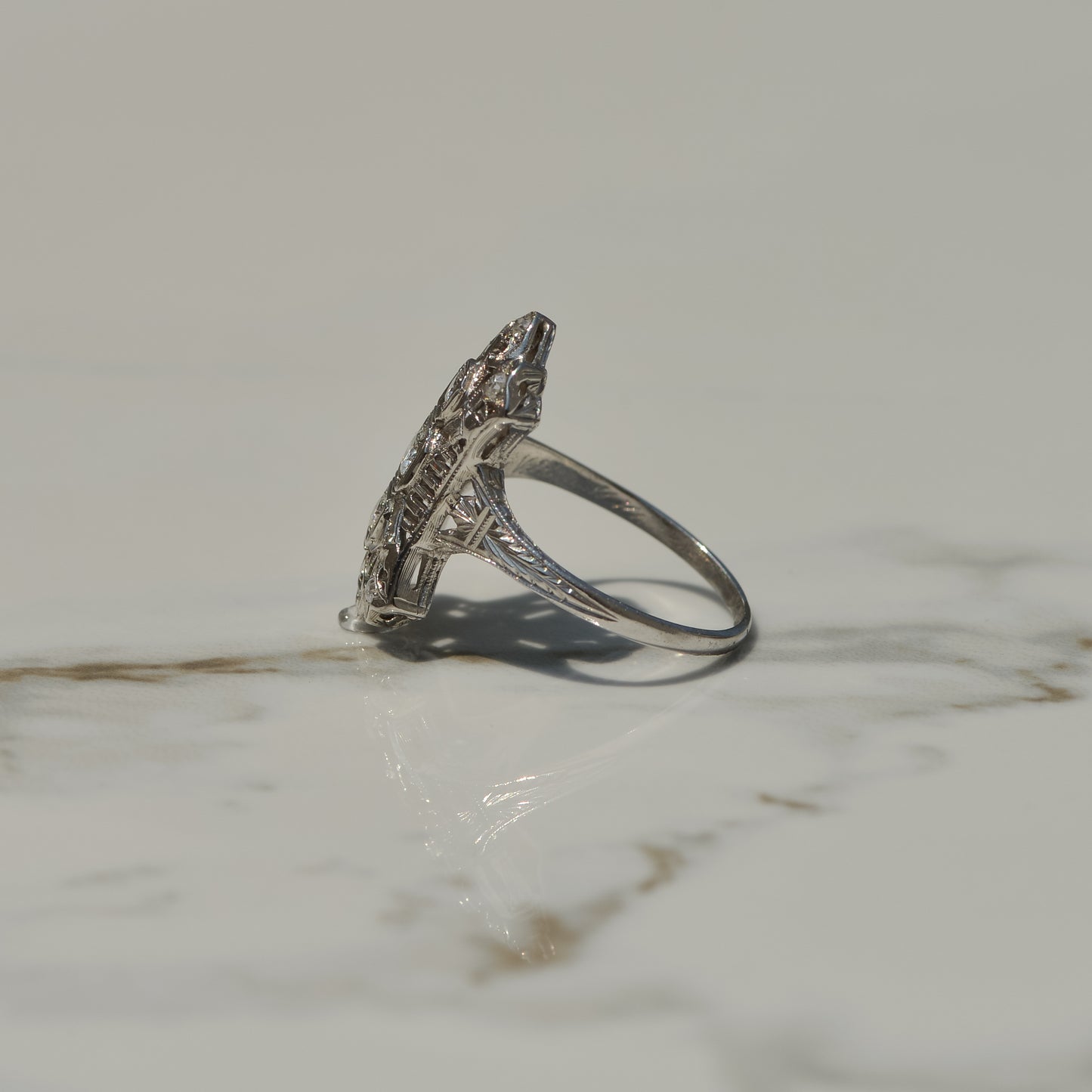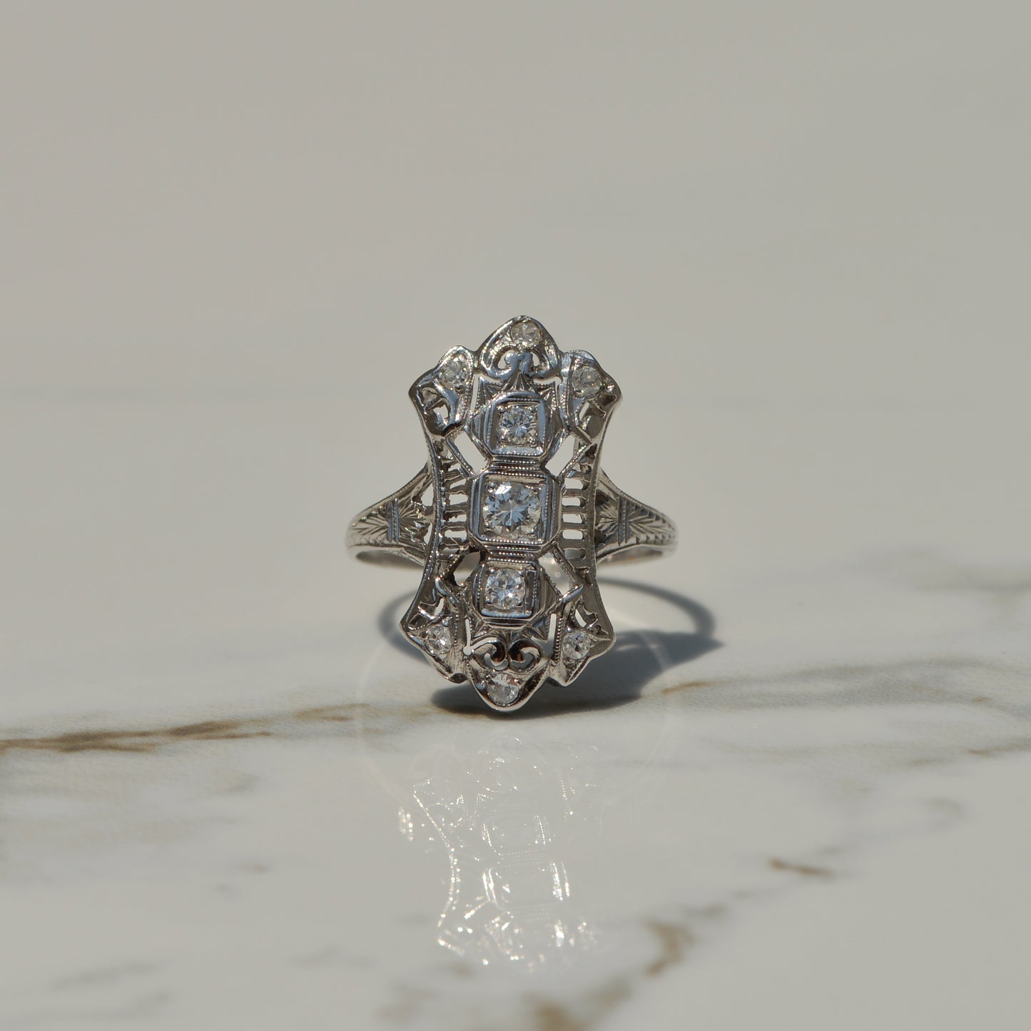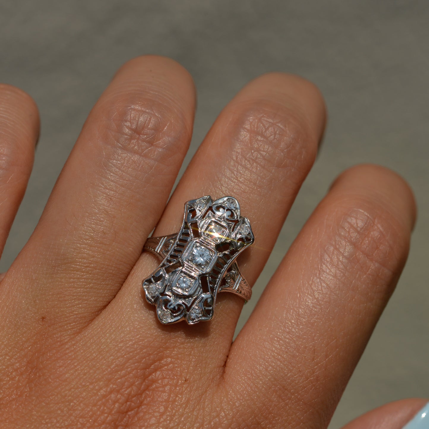 Late art deco cocktail ring in white gold with intricate filigree details and engraved shoulders, set with three full-cut old European/transitional round diamonds, and six small single-cut diamonds. Approx. 0.4 ct total diamonds, G-I color, SI clarity. Top measures 22 mm x 12 mm.