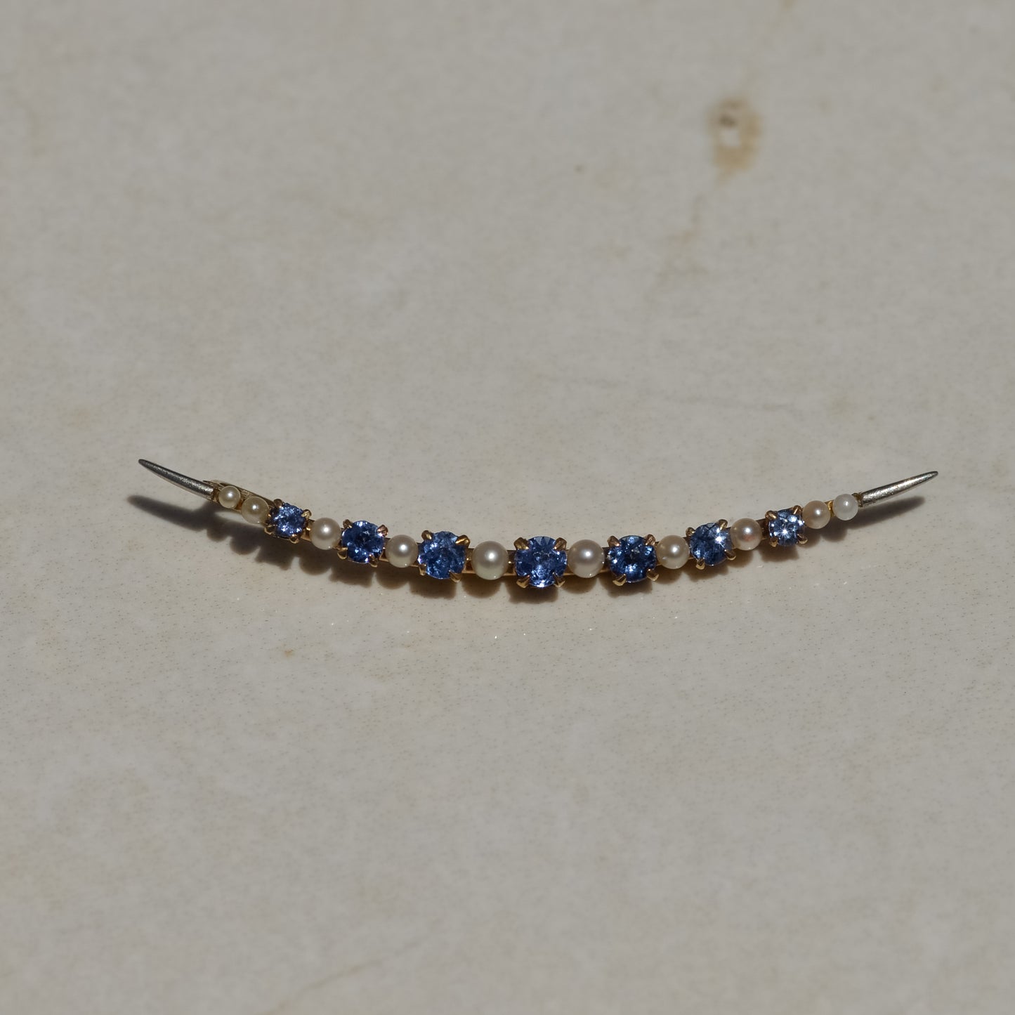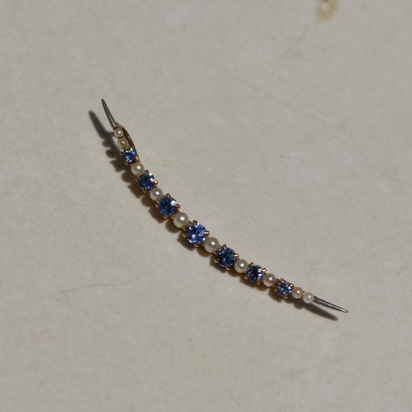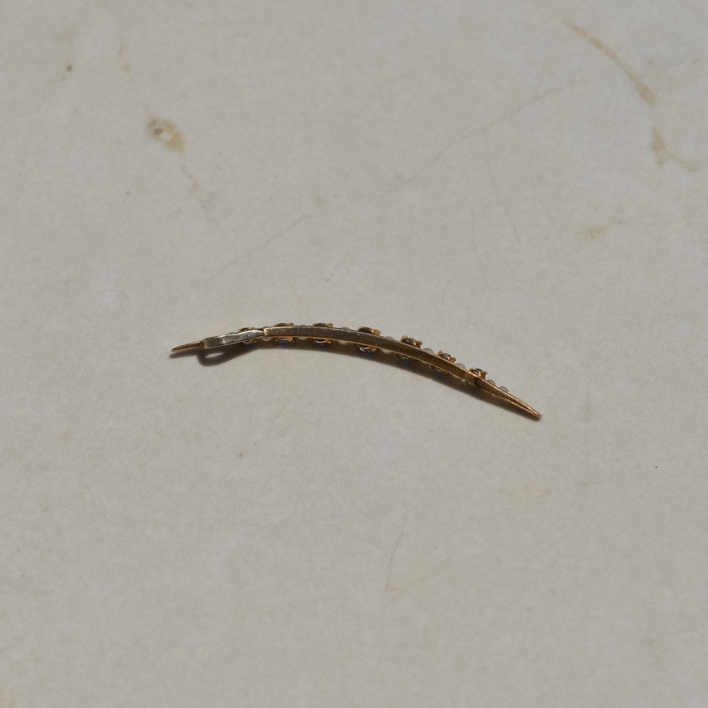 A beautiful Art Deco crescent moon slider pendant with sky blue natural sapphires and small pearls, set in 14k gold. The sapphires are a transitional cut, retaining the smaller table of old cuts, without the culet. A dainty celestial piece that works beautifully alone or stacked! Largest sapphire measures 3.2 mm, and smallest is 2.1 mm. 7 sapphires and 10 pearls total.