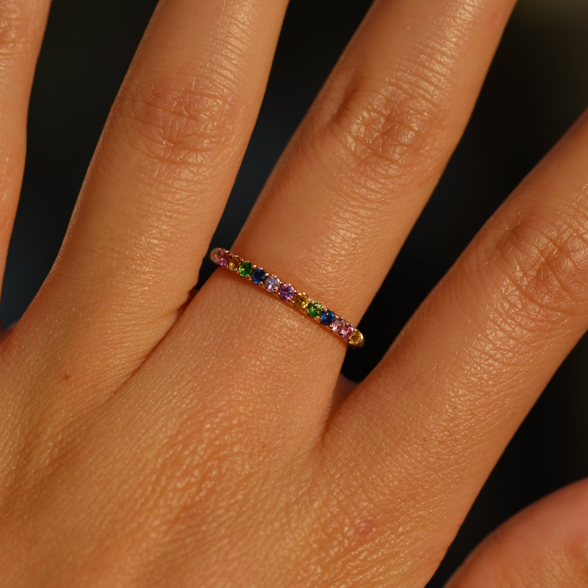 Estate band set with round cut multicolored sapphires on half of the band, in yellow gold. 2 mm width.
