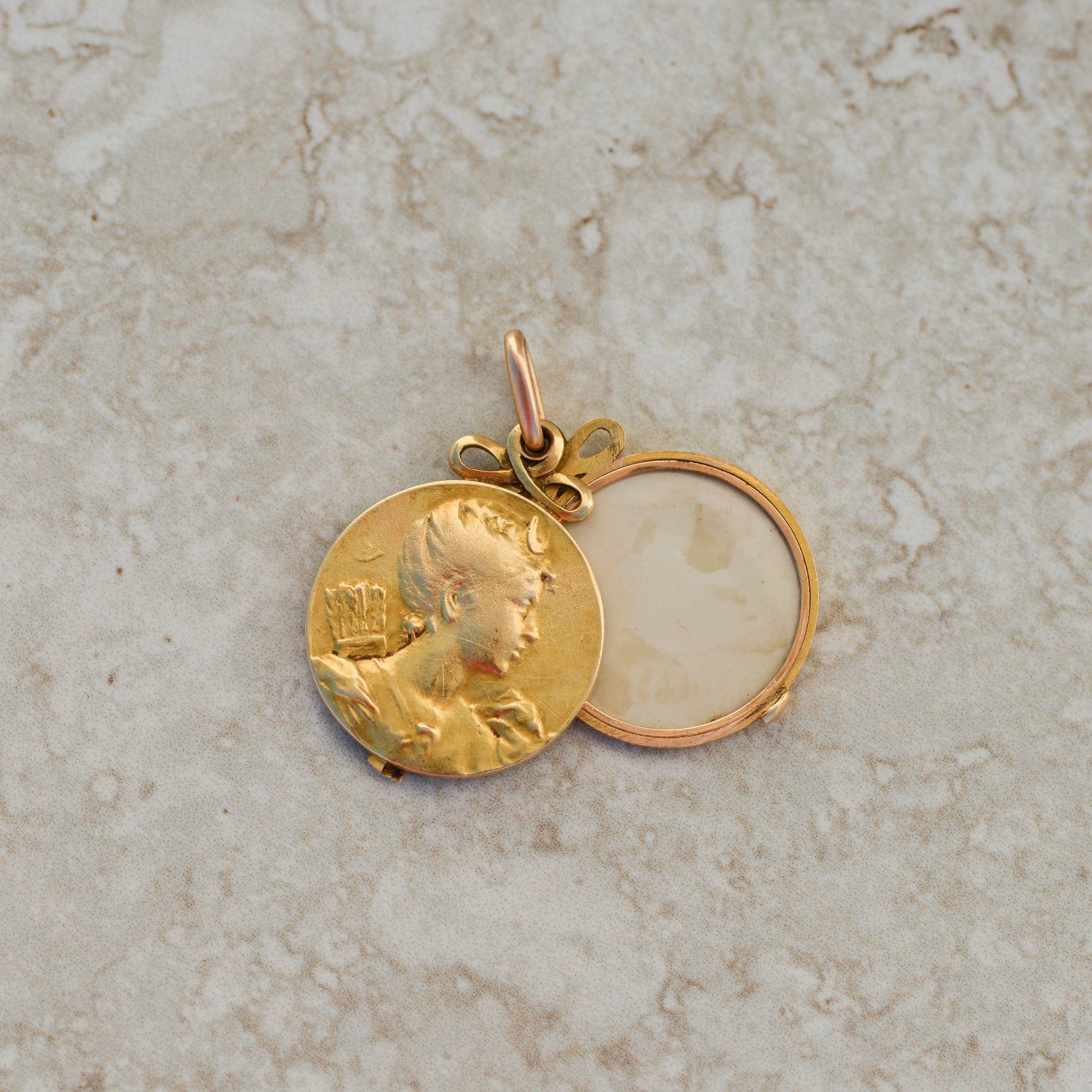 French art nouveau repoussé locket depicting a young woman with arrows on the front likely the goddess Diana or Artemis, and flowers on the reverse. Slides open to reveal two spaces to store photographs with covers, original photographs still present. The side of the locket is engraved with a date, 13 - 6 - 98 (1898).