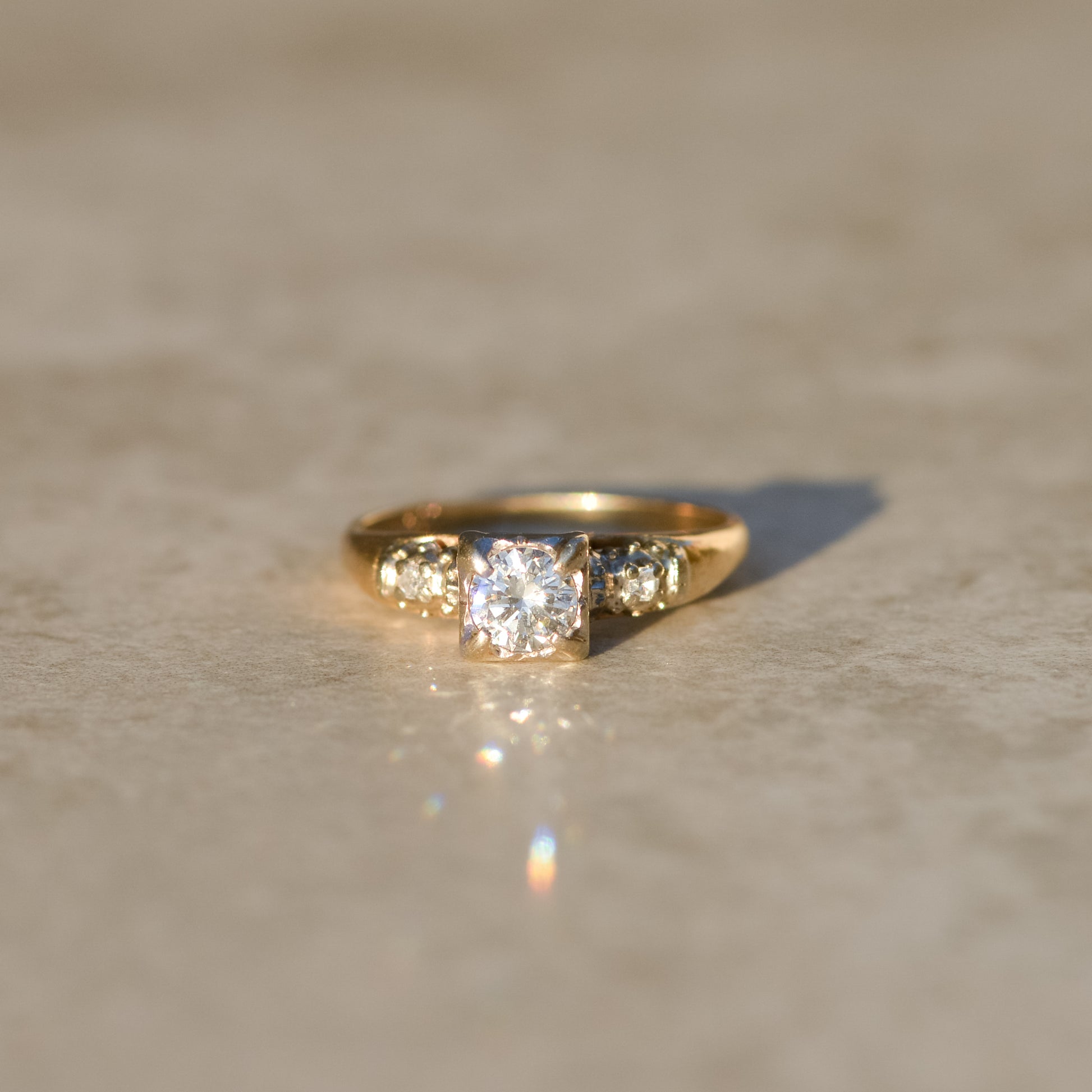 Mid-century diamond solitaire ring with an estimated 0.45 ct round transitional cut diamond in a square setting, accompanied by two smaller single cut diamonds on the shoulders. The diamonds are set in white gold, while the rest of the ring is yellow gold. Approx. 0.45 ct diamond, G-H, SI1.