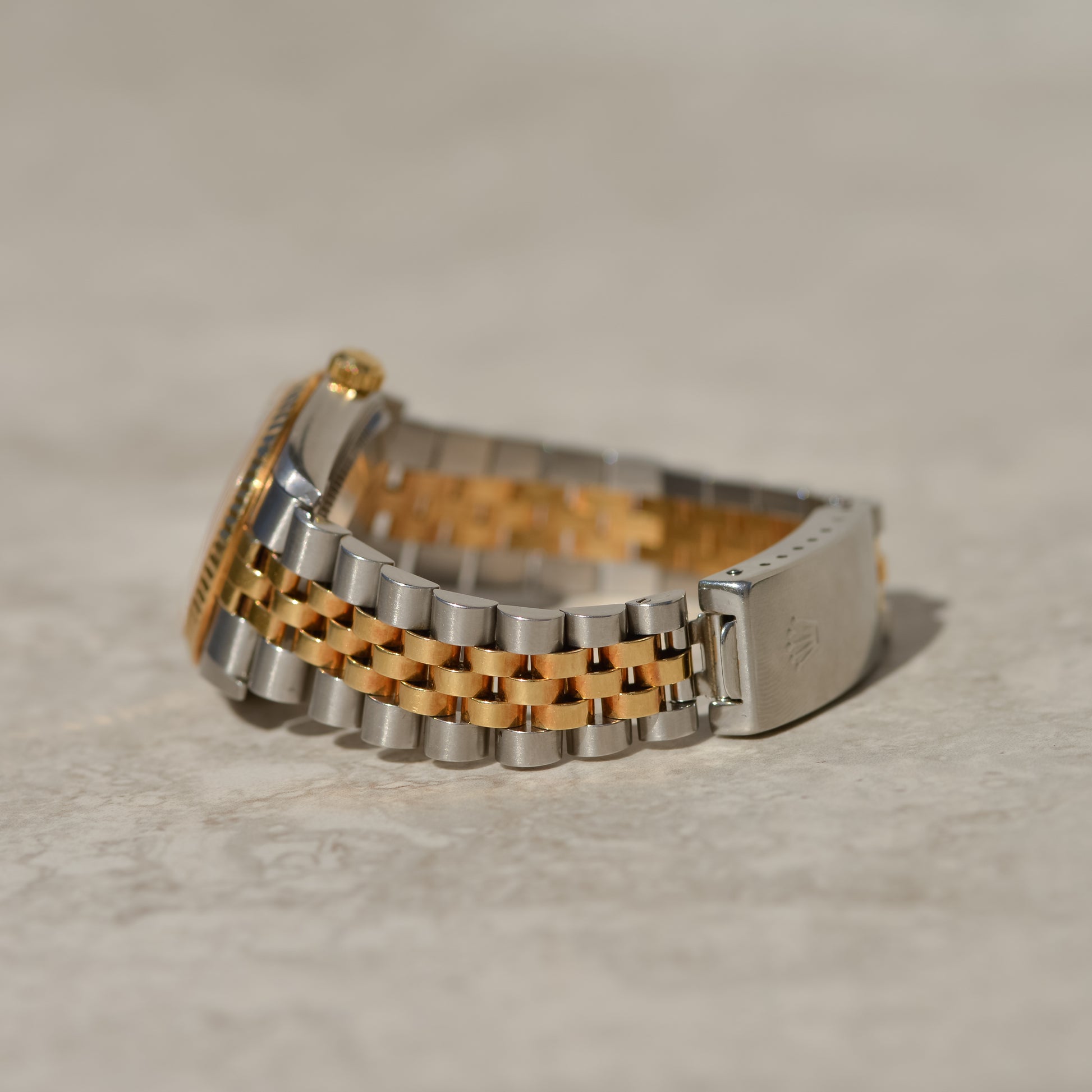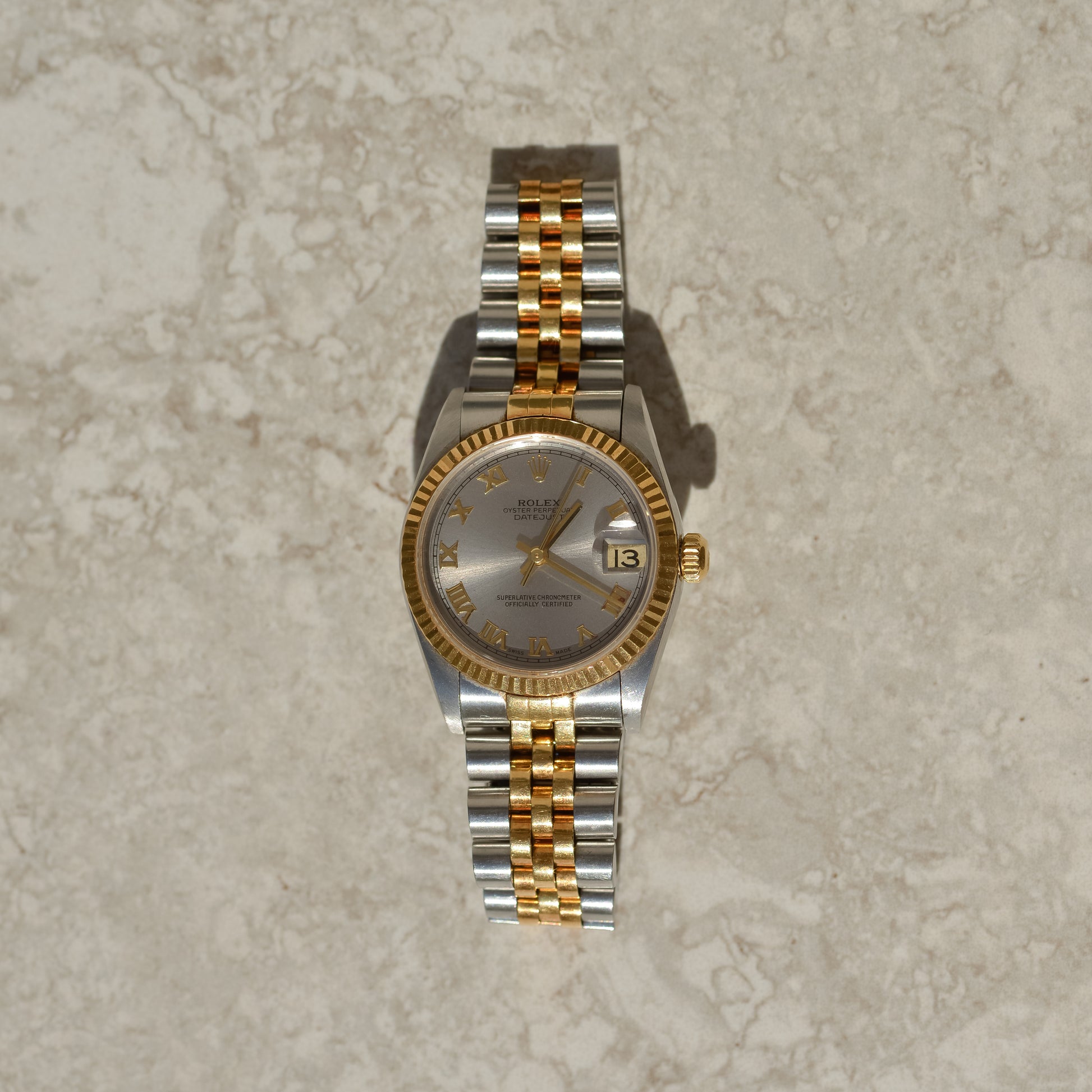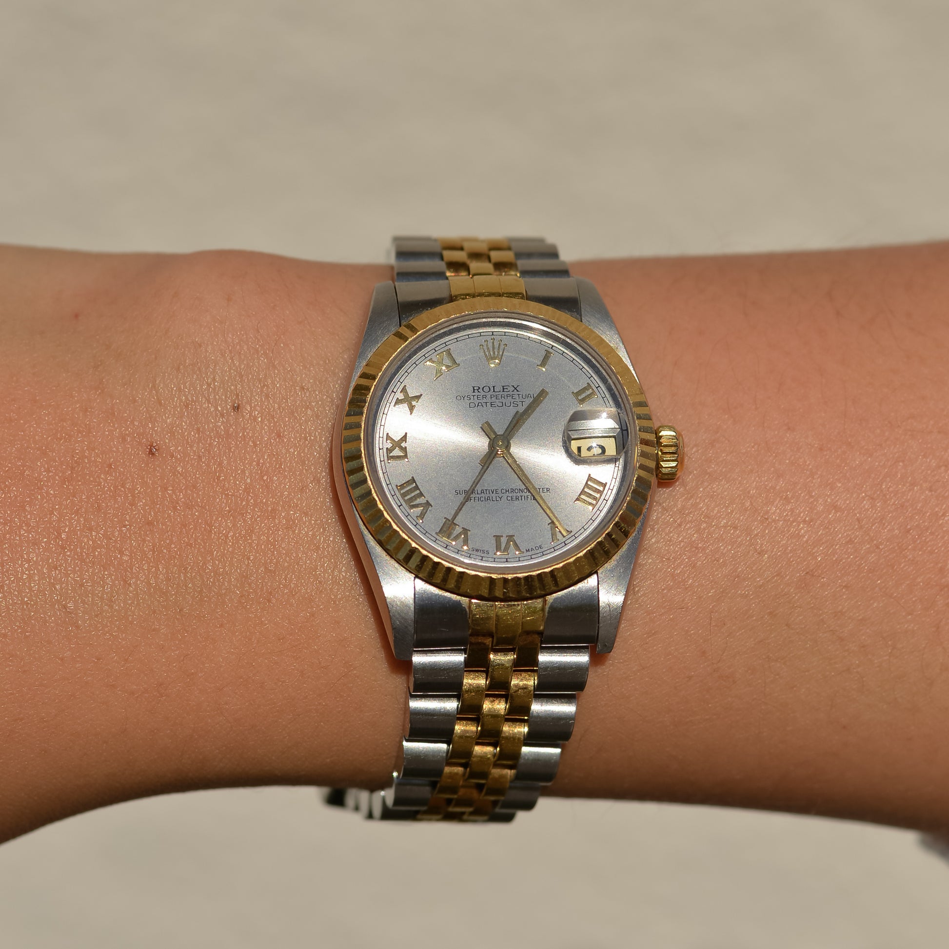 Featuring the emblematic fluted bezel and a radiant silver sunray dial adorned with elegant gold Roman numerals, this reference's exudes elegance, feeling both classic and contemporary. With its versatile 31 mm case, this watch is a great entry point to the mid-range sizes. Perfect for larger wrists that feel like full sizes are too overpowering or difficult to stack with bracelets; or for smaller wrists looking for more wrist coverage than the small sizes offer.