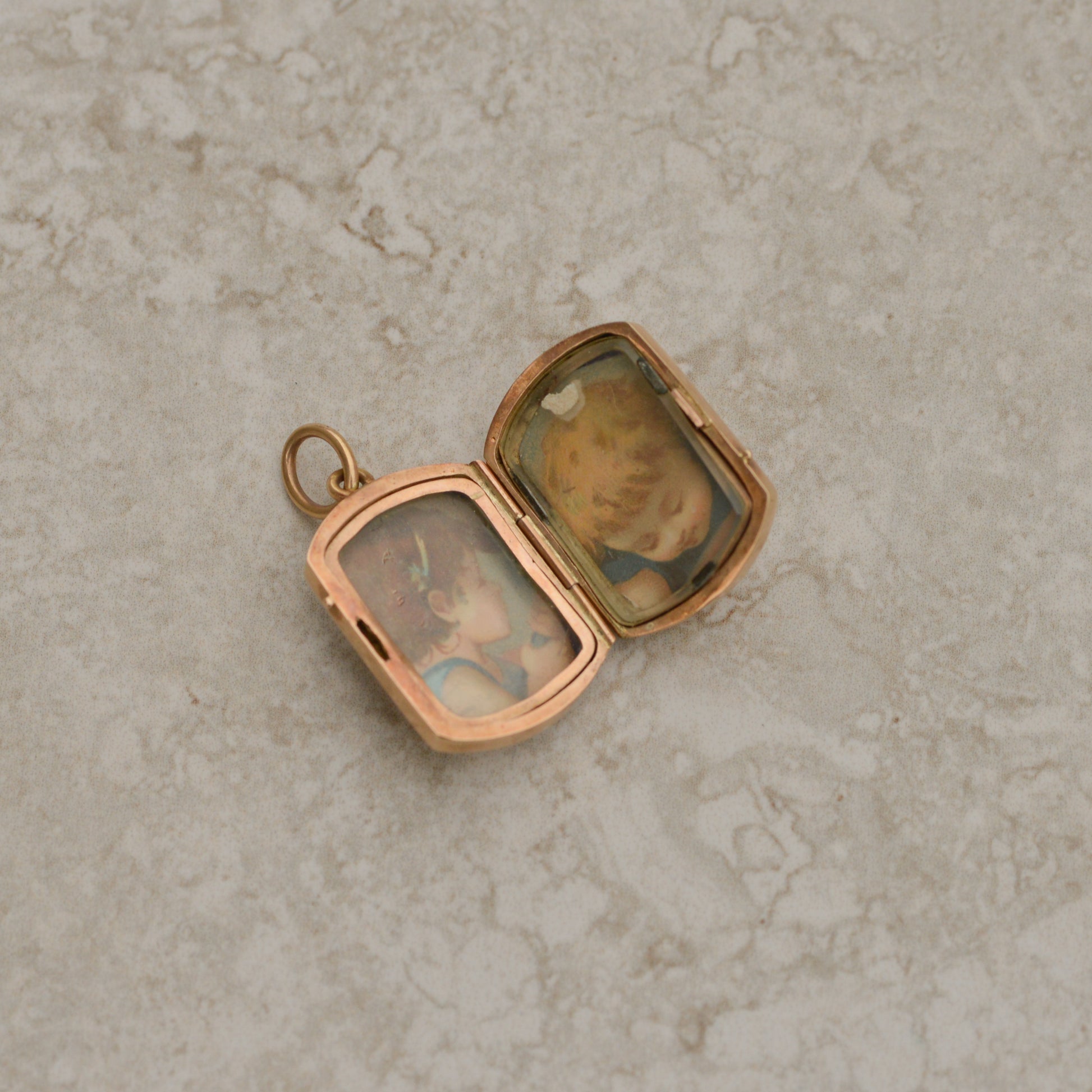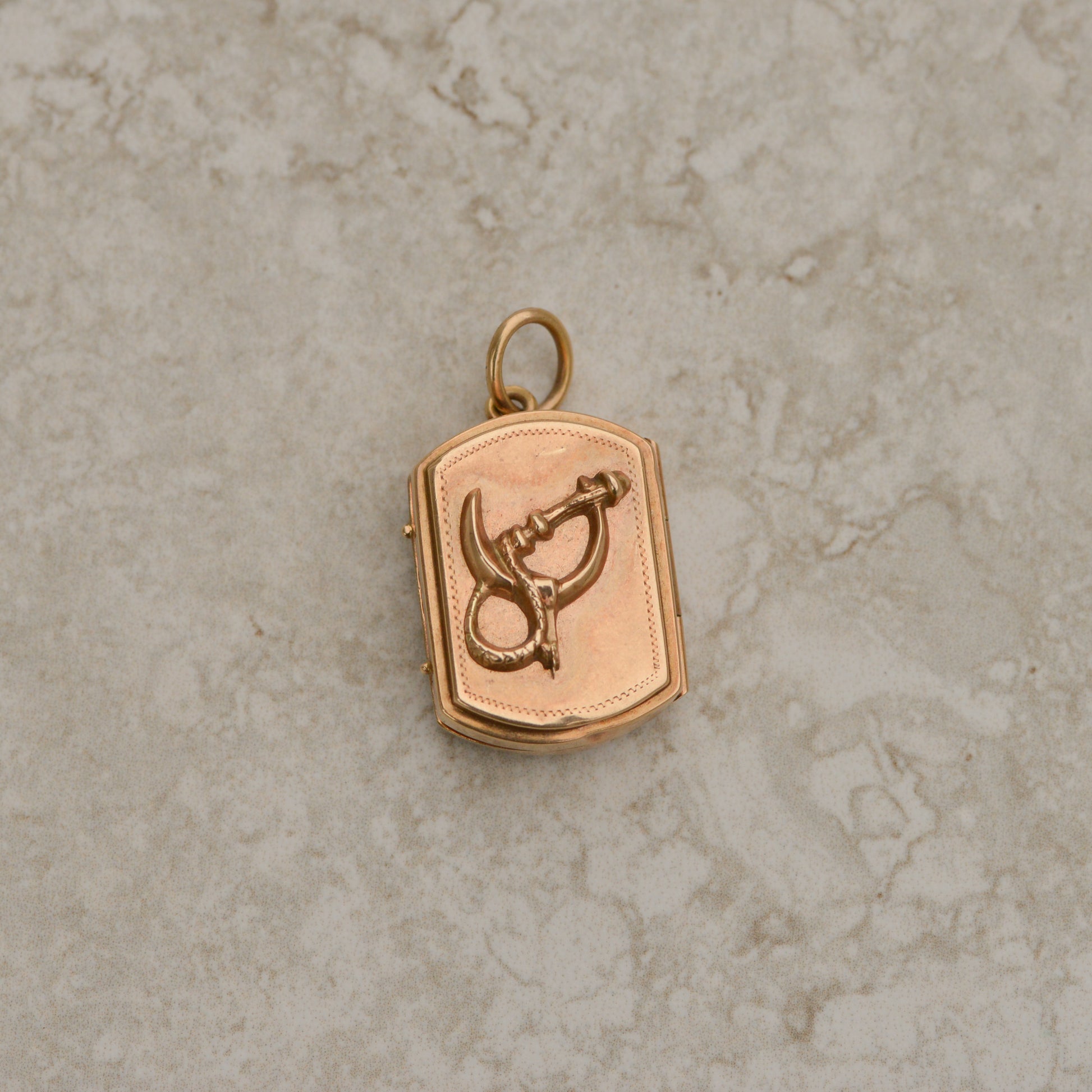 Antique Victorian era locket with equestrian themed detailing on the front: a stirrup and riding crop. Inserts and original photos are still inside, and the back is beautifully hand-engraved with flowers.