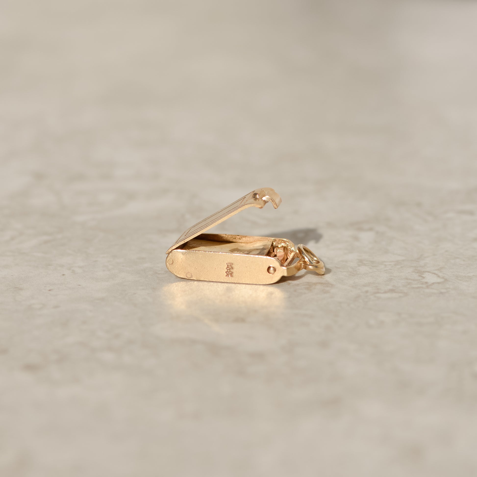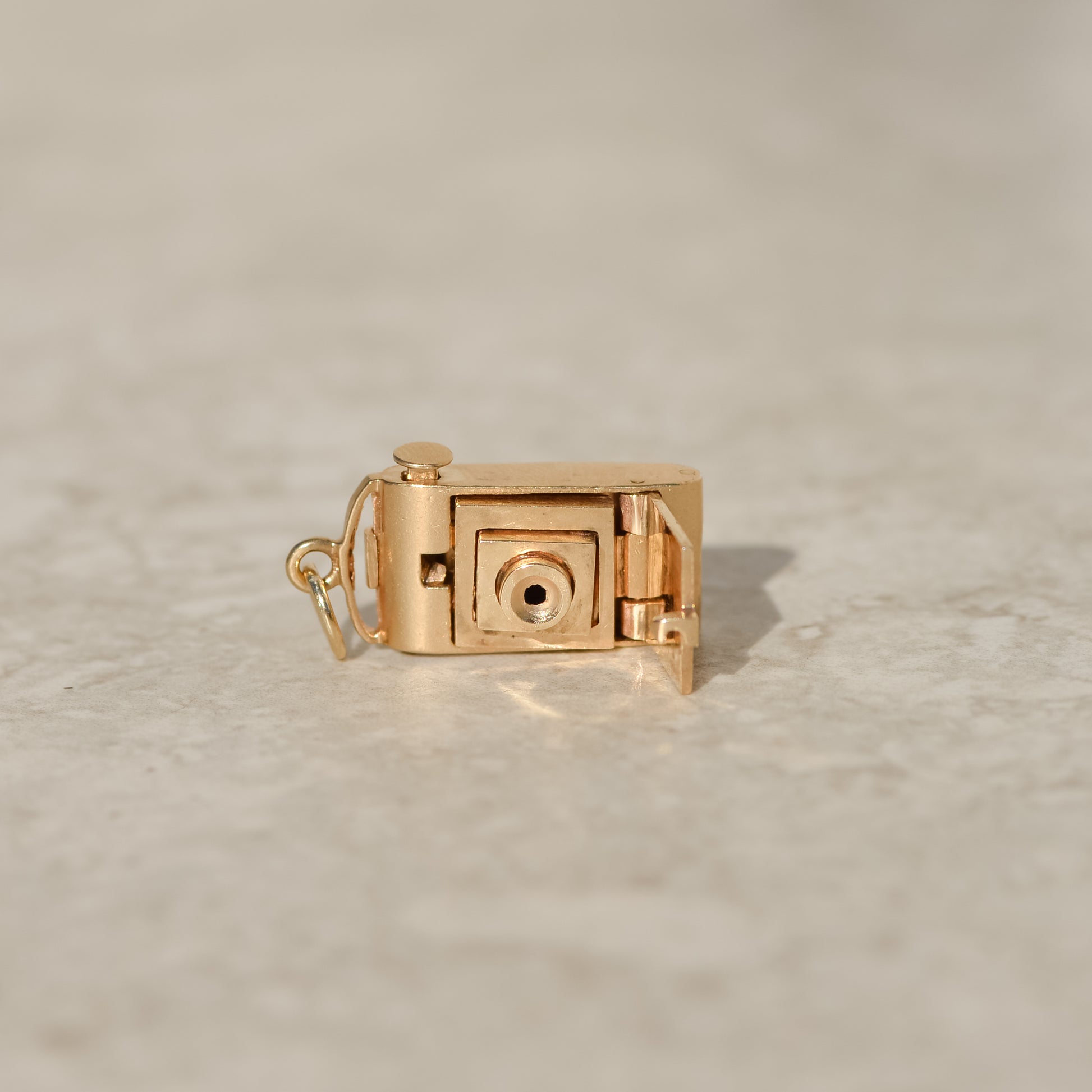 Vintage articulated camera charm- when you press the shutter button the camera pops out! Back of the camera also opens to allow you to store a photo inside.