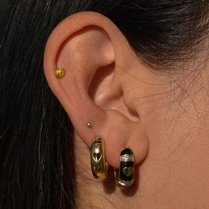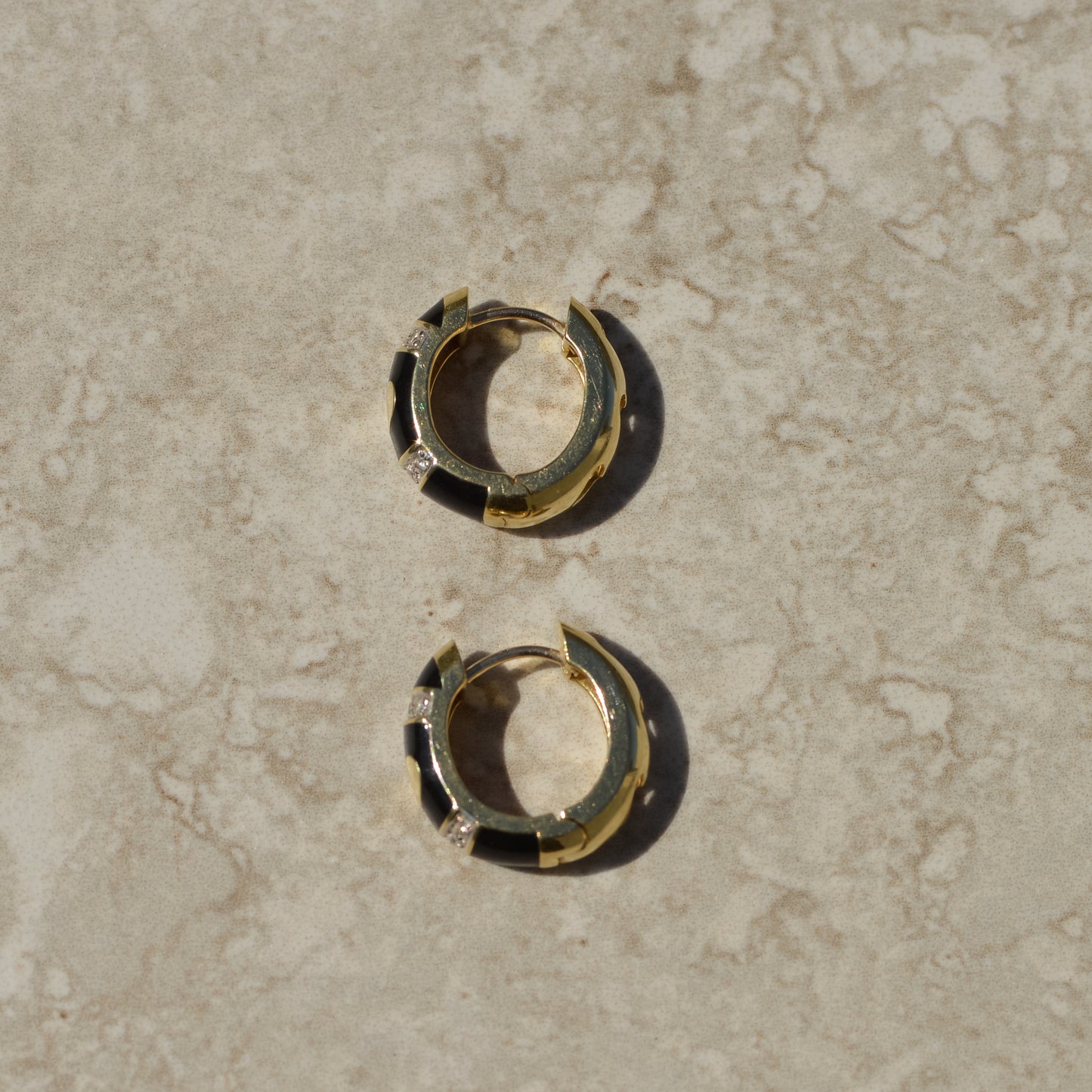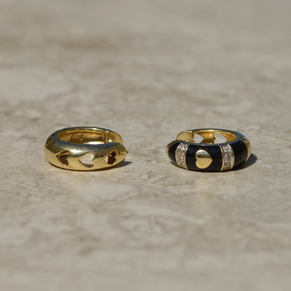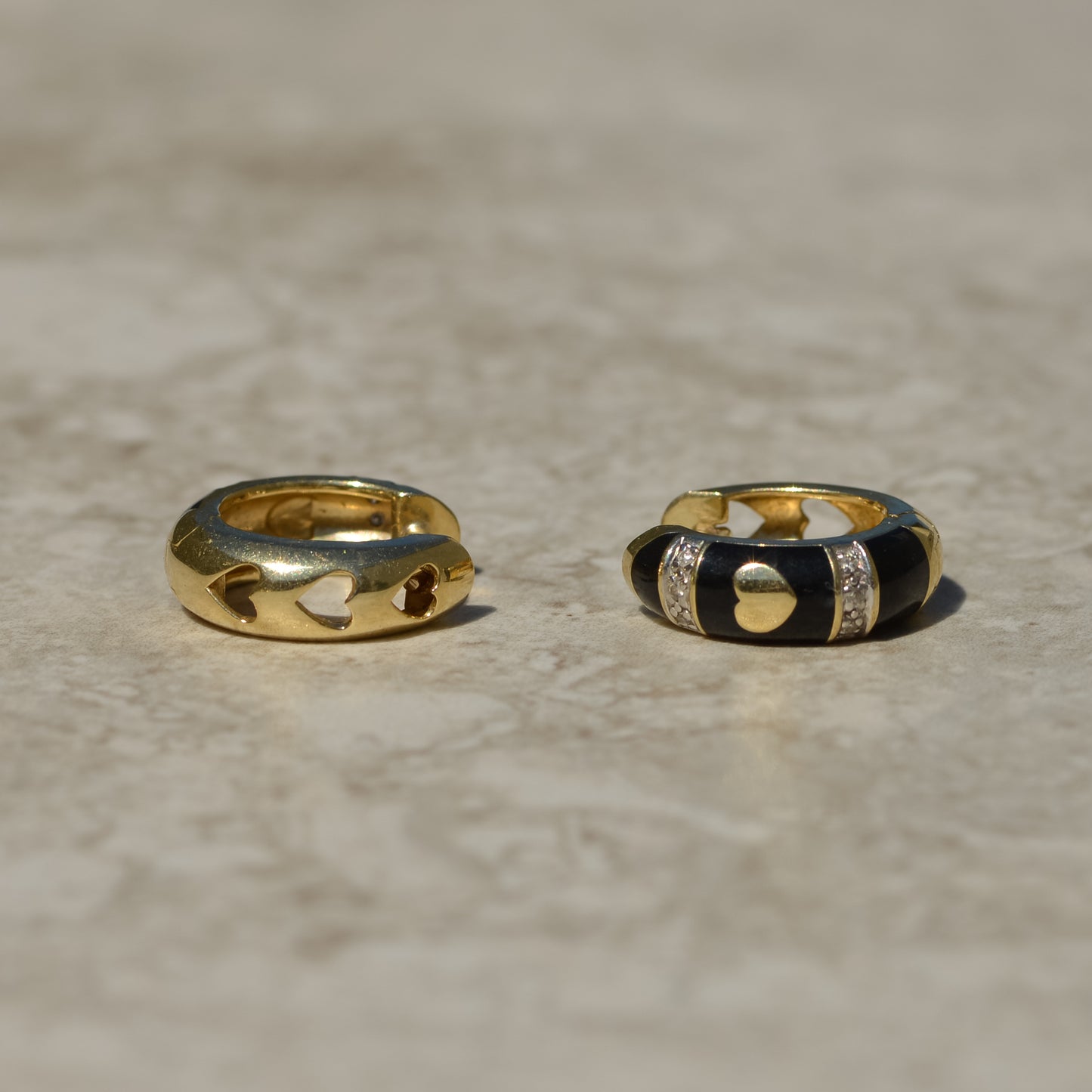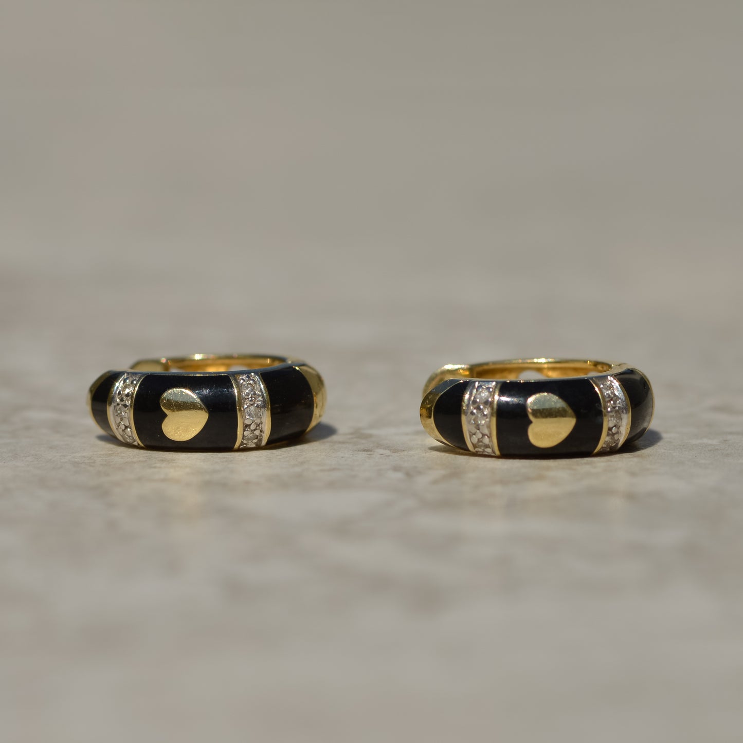 The cutest little hinged hoops with gold hearts and black enamel. Two rows of diamond accents add some sparkle, and the backs have heart cutouts. Hoops click into place to secure.
