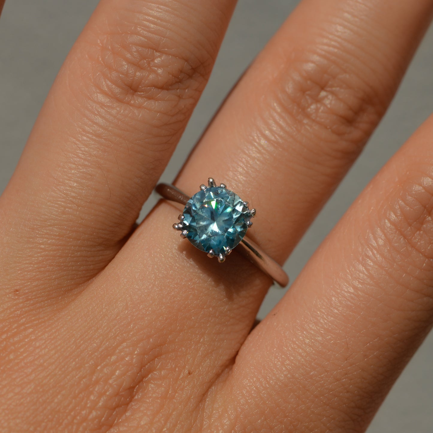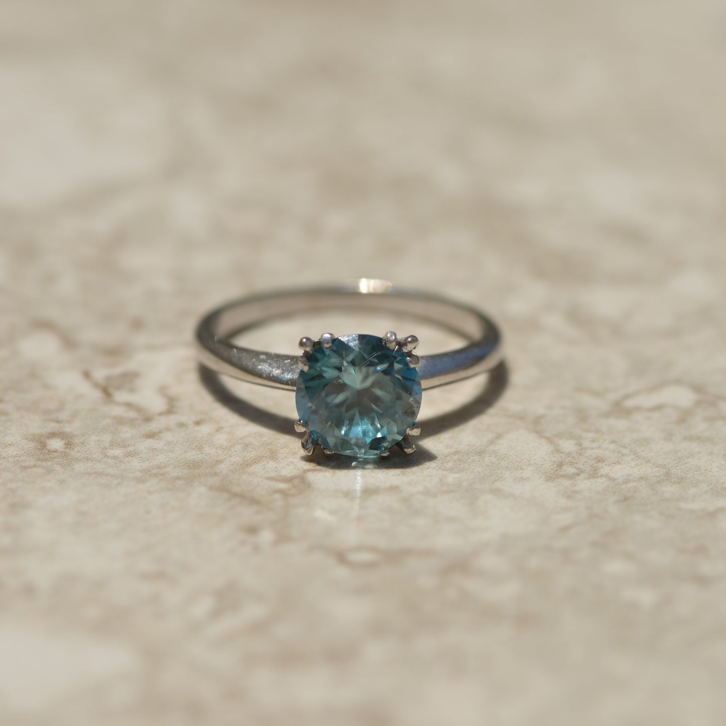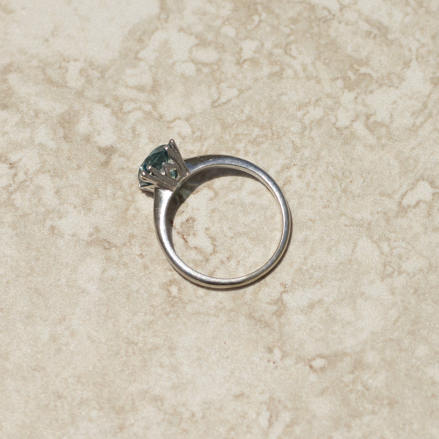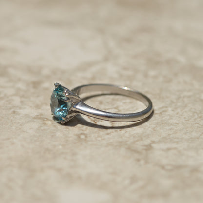 Art Deco style solitaire ring in white gold, featuring a natural light blue-green round cut zircon, with a captivating sparkle in the light. The setting is simple but elegant, with triple prongs forming a square around the center stone, a decorative gallery, and slight knife-edge detail. 2 mm band, 8.2 mm diameter zircon, approx. 2.6 ct.