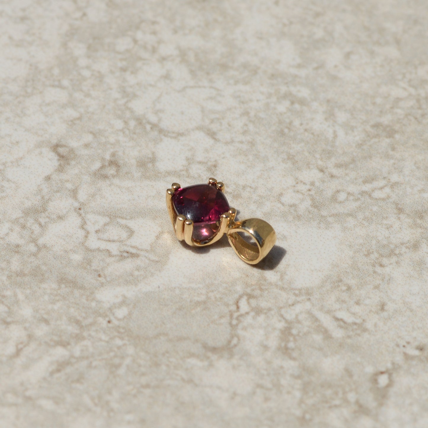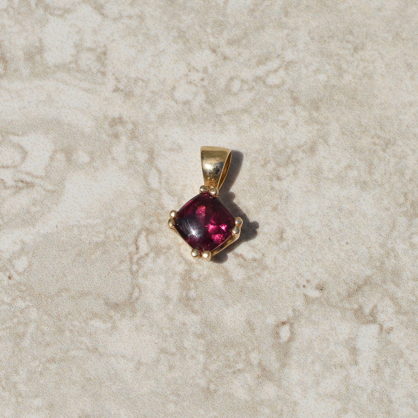 A cute raspberry red rhodolite garnet charm, cut in a square buff top en cabochon on top, with facets on the bottom.
