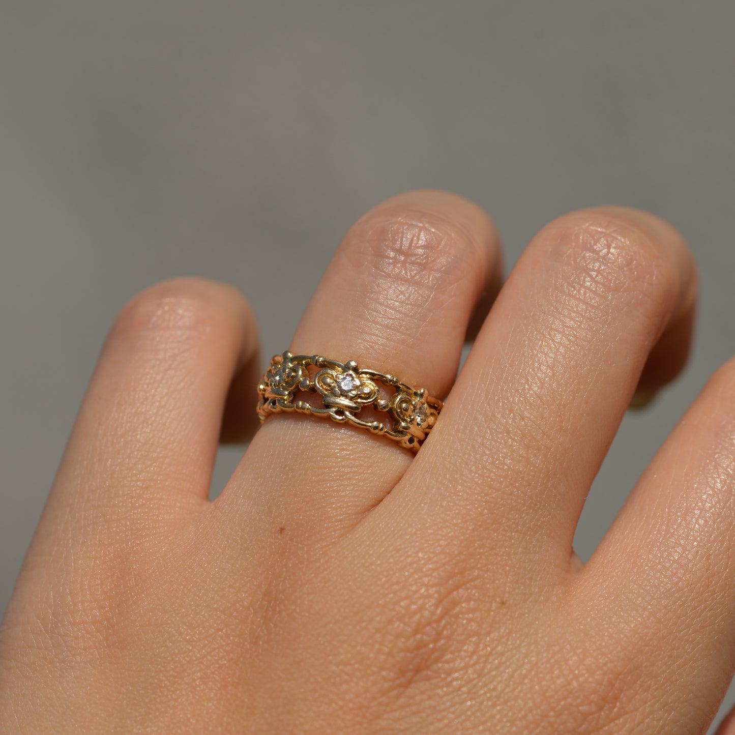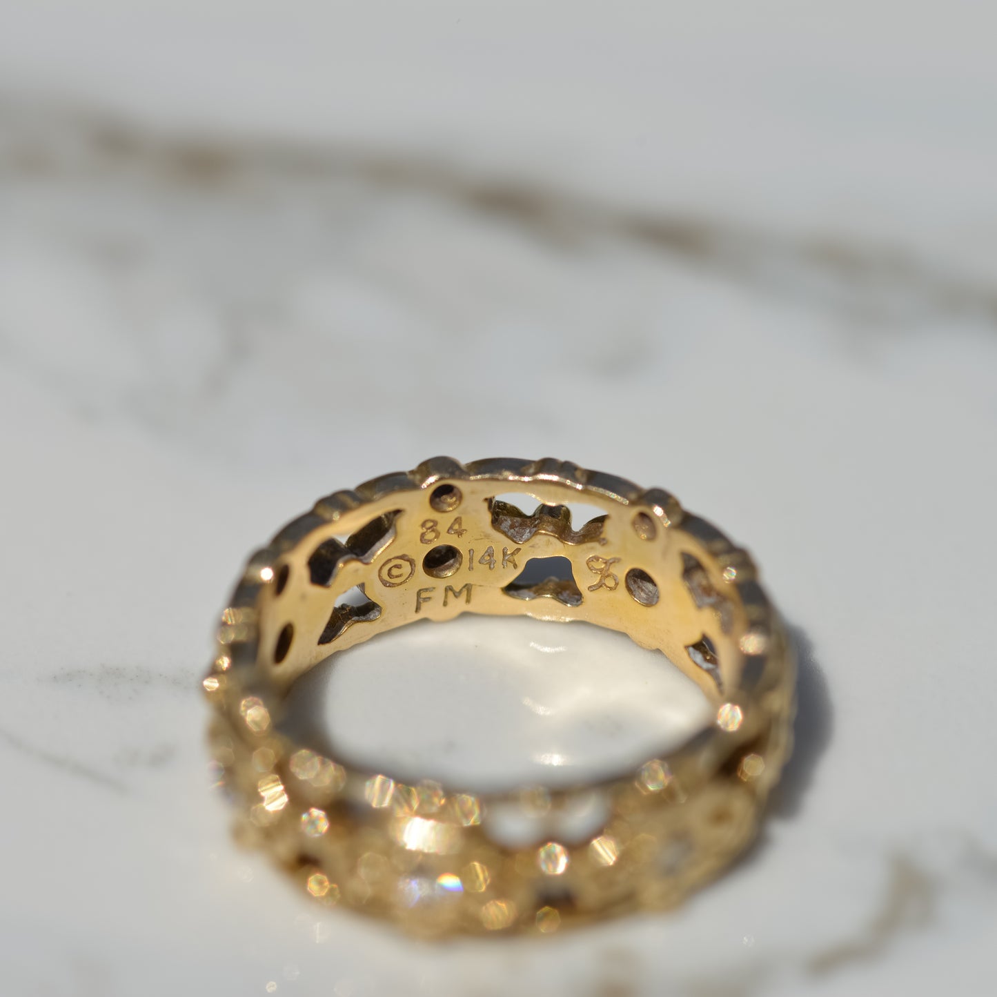 Wide openwork band with a crown design, set with diamonds on each crown, in an eternity style that goes all around the band. Approx. 0.17 carats diamonds, 6.7 mm width.