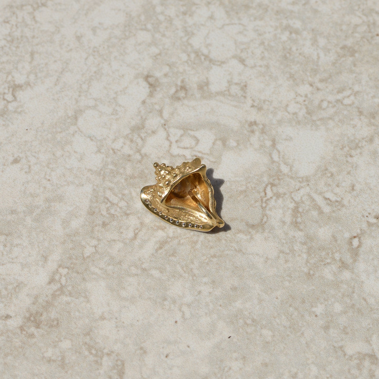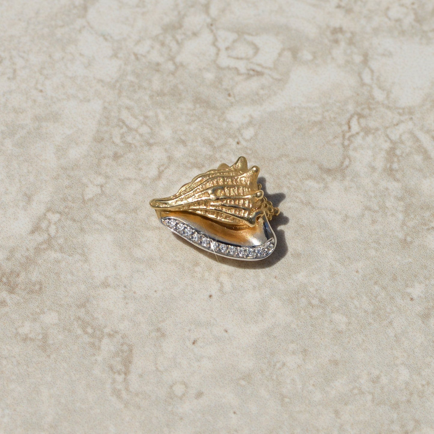 Slider pendant of a conch shell, beautifully detailed and with a matte finish. A pavé set row of 12 diamonds adorns the edge, approximately 0.12 carats.