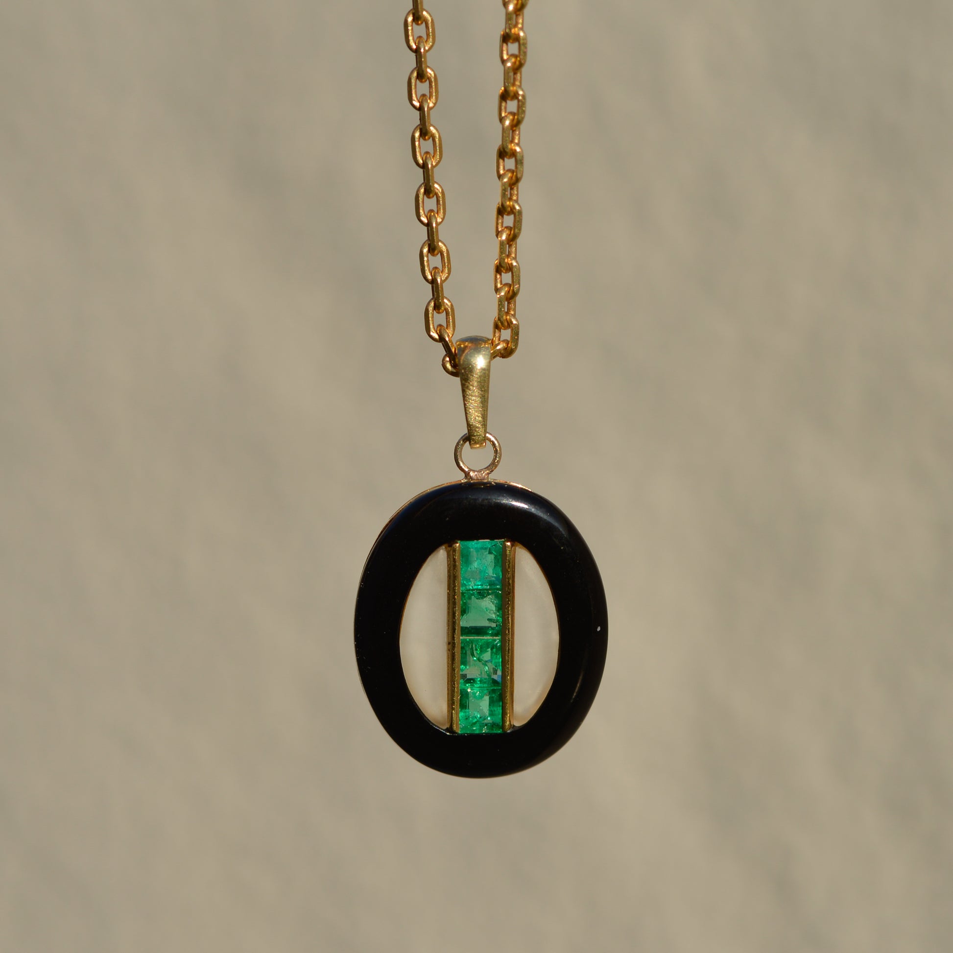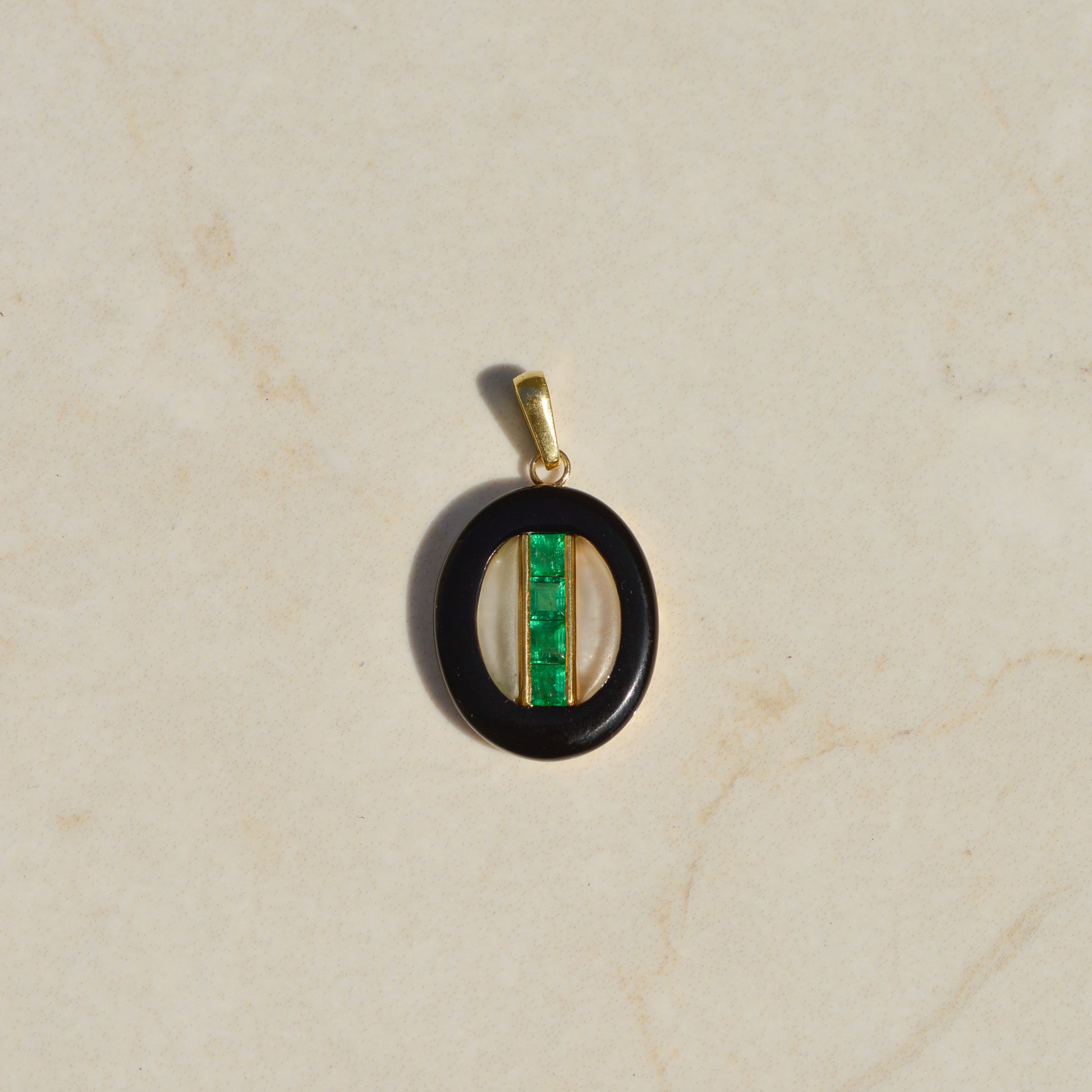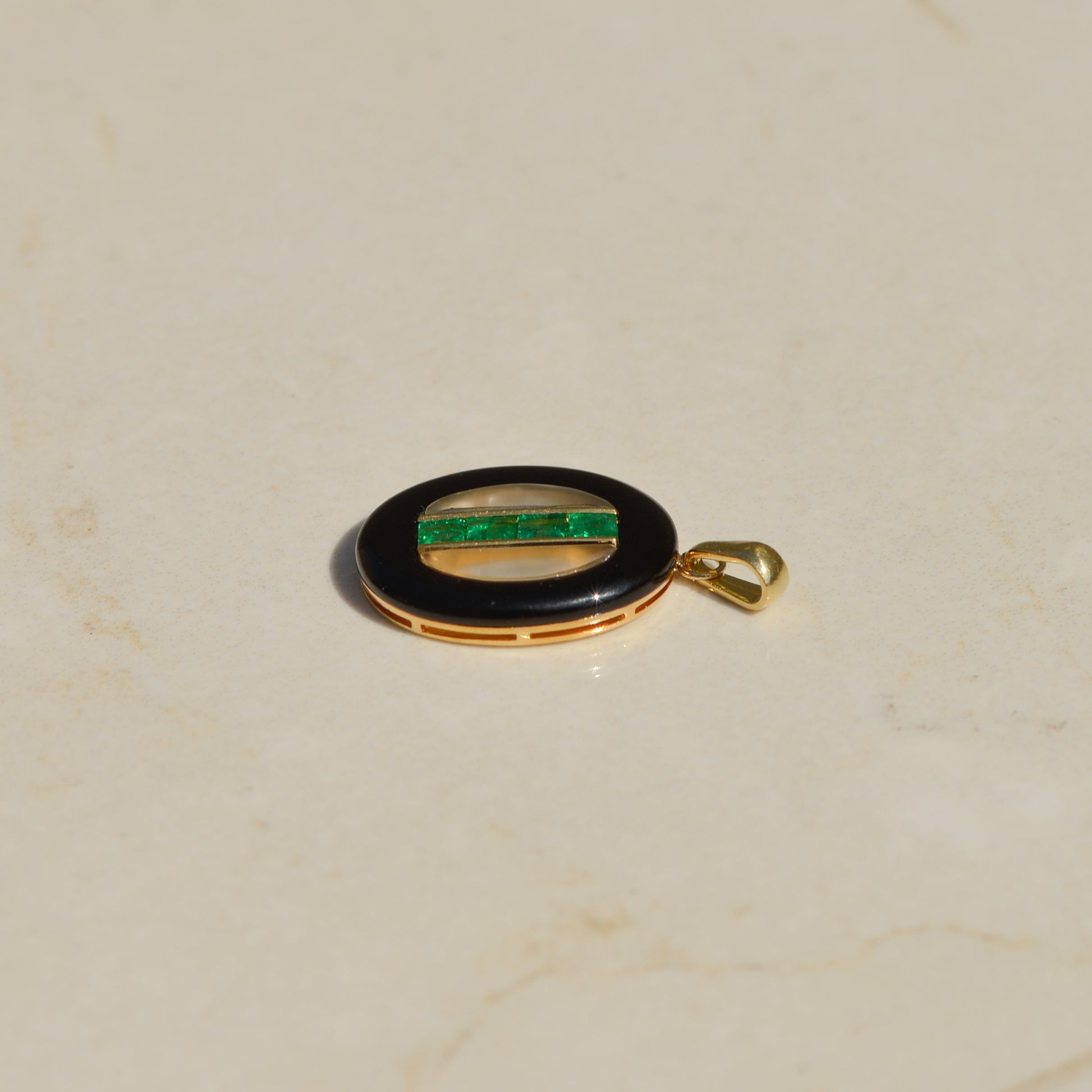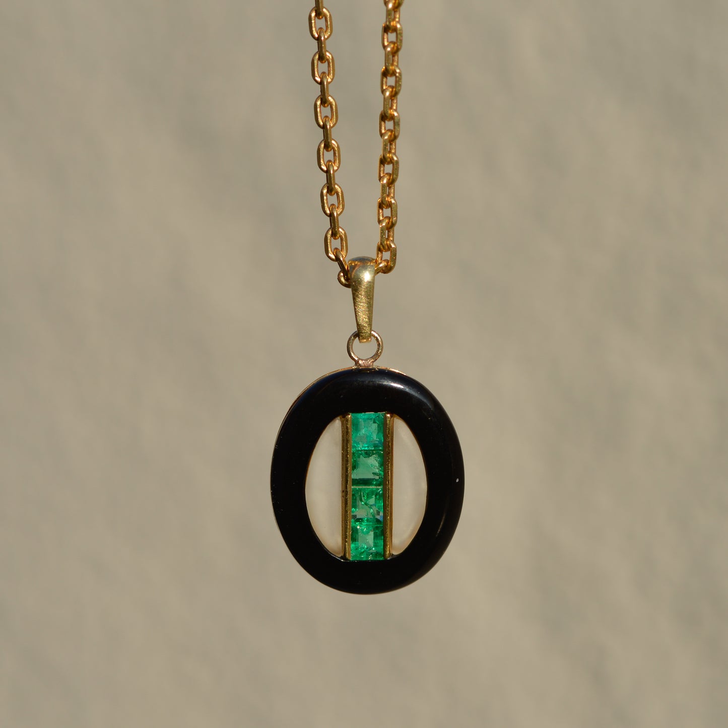 Art Deco pendant with a striking combination of gemstones: a row of vibrant green square-cut emeralds channel-set down the center, with a carved half moon of frosted rock crystal on each side, encircled with carved black onyx. Combing several classic elements of Deco design we love and have endured the test of time-- bold color, carved stone, geometric lines, and channel settings.