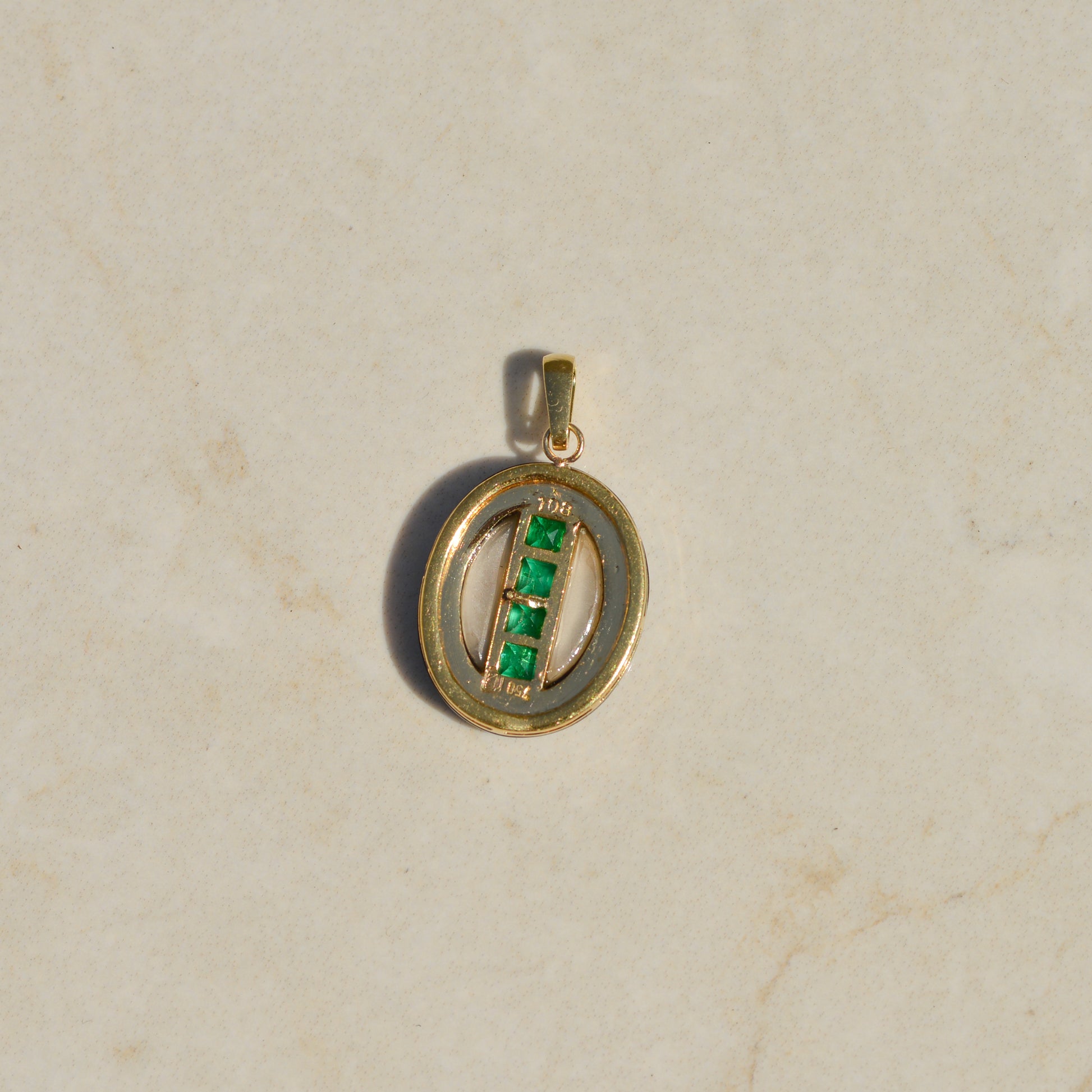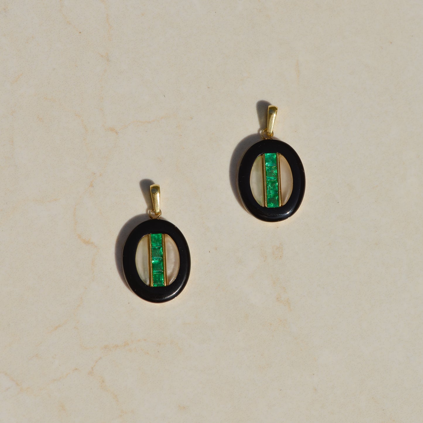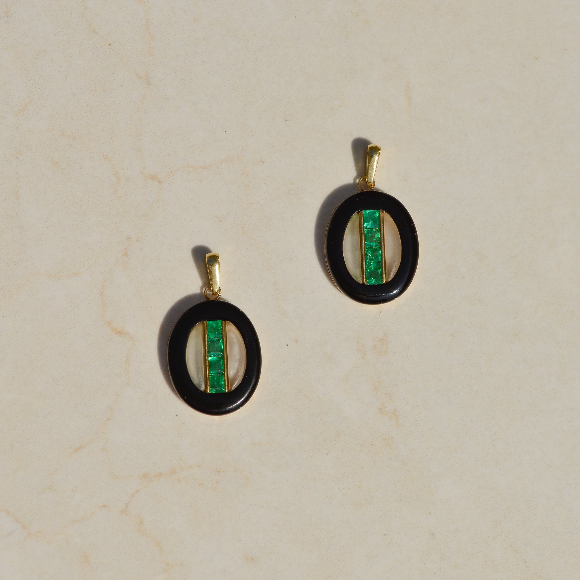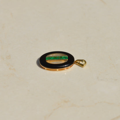 Art Deco pendant with a striking combination of gemstones: a row of vibrant green square-cut emeralds channel-set down the center, with a carved half moon of frosted rock crystal on each side, encircled with carved black onyx. Combing several classic elements of Deco design we love and have endured the test of time-- bold color, carved stone, geometric lines, and channel settings.