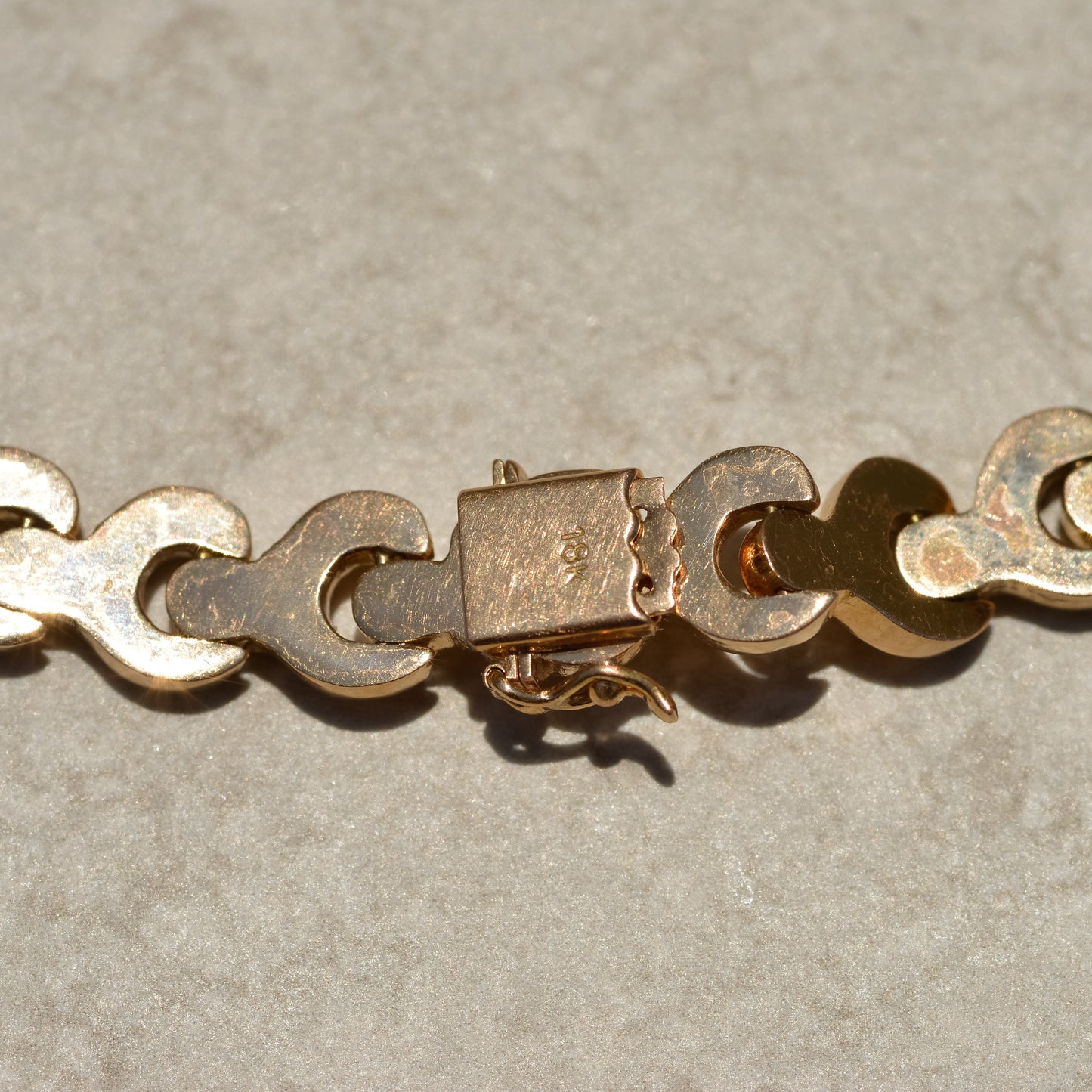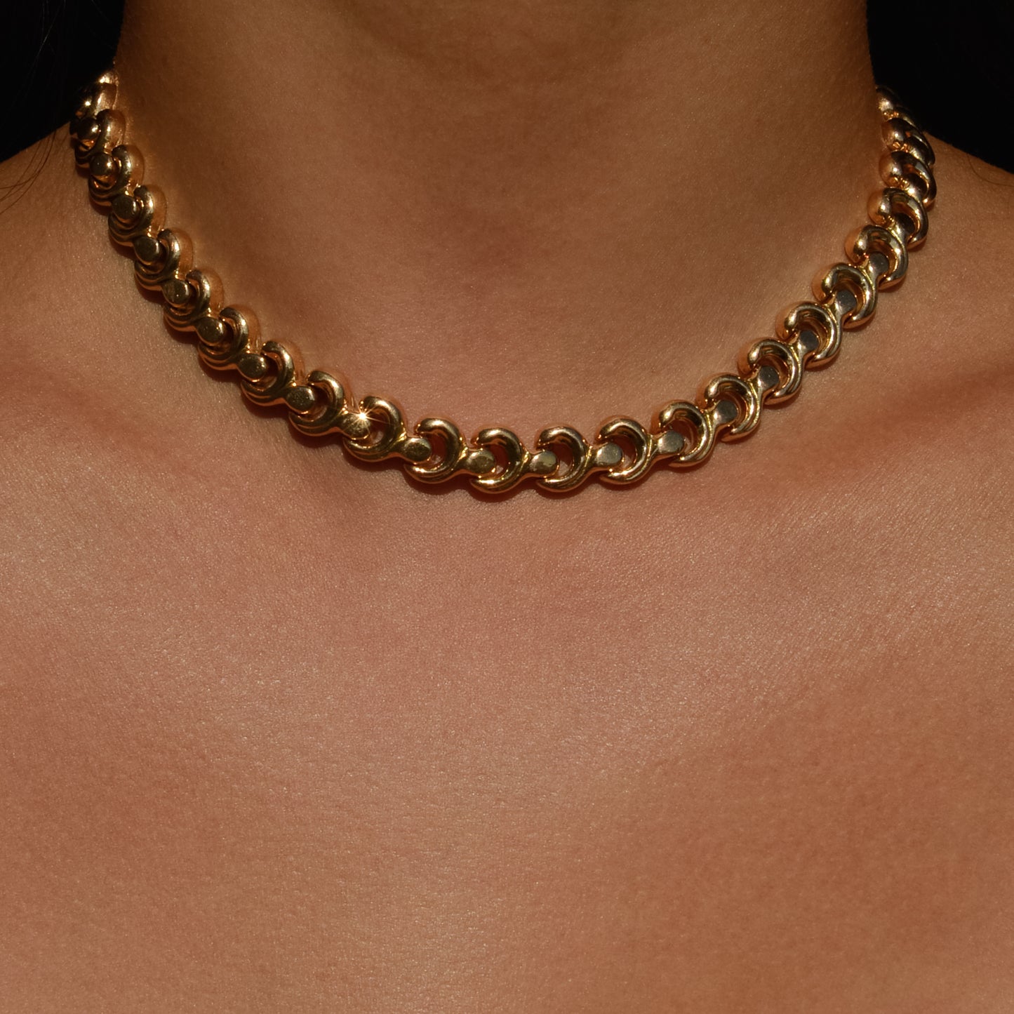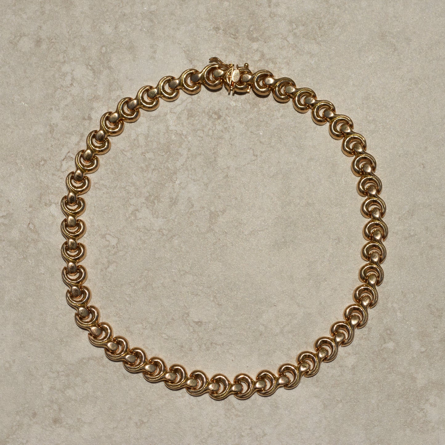 A vintage choker-length necklace with a pattern of curvy links. Slightly rosy-toned, somewhere in between rose and yellow gold. 9.8 mm width.