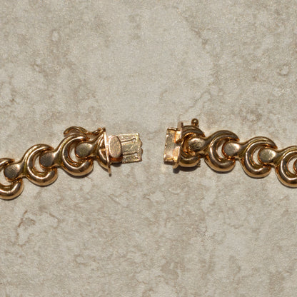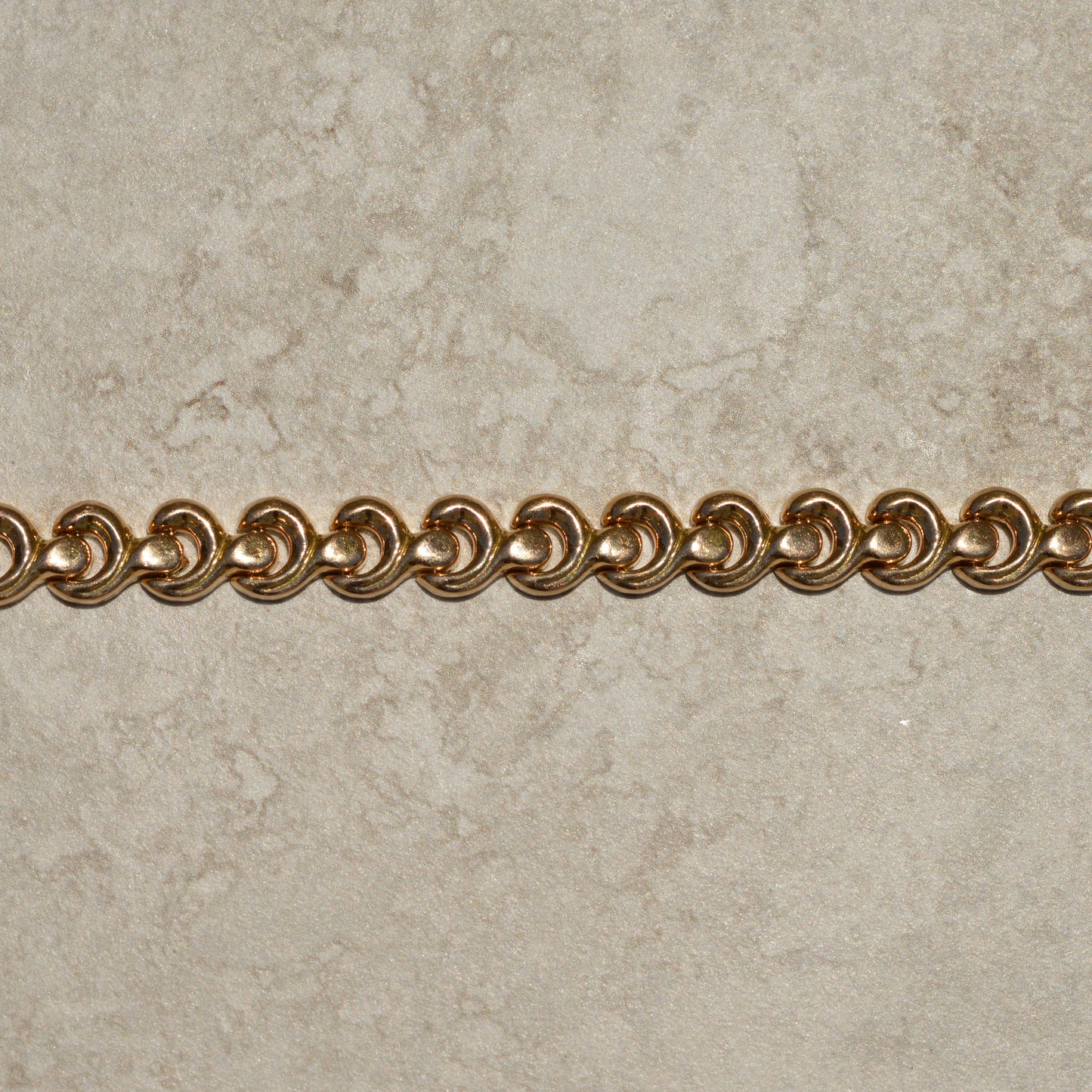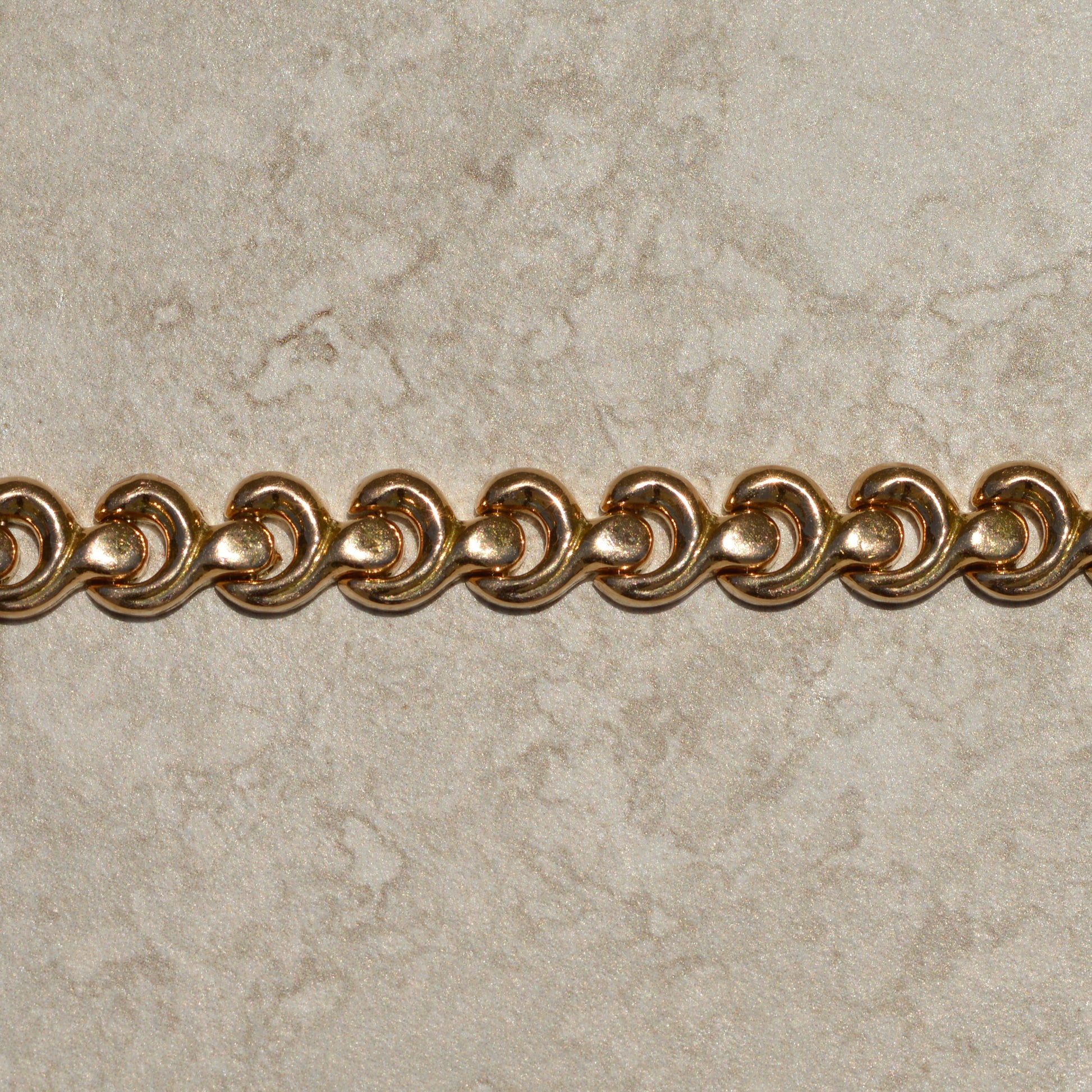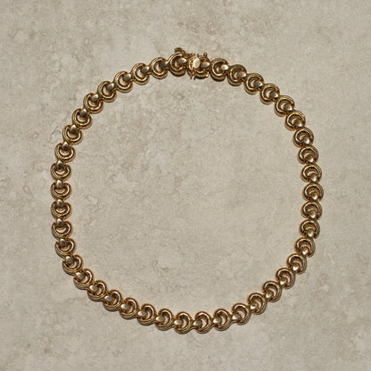 A vintage choker-length necklace with a pattern of curvy links. Slightly rosy-toned, somewhere in between rose and yellow gold. 9.8 mm width.