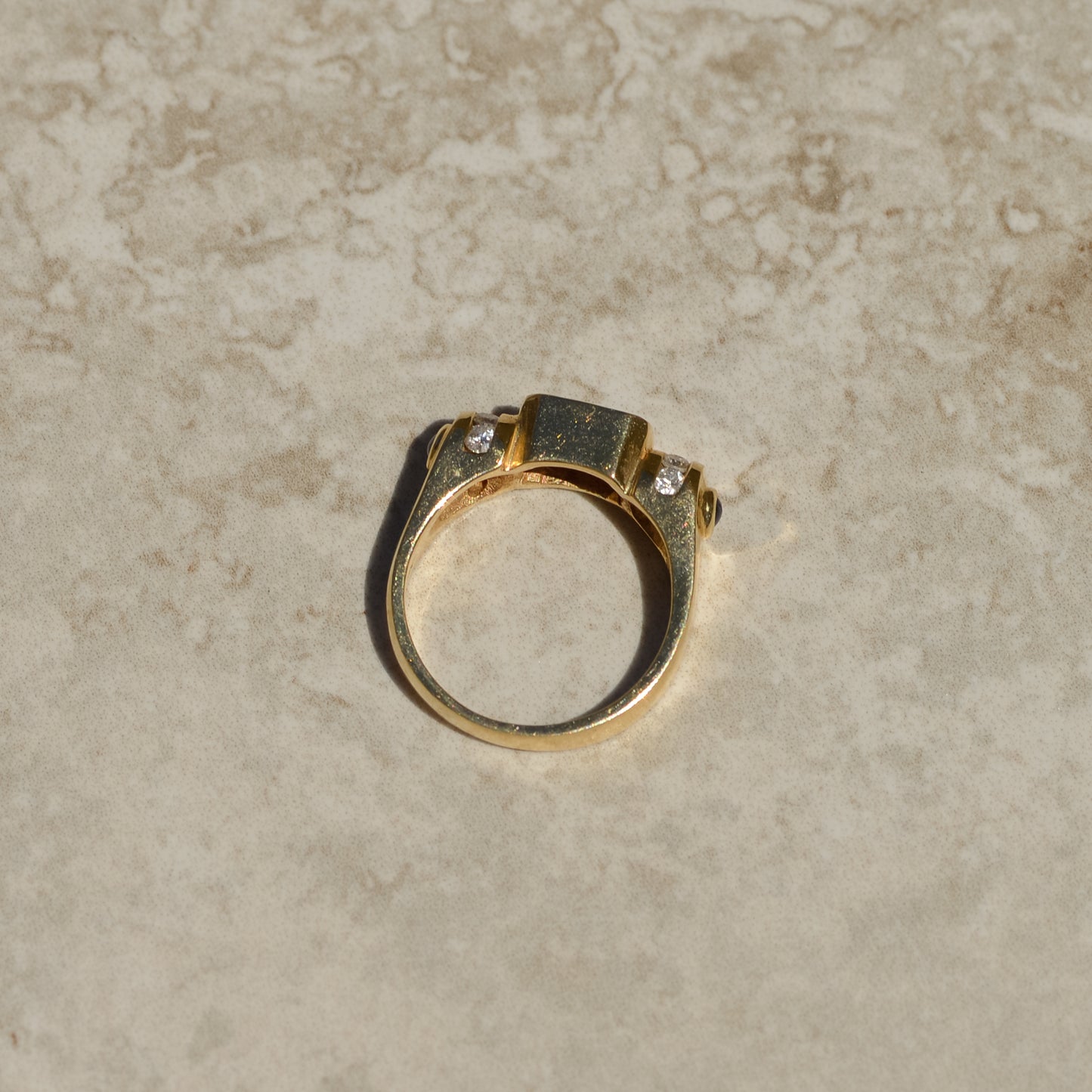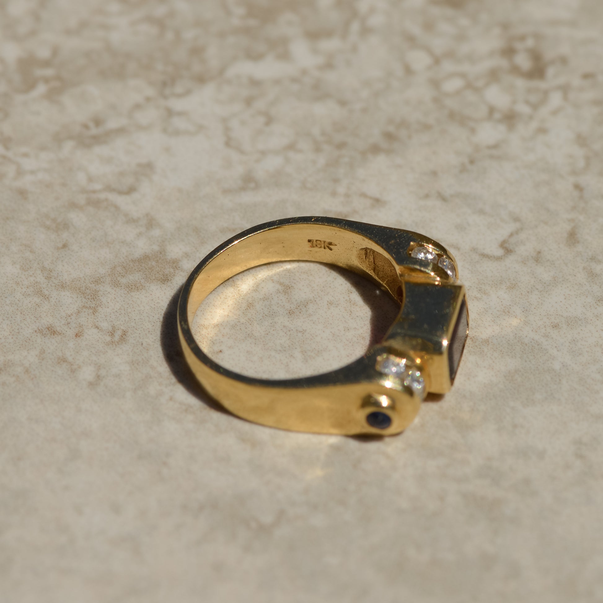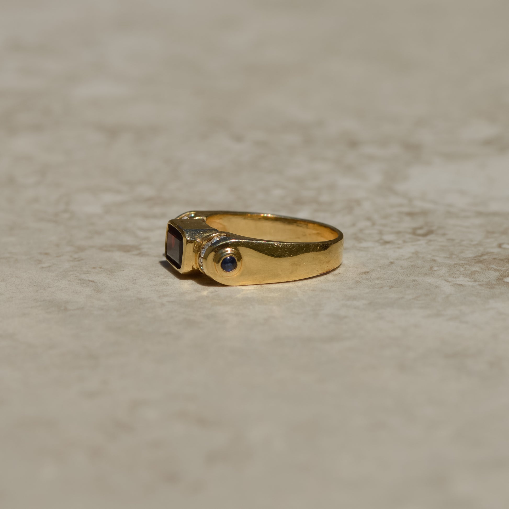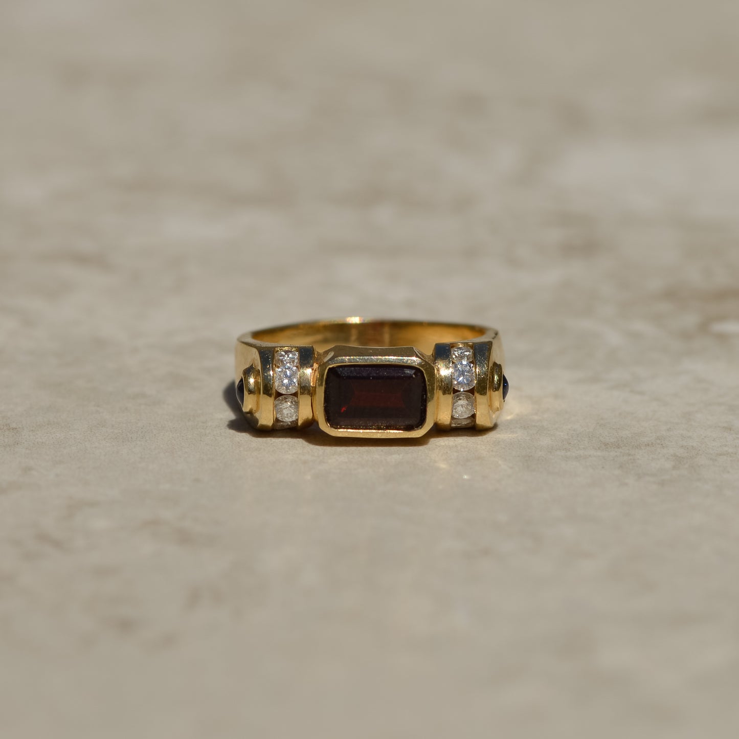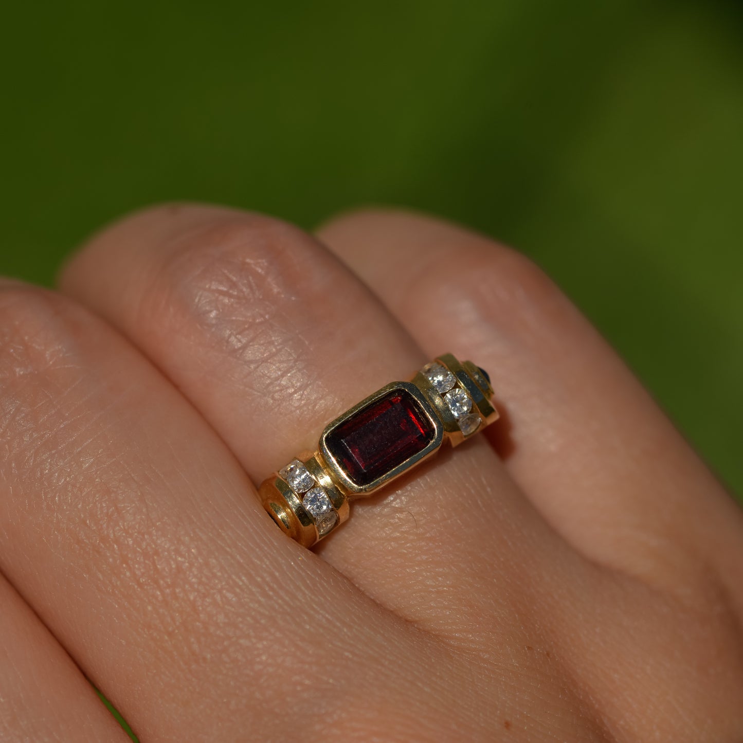 Vintage ring with a deep red emerald-cut garnet, with diamonds set in a circular channel on each side, and blue sapphire cabochons on the shoulders. A lovely geometric design inspired by retro tank rings.