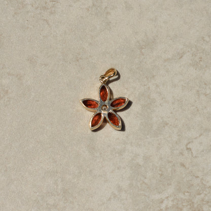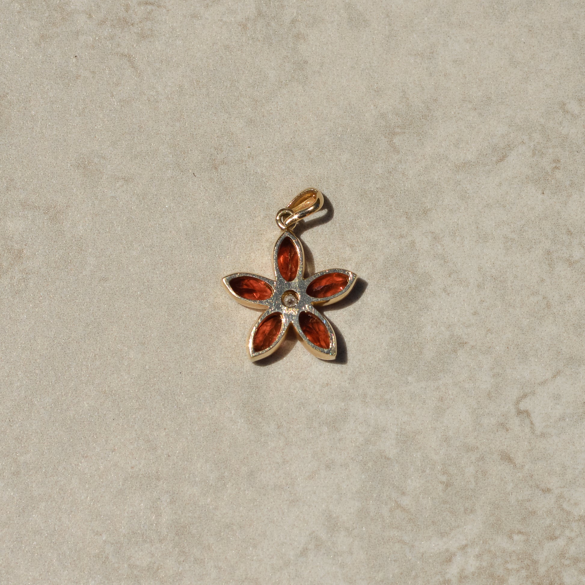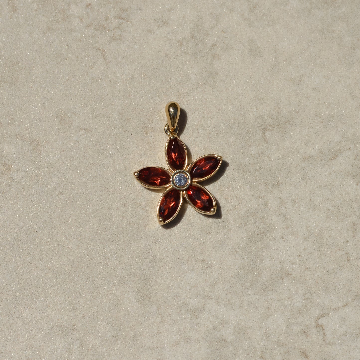 Vintage flower charm with five marquise-cut garnets as the petals, and a round cut diamond center.