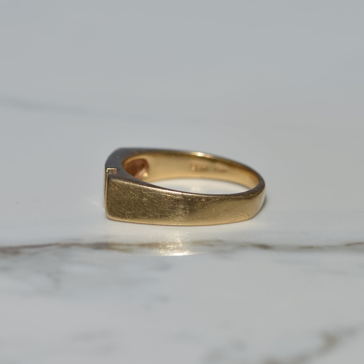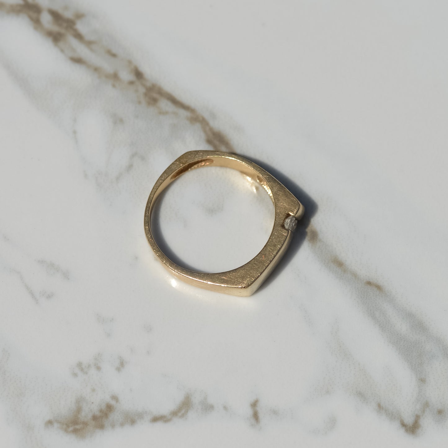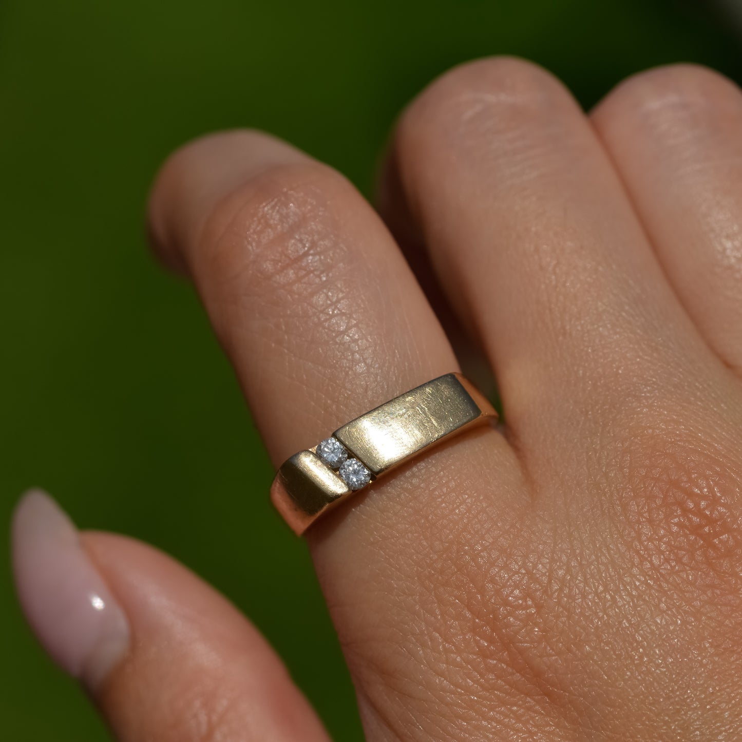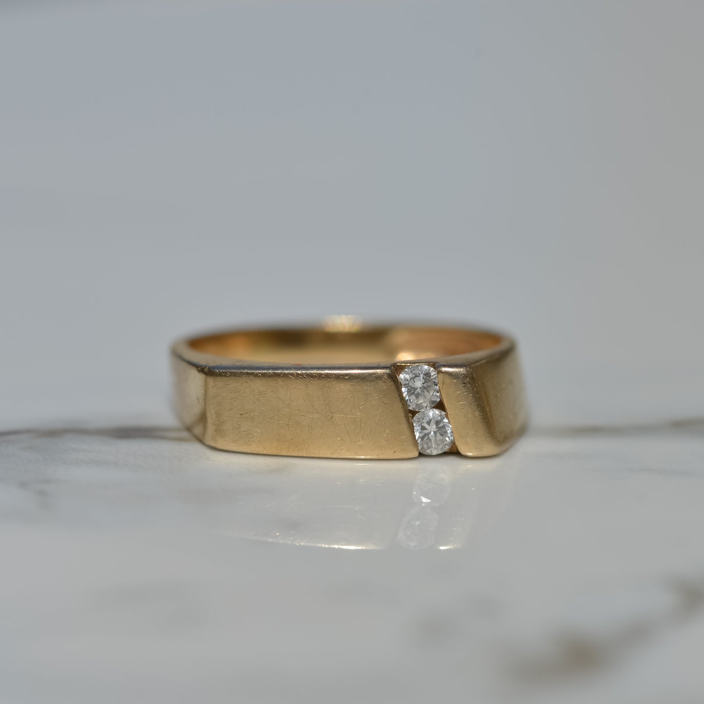 Vintage signet style ring with two round brilliant diamonds set diagonally in the front. One side of the band has a square shank, while the other side is rounded. A great unisex stackable piece! Approx. 0.12 ct diamonds. 5.5 mm wide at front.