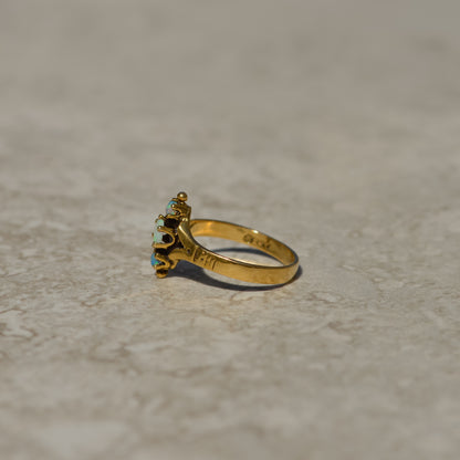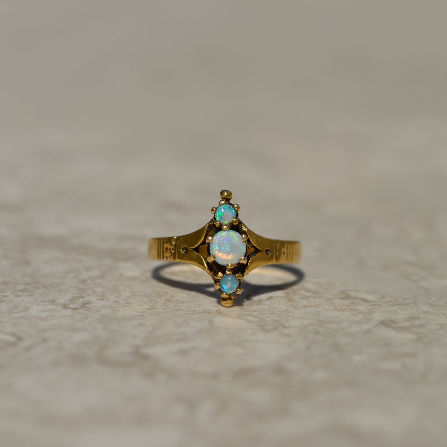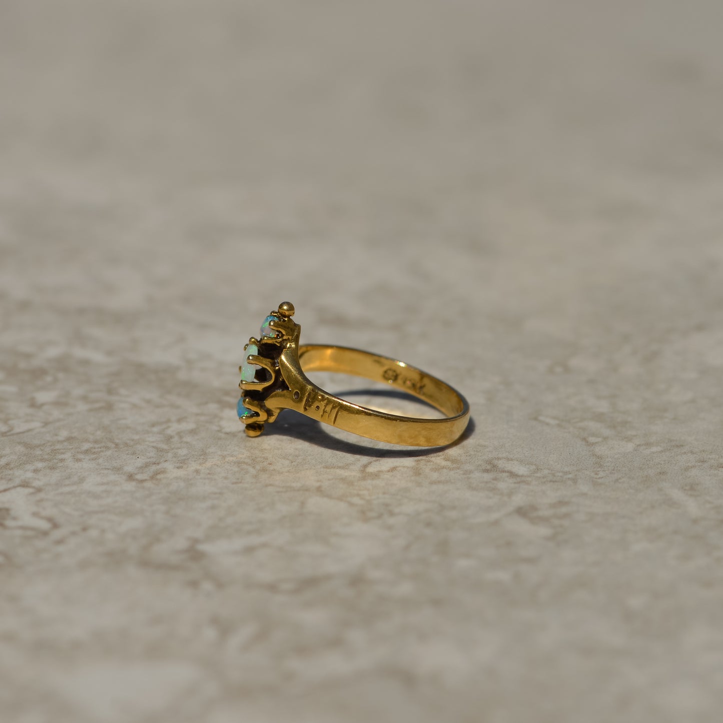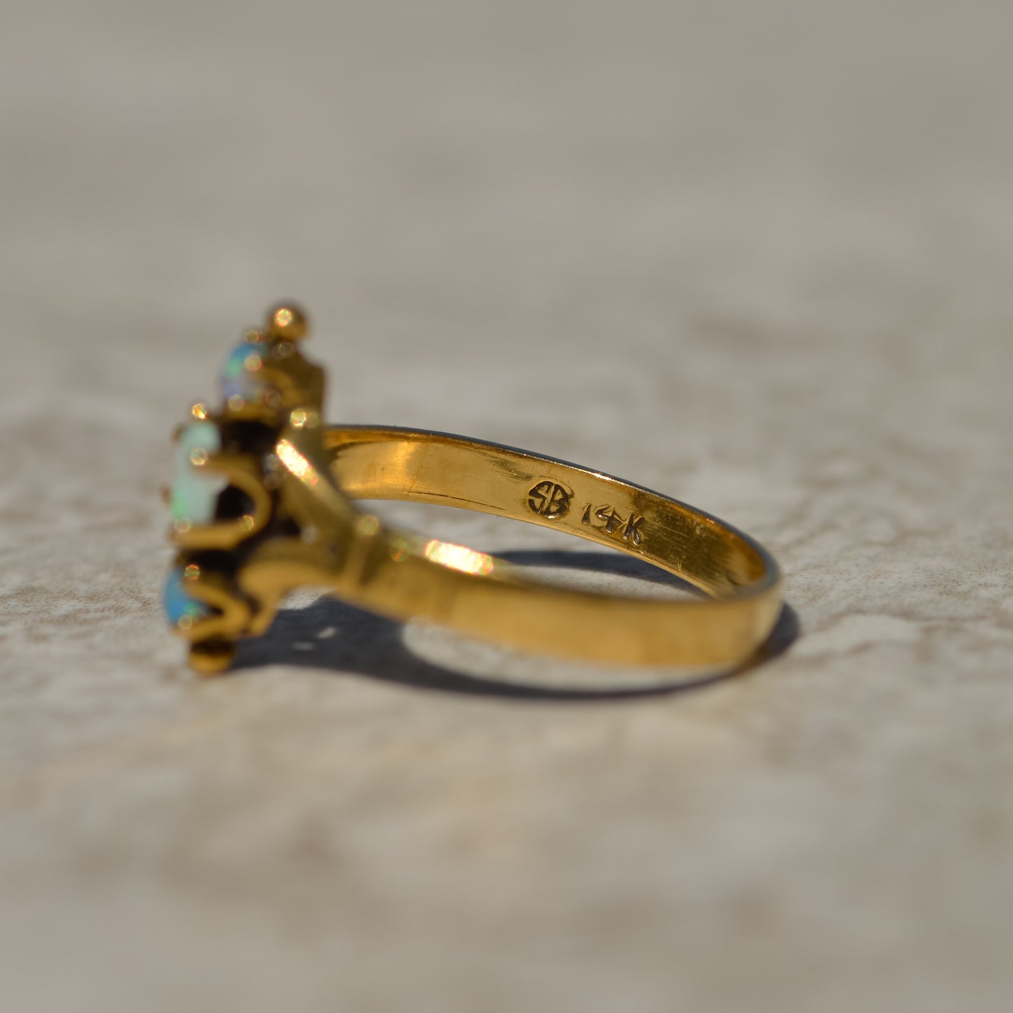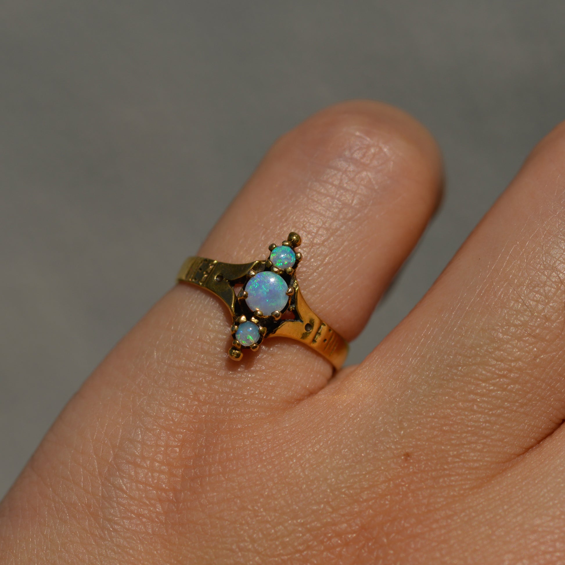Vintage Victorian revival ring, with three round firey opal cabochons, blue with green and purple play-of-color. A split shank and shoulder details complete the Victorian-inspired look.