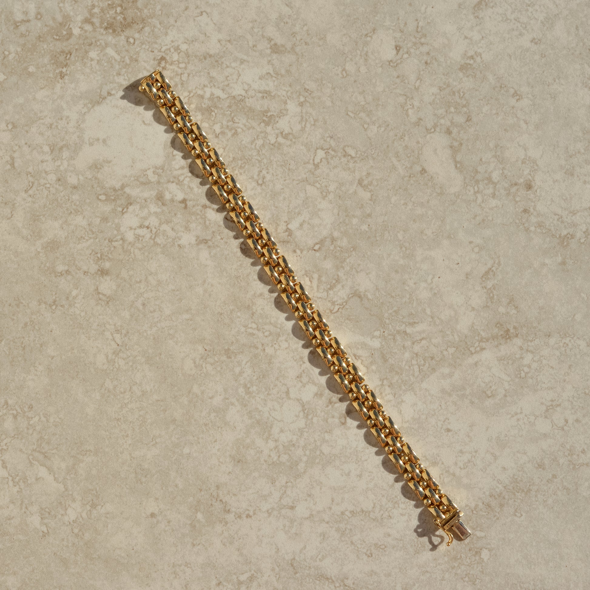 Vintage panther link bracelet, with small gold balls between the links. Finished with a sliding clasp with safety lock for a seamless look and secure fit. 8.1 mm width.