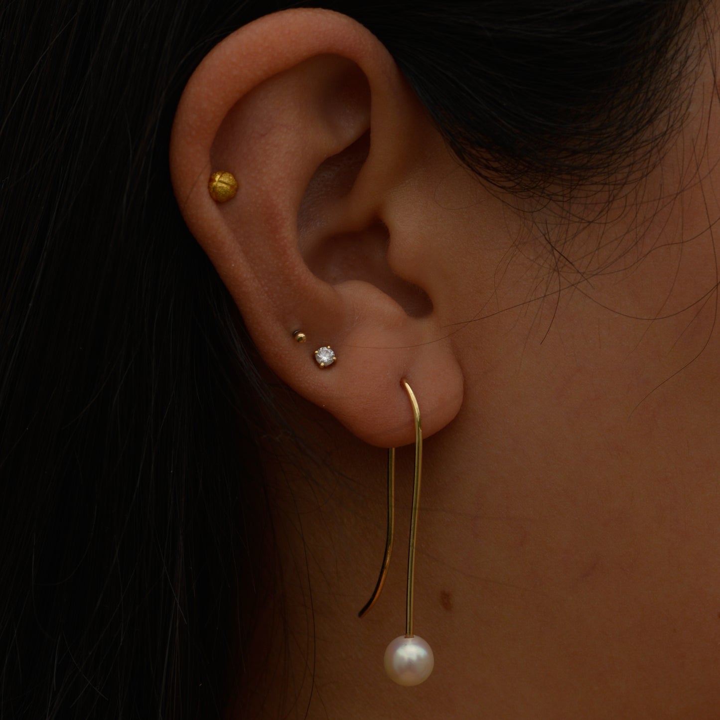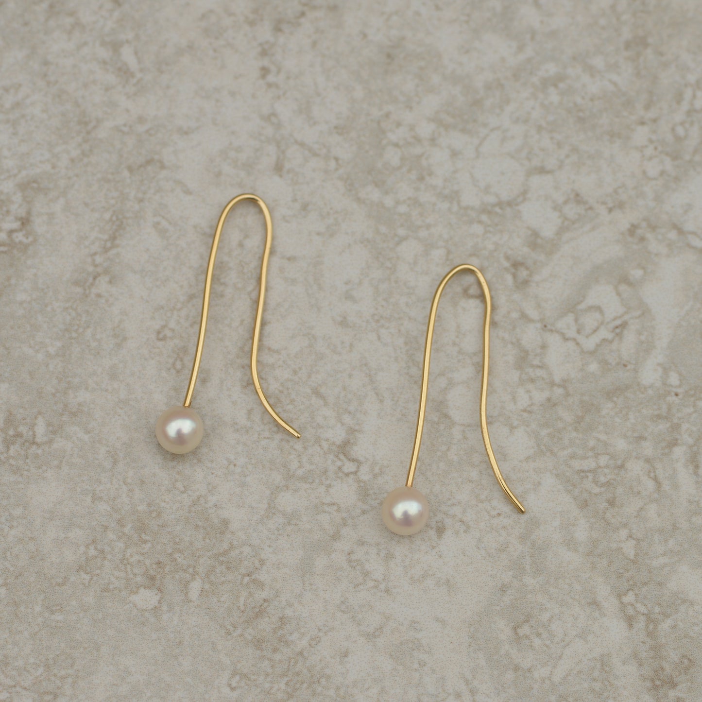 Drop earrings with luminous round pearls at the bottom of gold hooks. 6.7 mm diameter pearls.