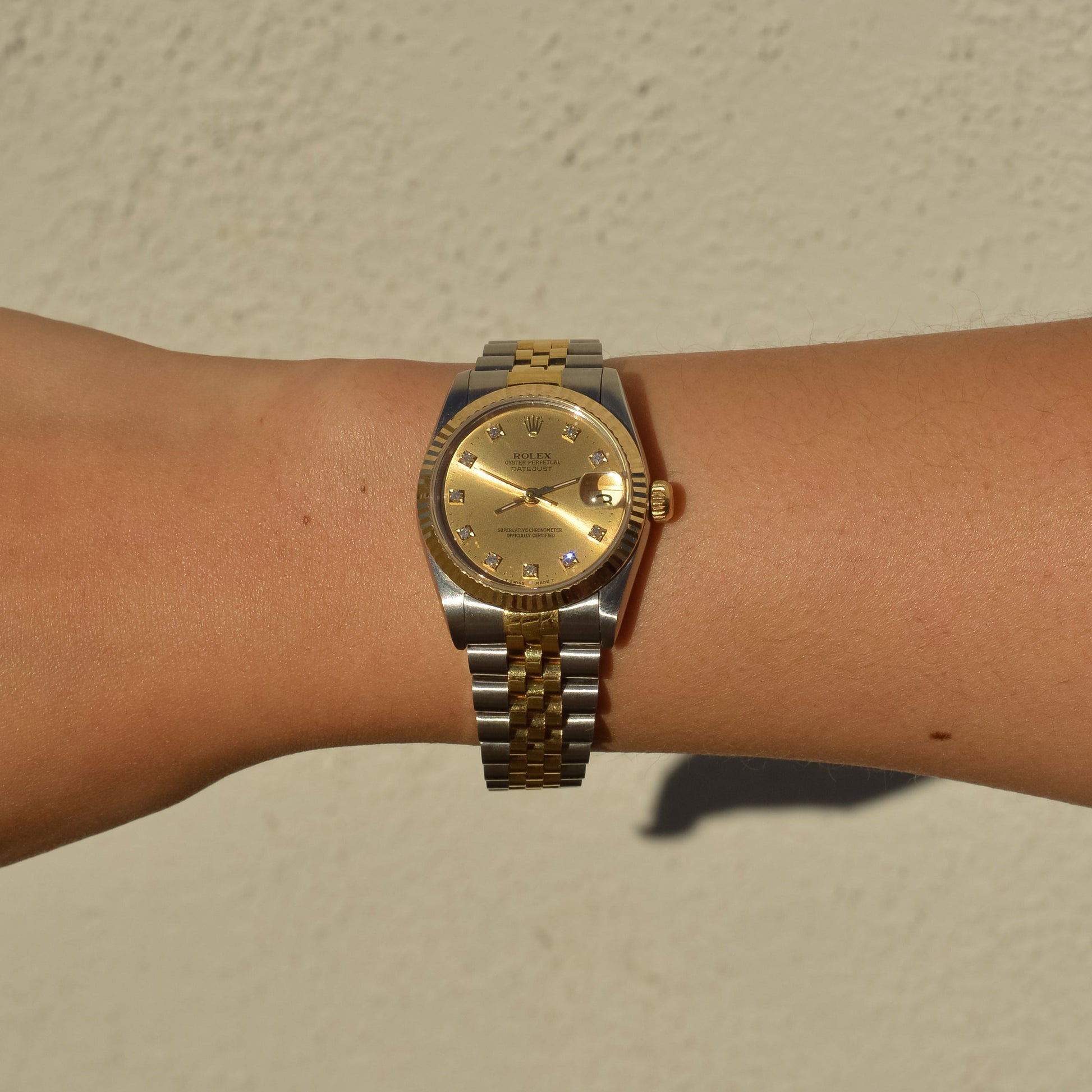 Featuring the emblematic fluted bezel in yellow gold, and a champagne dial beautifully set with diamonds by the factory. At the versatile 31 mm case size, this watch is a great entry point to the mid-range sizes. Perfect for larger wrists that feel like full sizes are too overpowering, or want to stack with bracelets; or for smaller wrists looking for more wrist coverage than the small sizes offer.