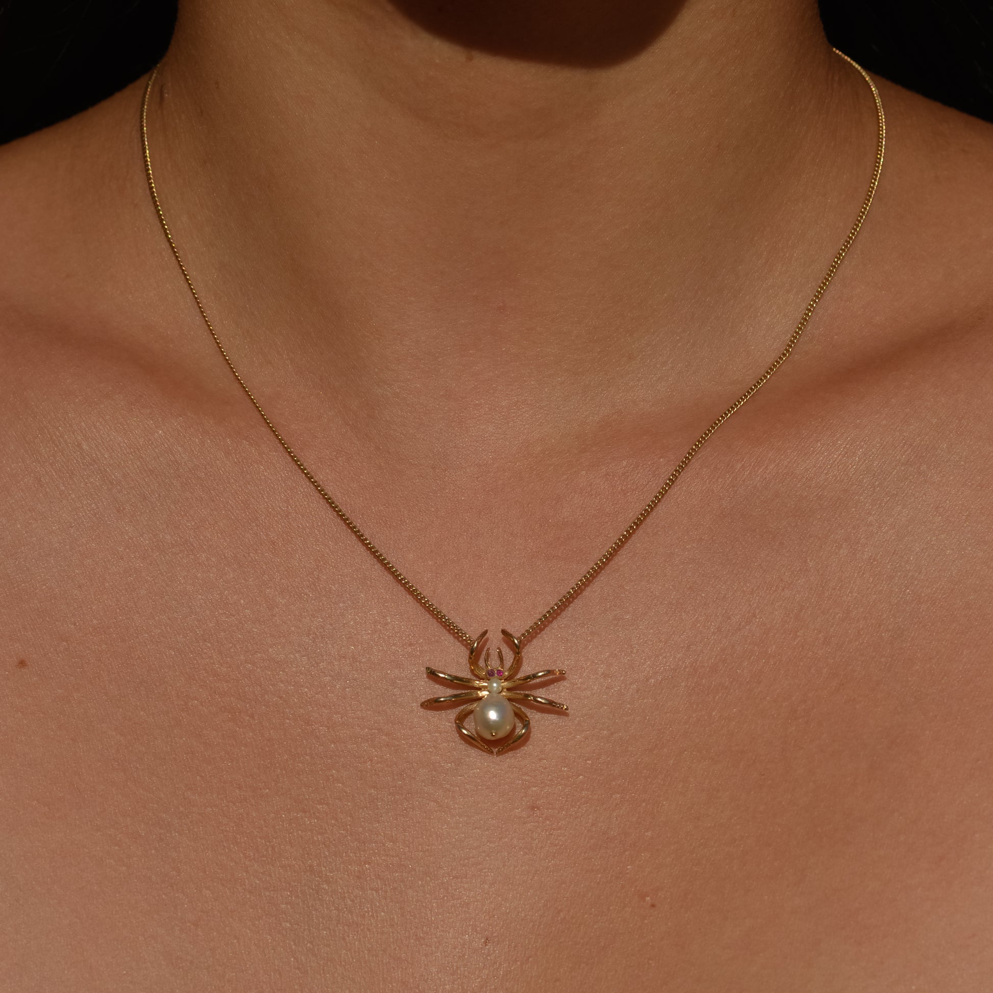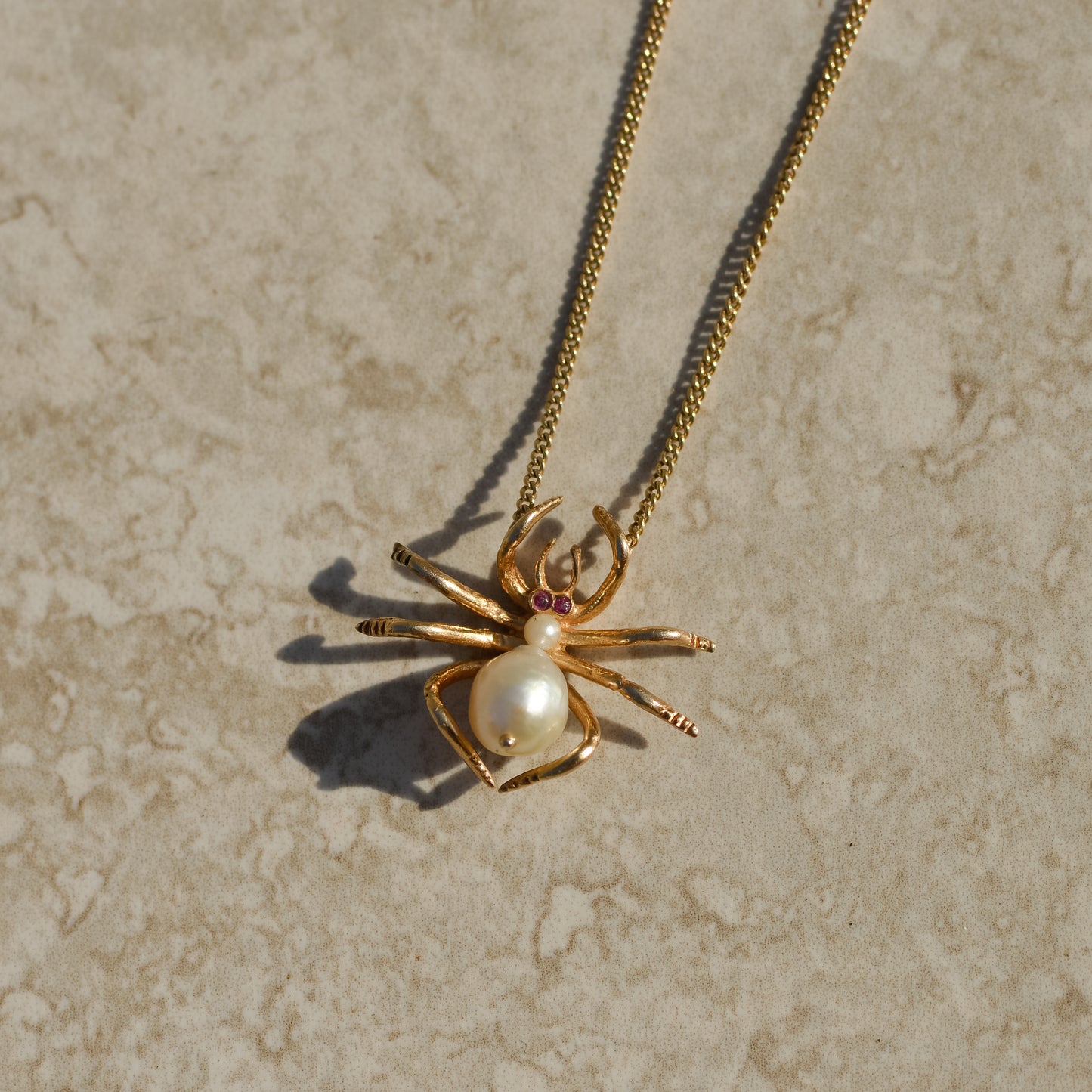 A vintage necklace that was made from a converted antique Victorian pin, with a smaller pearl and a large baroque pearl forming the spider's body, and two little ruby eyes.