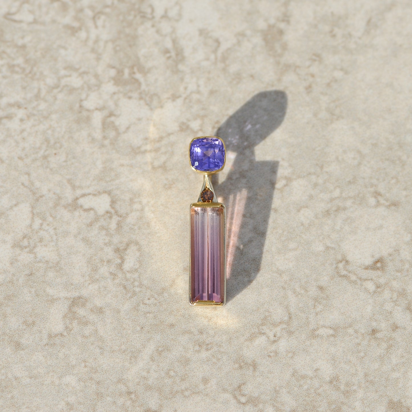 Slider pendant with a tanzanite and bicolor tourmaline. The tourmaline is a light orange-pink at the top of the stone and darker rose pink at the bottom, a unique natural characteristic that occurs when conditions in the earth change during the gemstone's growth process. A perfect pairing with the tanzanite, which exhibits blue or purple colors depending on the angle. Approximately 2.1 carats tourmaline.